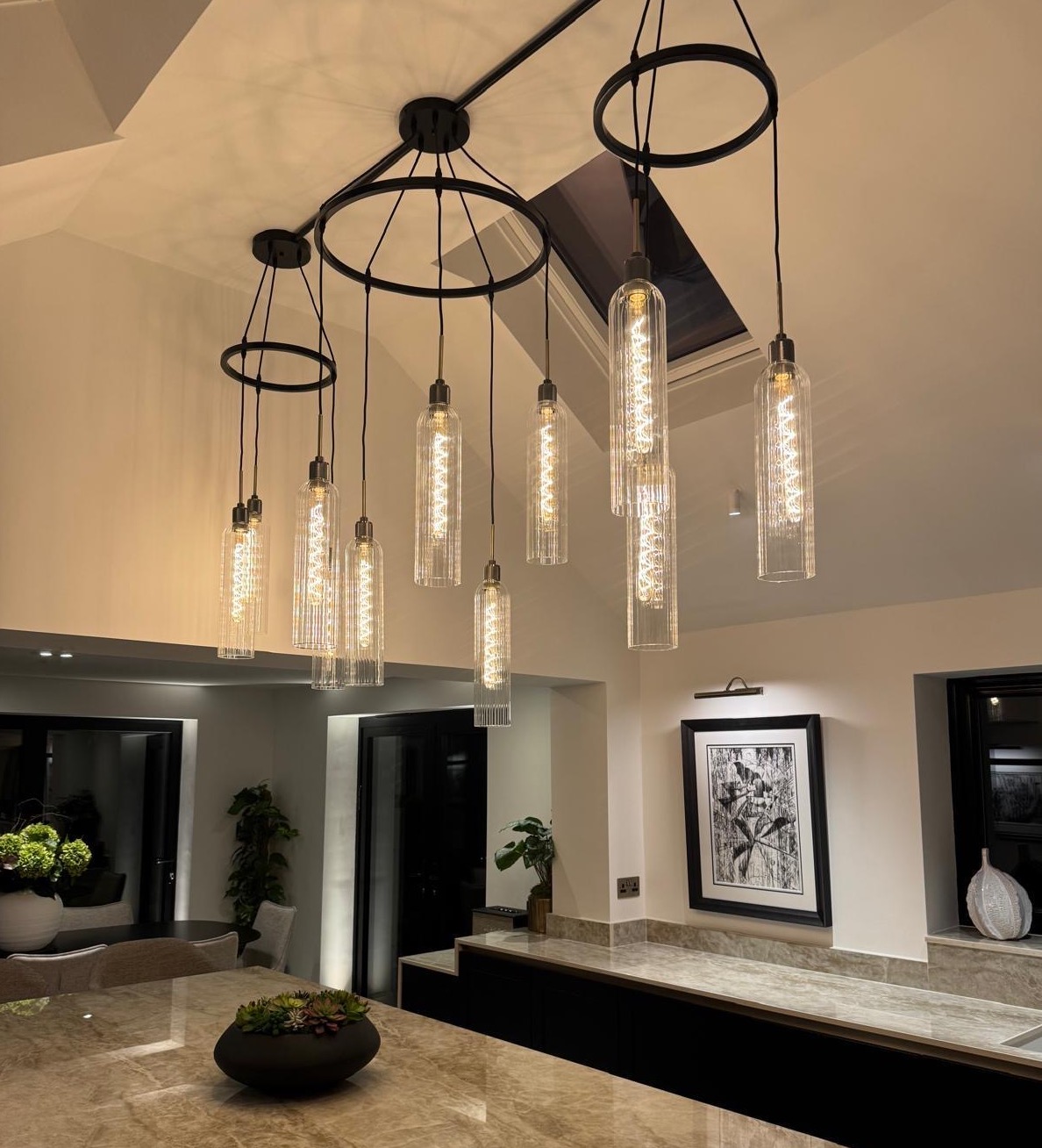 Medium and large multi-drop fixtures for kitchens, dining tables, and living rooms