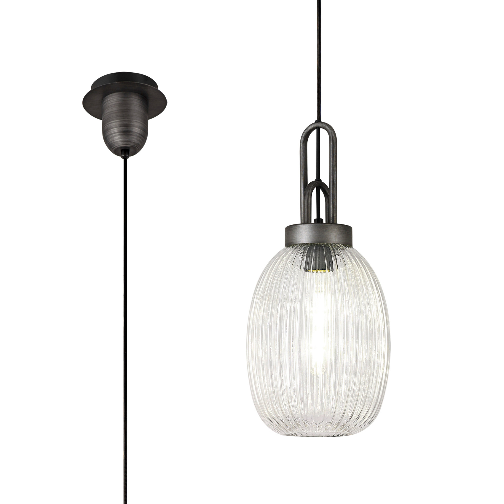 Idolite Camille 1 Light Pendant E27 20cm Almond Ribbed Glass, Clear Black/Aged Pewter | IDOK7650