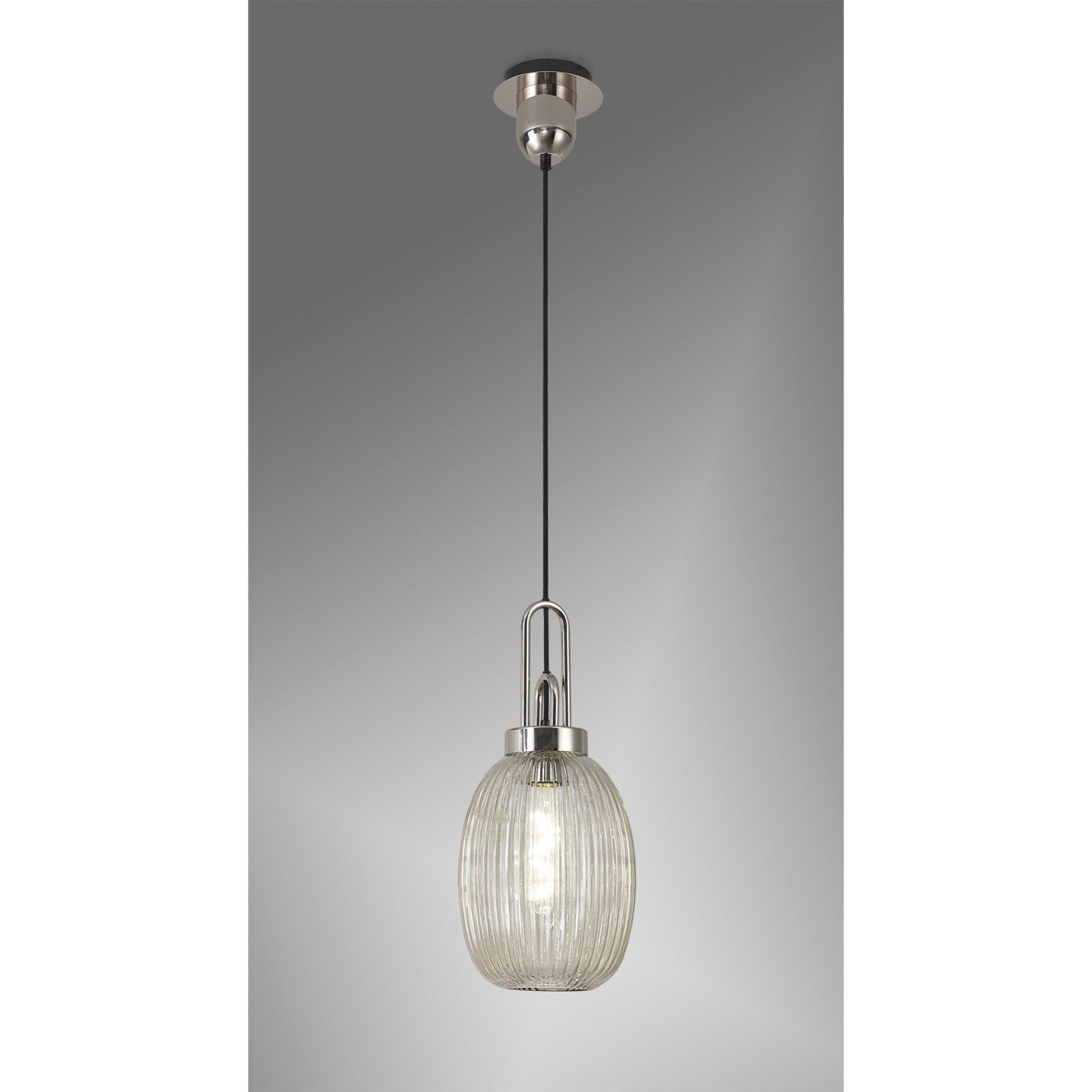 Introducing the Idolite Camille Polished Nickel Single Pendant Light, a perfect blend of sophisticated design and ambient lighting that adds an effortless touch of elegance to any room. Crafted with a polished nickel finish, this pendant light features a stunning champagne ribbed glass shade which casts a warm, diffused light, ideal for creating inviting and intimate spaces.