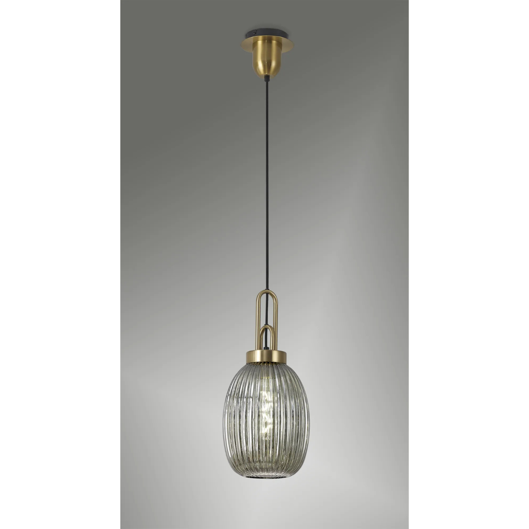 Idolite Camille 1 Light Pendant E27 With 20cm Almond Ribbed Glass, Smoked Brass Gold/Matt Black | IDOK6450