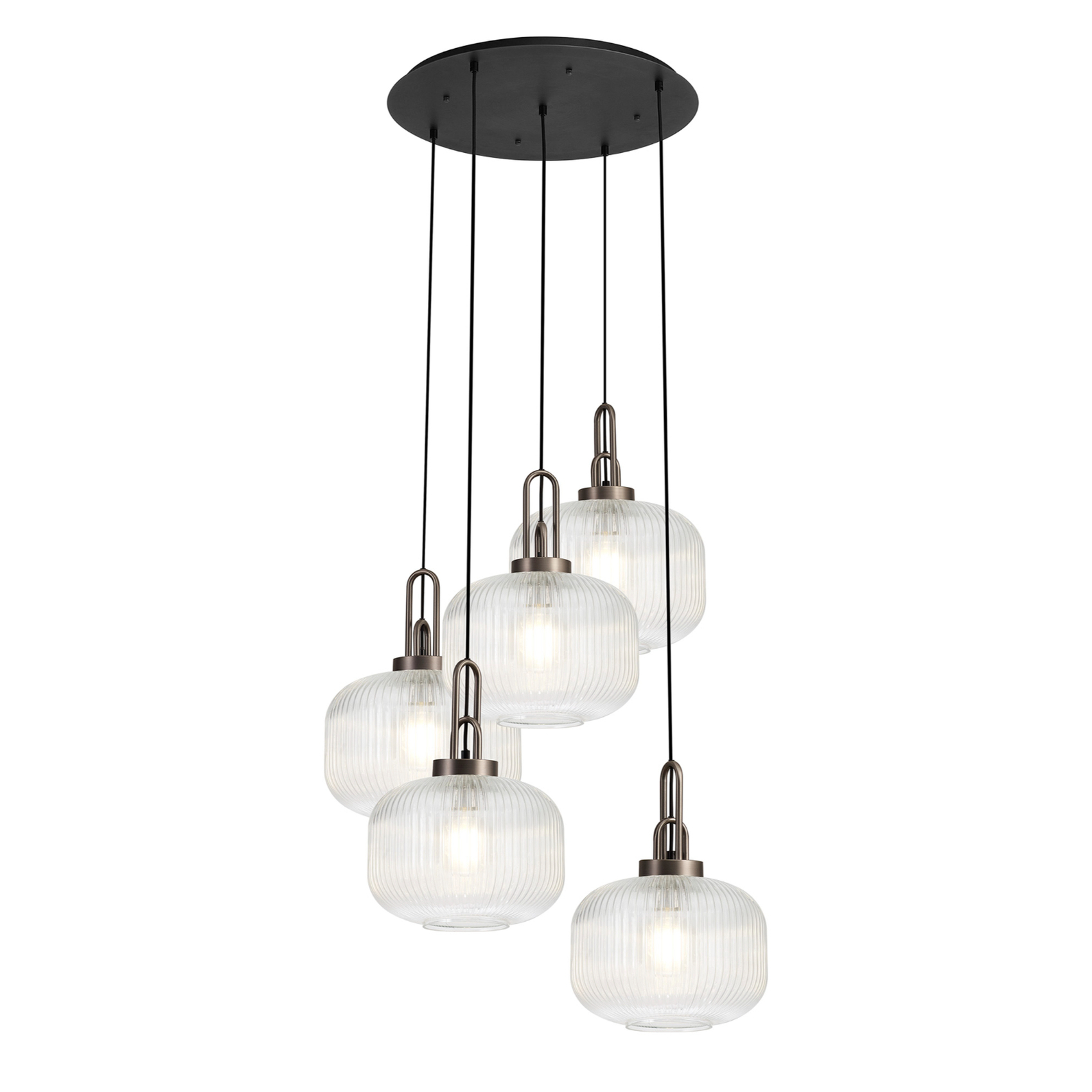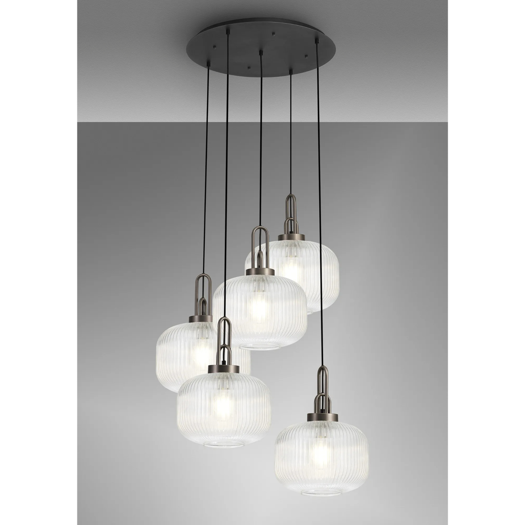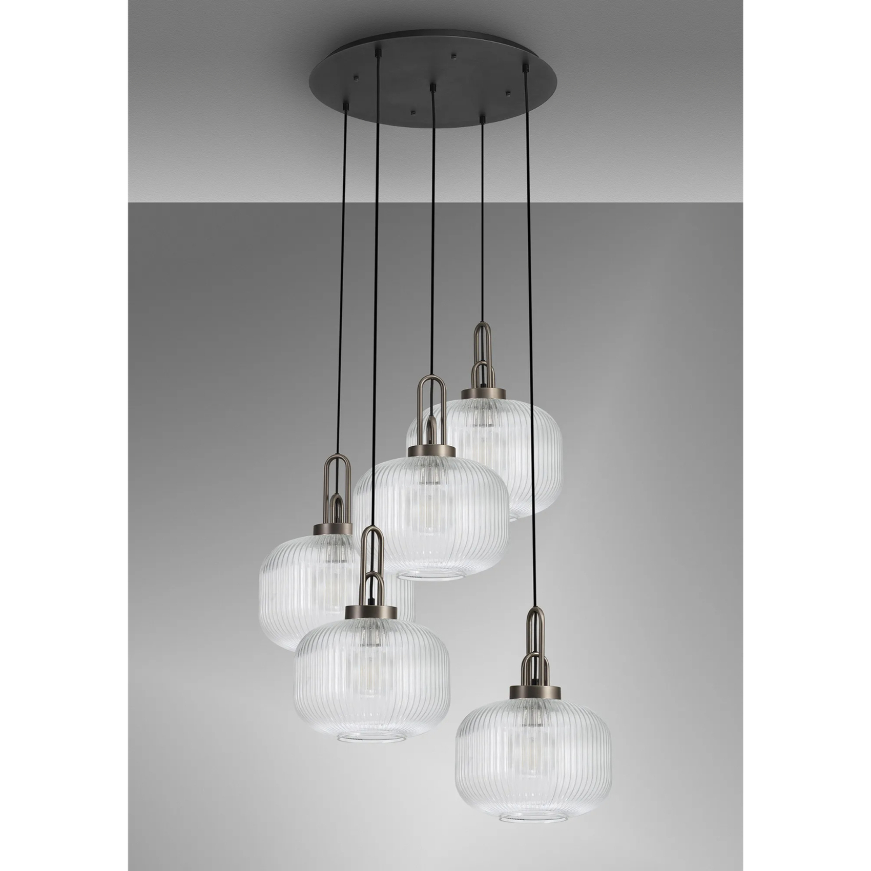 Idolite Camille 2.5m Round Pendant, 5 x E27, Antique Silver/Matt Black With 30cm Pumpkin Shaped Ribbed Clear Glass | IDOK7760