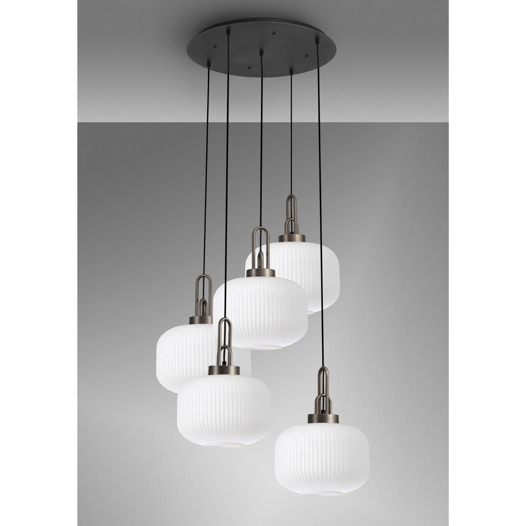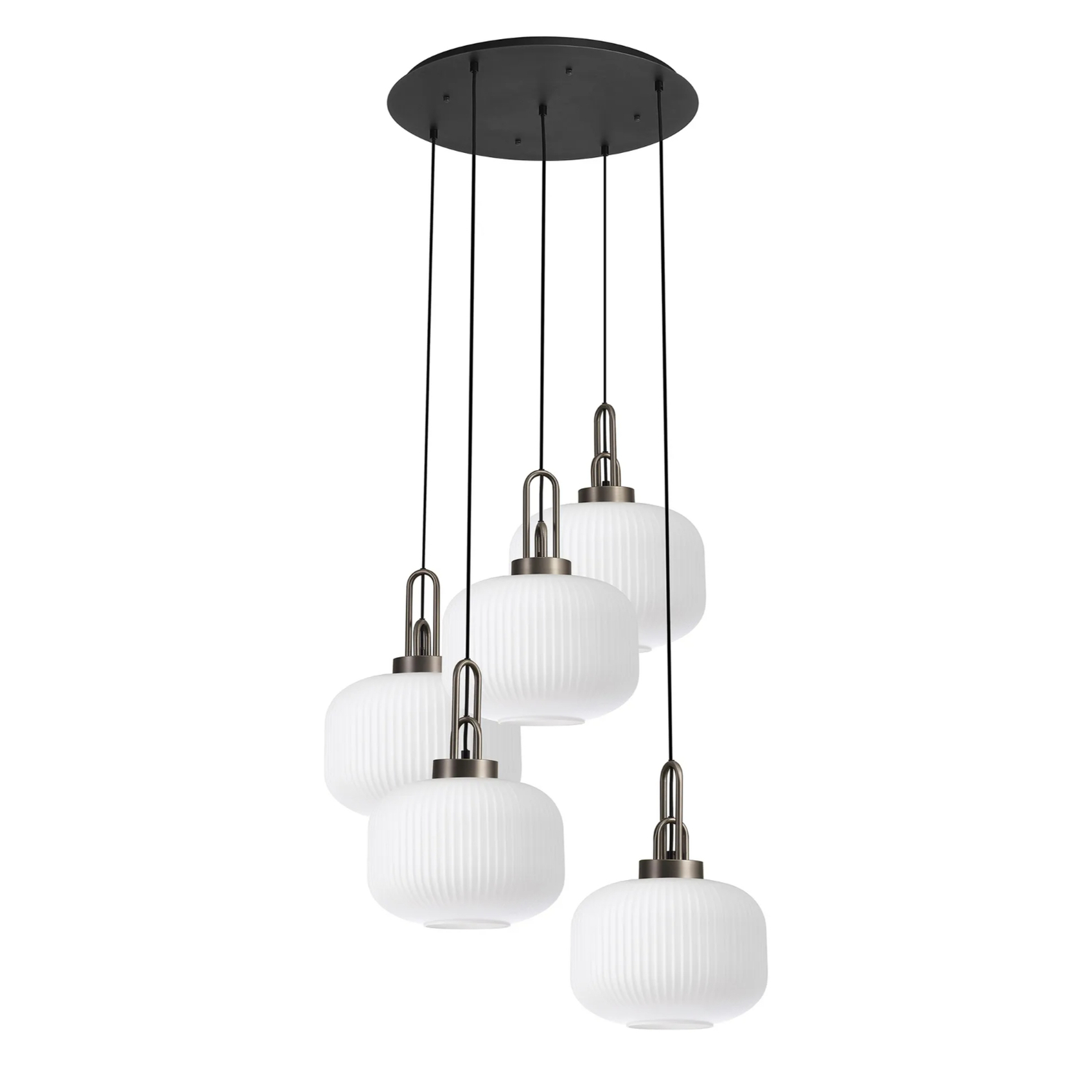 Idolite Camille 2.5m Round Pendant, 5 x E27, Antique Silver/Matt Black With 30cm Pumpkin Shaped Ribbed Opal Glass | IDOK6560