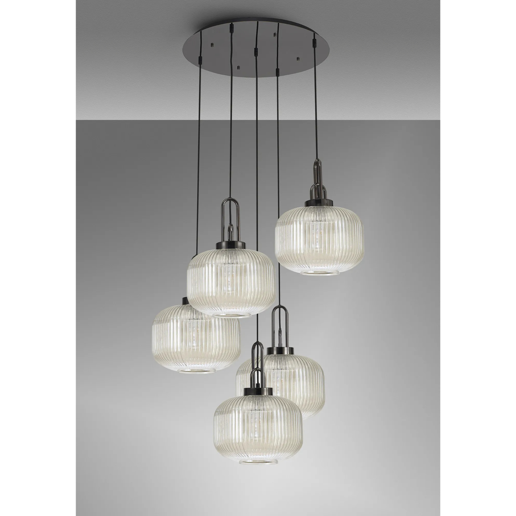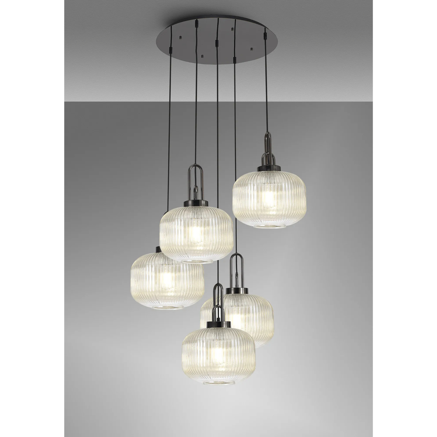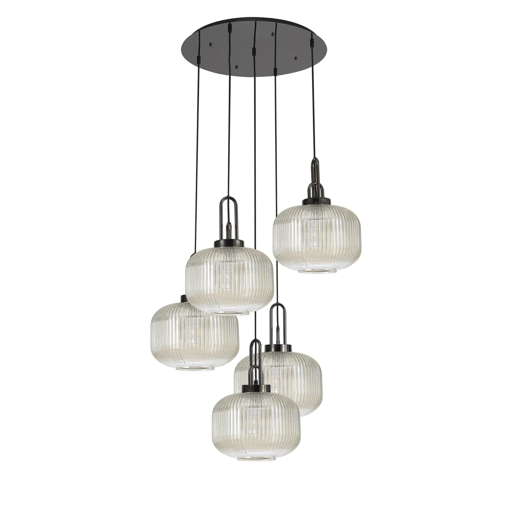 Idolite Camille 2.5m Round Pendant, 5 x E27, Black Chrome/Matt Black With 30cm Pumpkin Shaped Ribbed Champagne Glass | IDOK0170