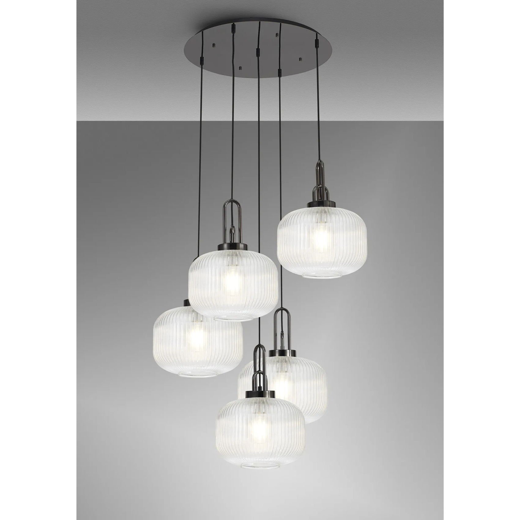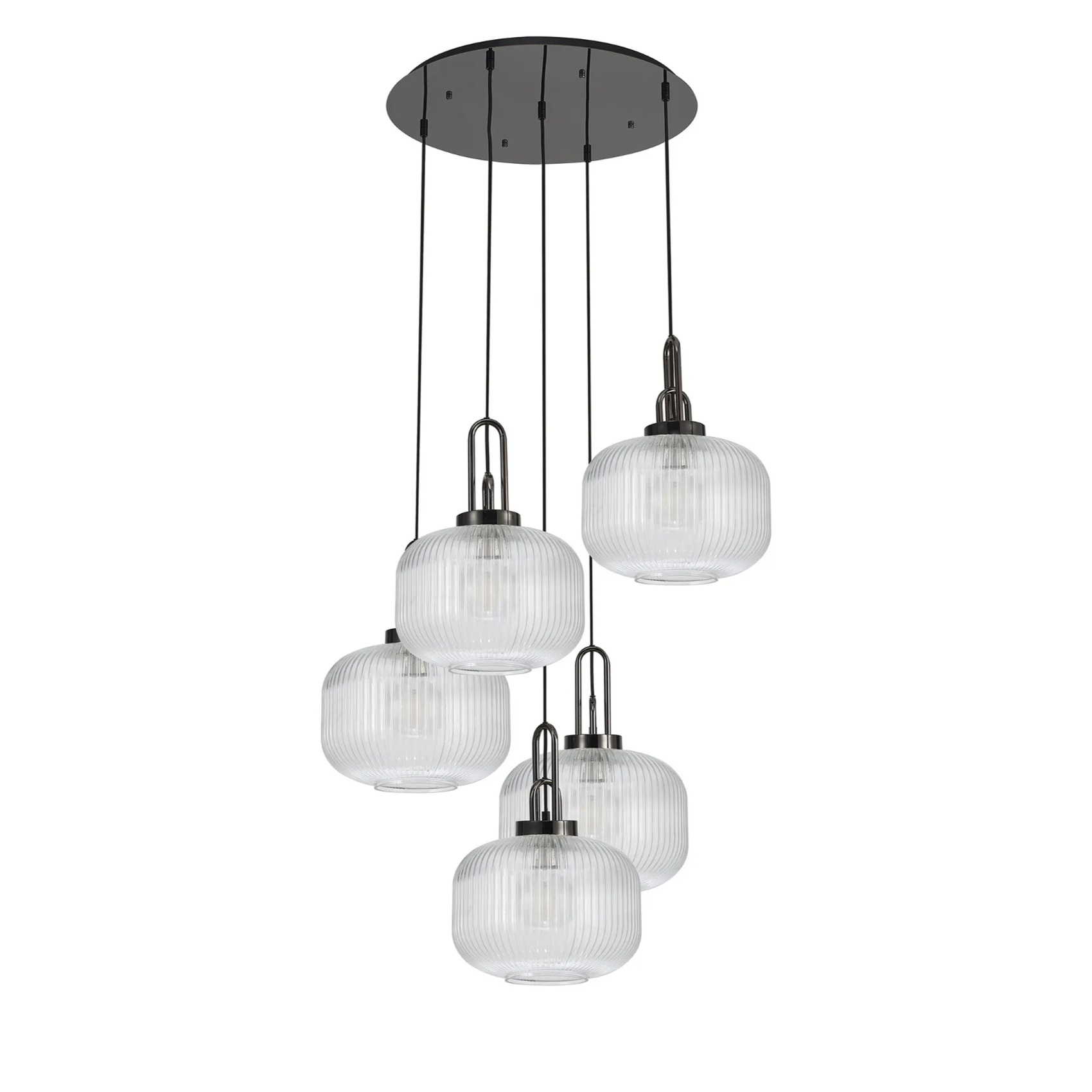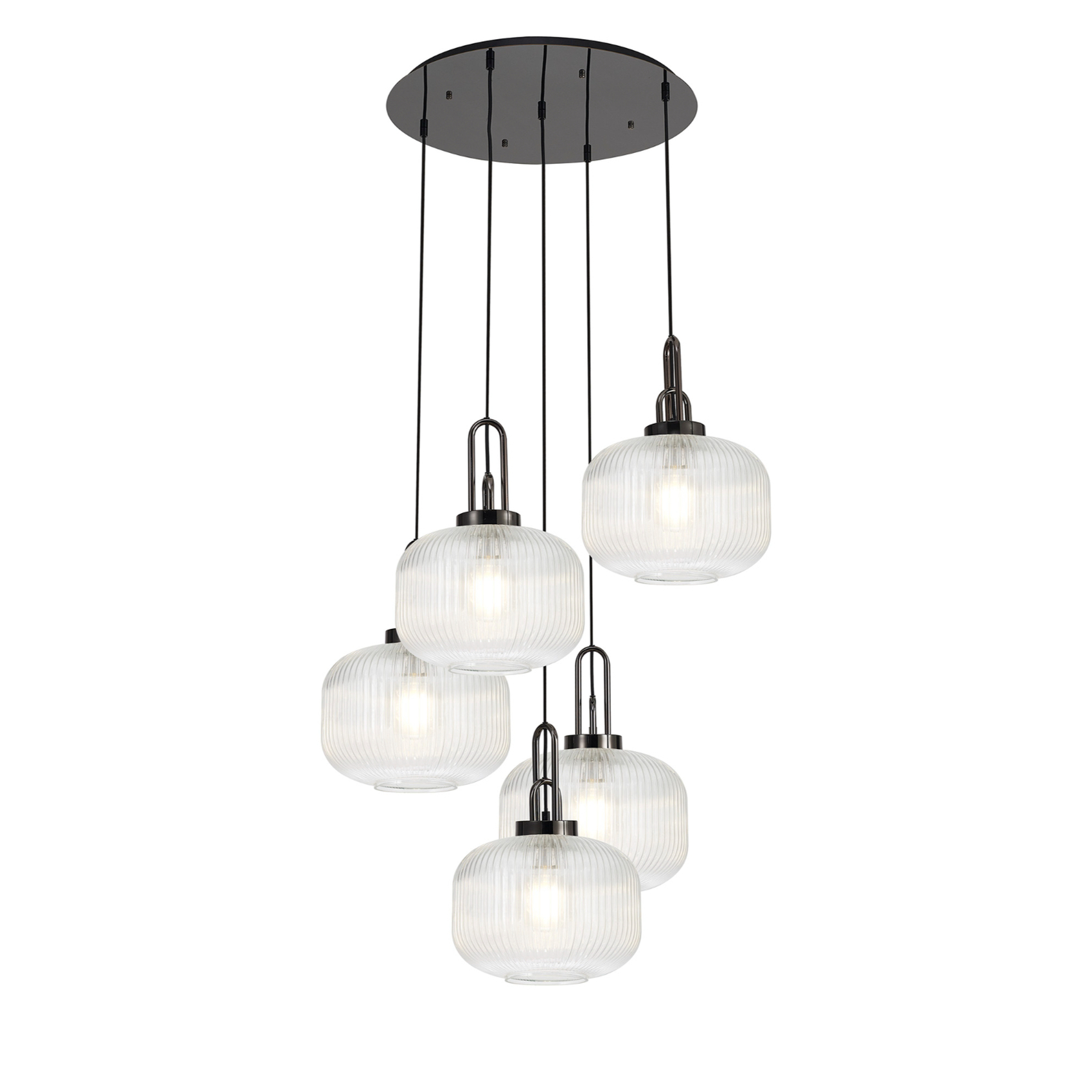 Idolite Camille 2.5m Round Pendant, 5 x E27, Black Chrome/Matt Black With 30cm Pumpkin Shaped Ribbed Clear Glass | IDOK1860