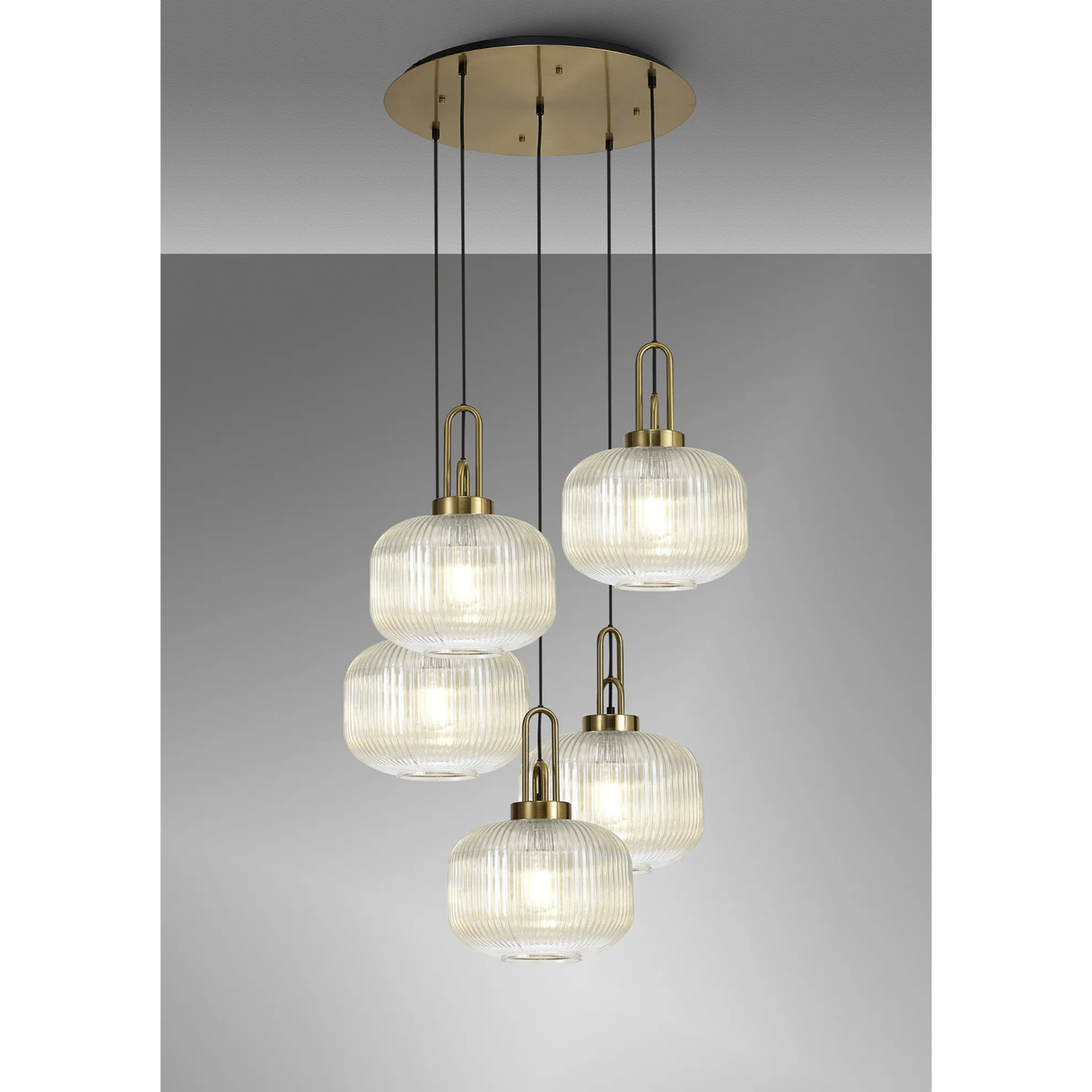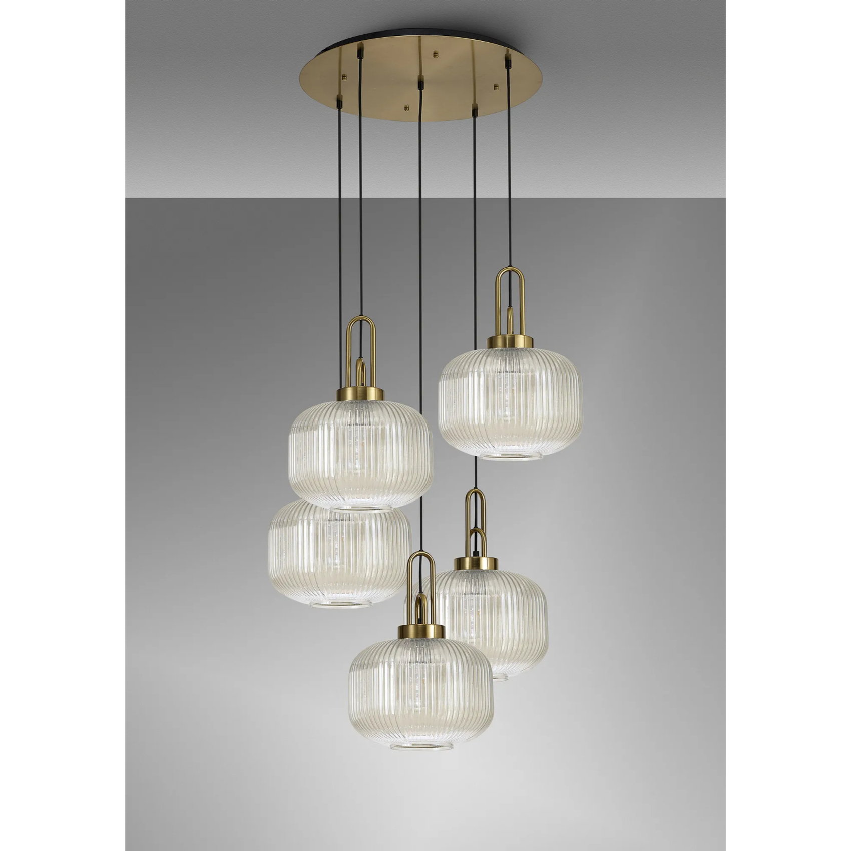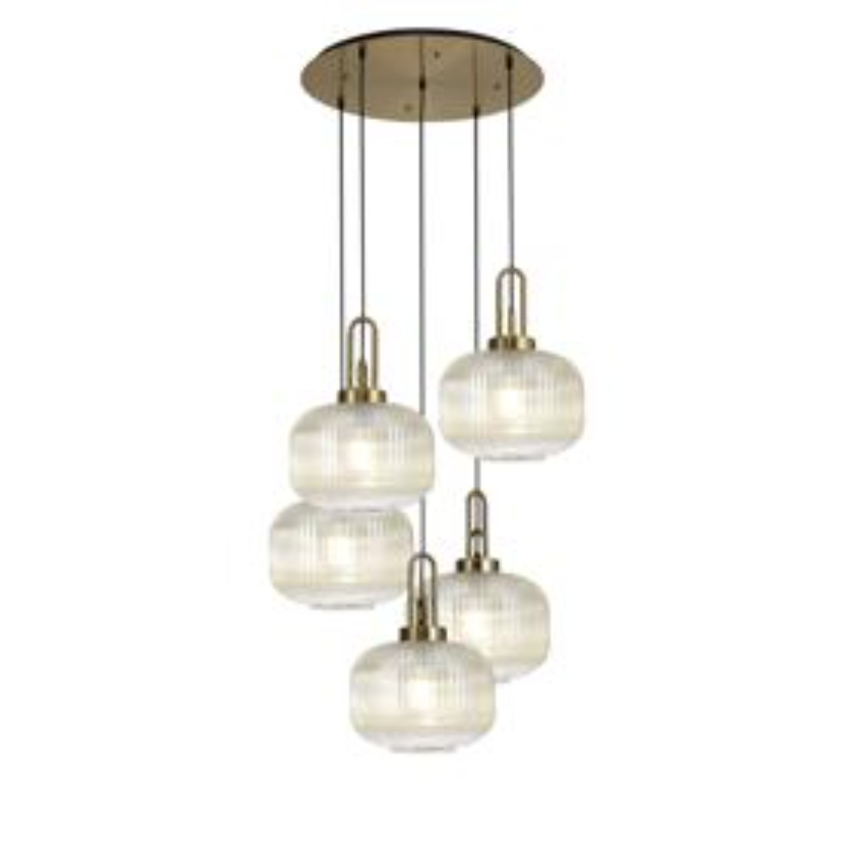 Idolite Camille 2.5m Round Pendant, 5 x E27, Brass Gold/Matt Black With 30cm Pumpkin Shaped Ribbed Champagne Glass | IDOK3170
