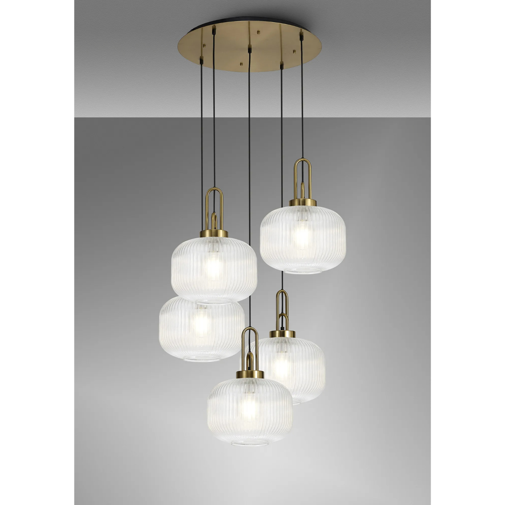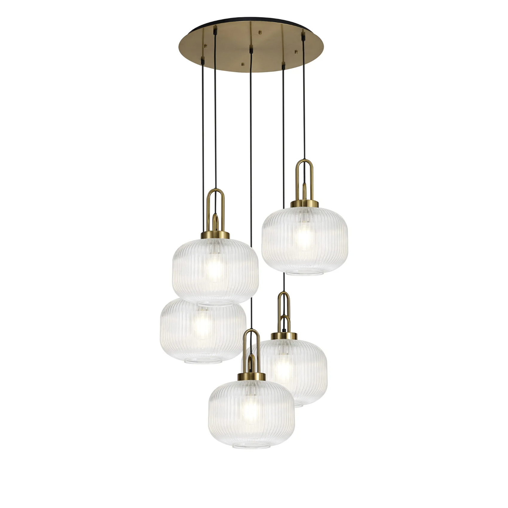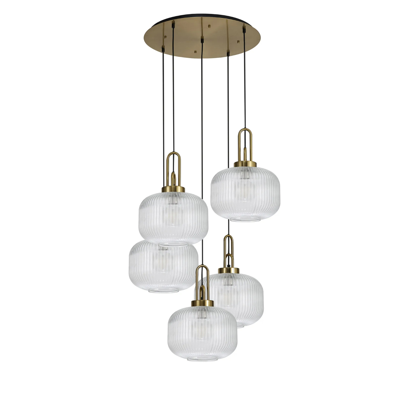 Idolite Camille 2.5m Round Pendant, 5 x E27, Brass Gold/Matt Black With 30cm Pumpkin Shaped Ribbed Clear Glass | IDOK4860