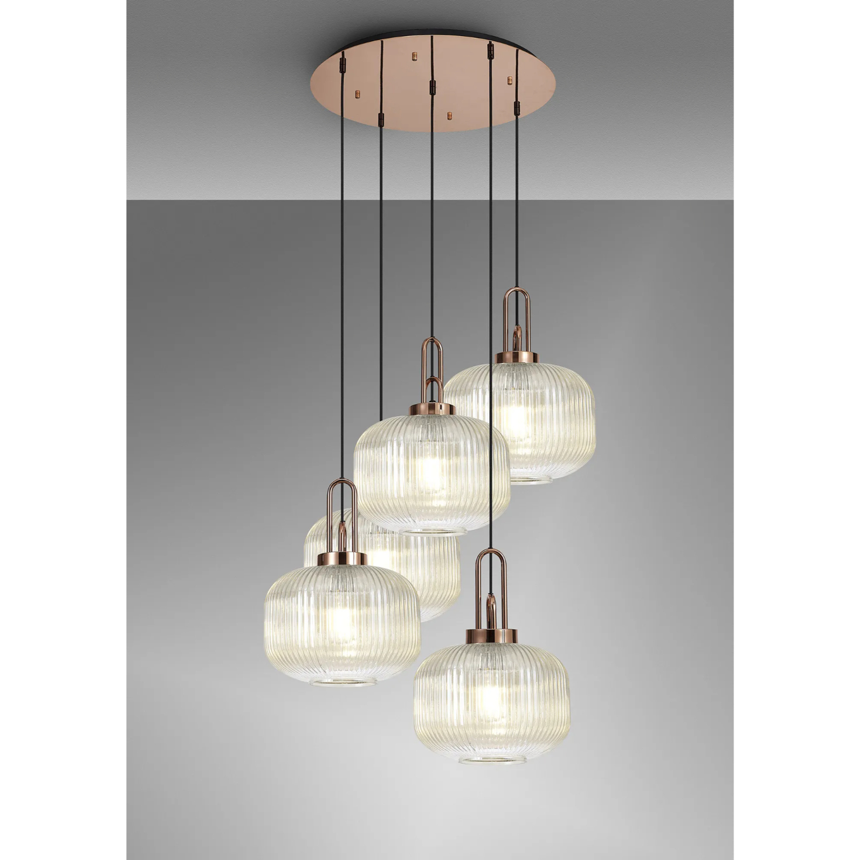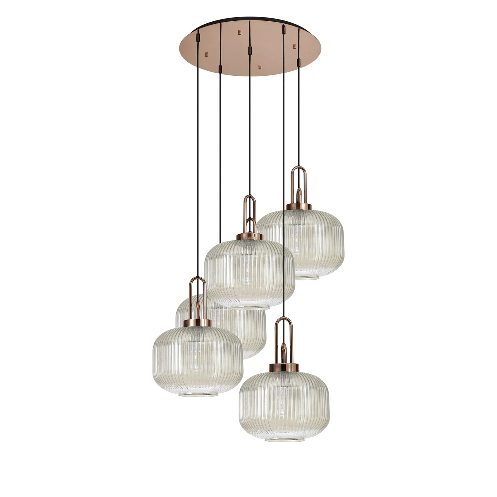 Idolite Camille 2.5m Round Pendant, 5 x E27, Copper/Matt Black With 30cm Pumpkin Shaped Ribbed Champagne Glass | IDOK6170