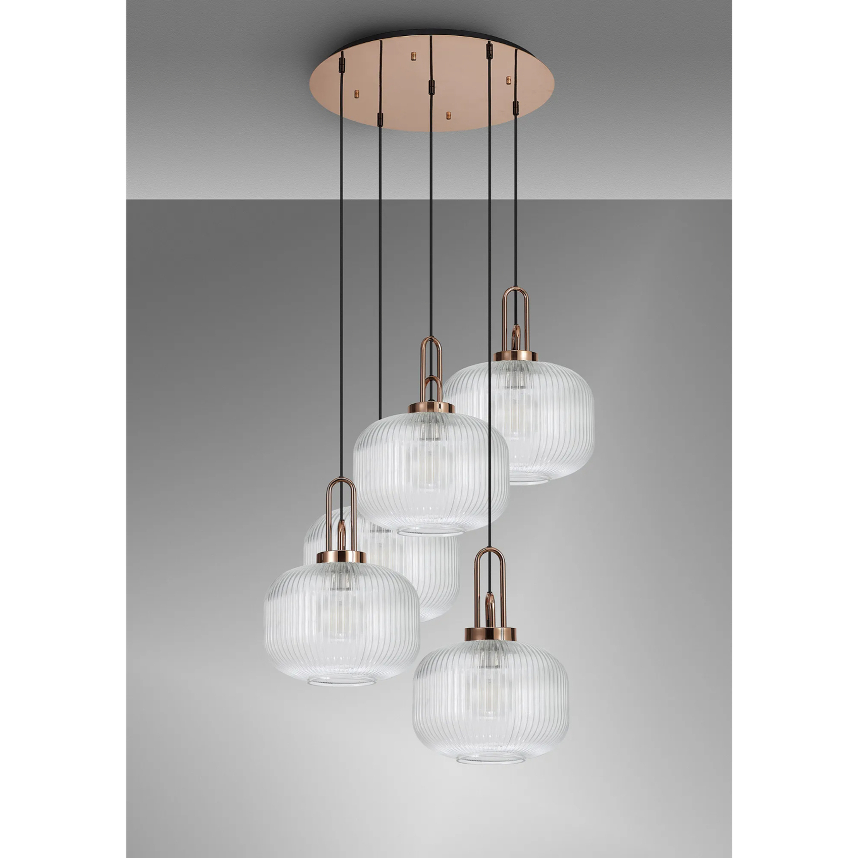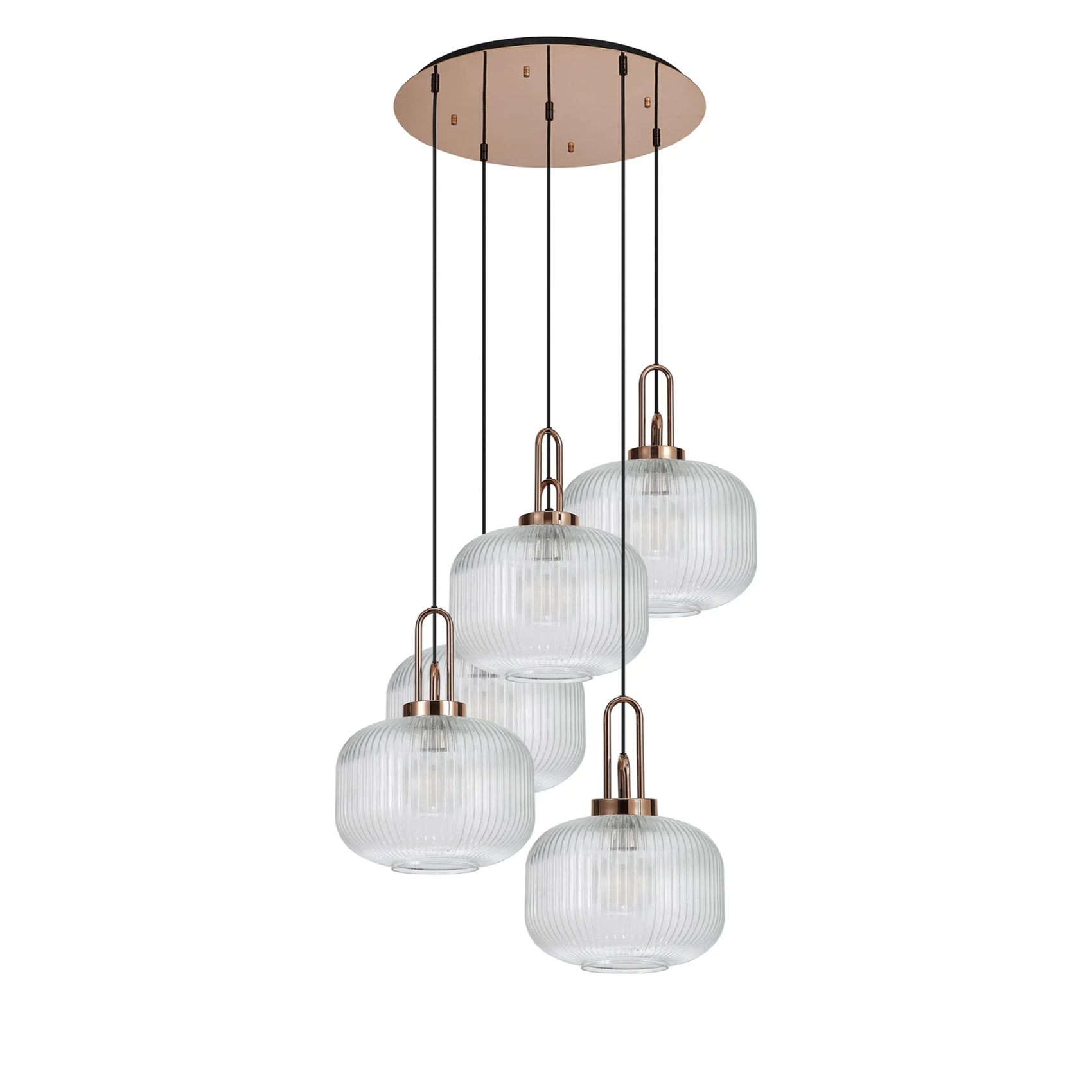 Idolite Camille 2.5m Round Pendant, 5 x E27, Copper/Matt Black With 30cm Pumpkin Shaped Ribbed Clear Glass | IDOK7860