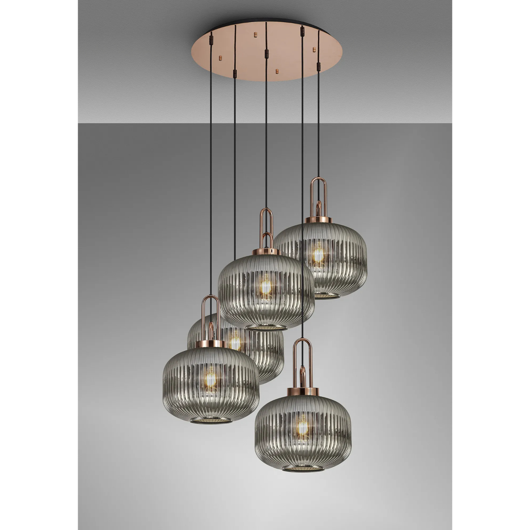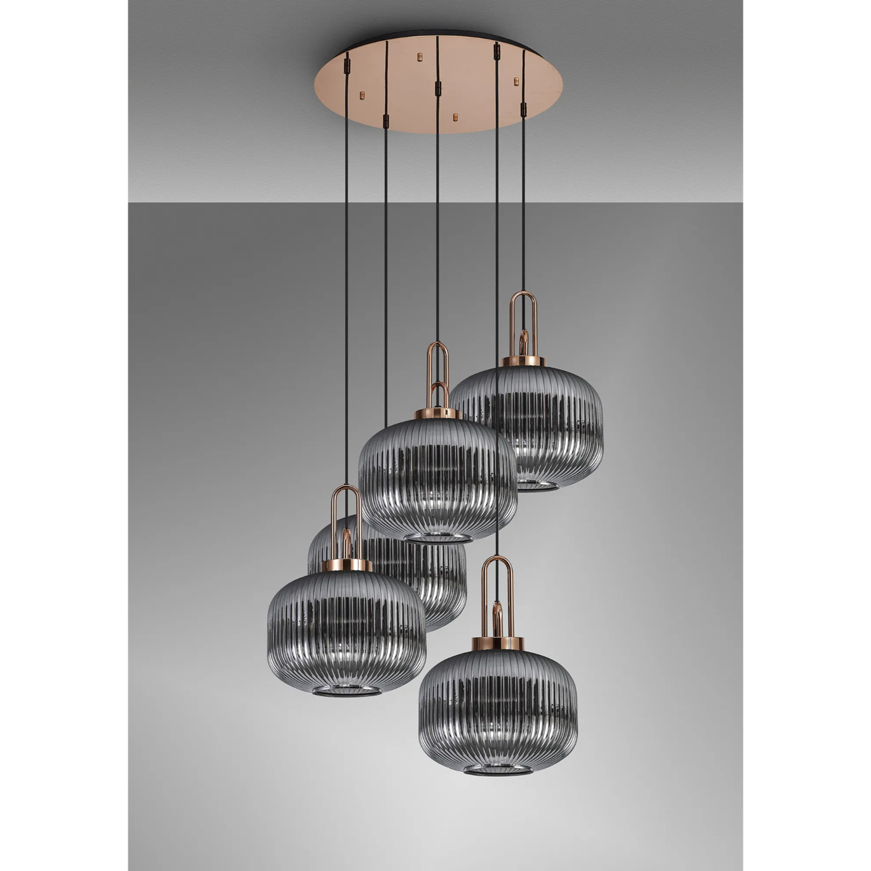 Idolite Camille 2.5m Round Pendant, 5 x E27, Copper/Matt Black With 30cm Pumpkin Shaped Ribbed Smoked Glass | IDOK8960