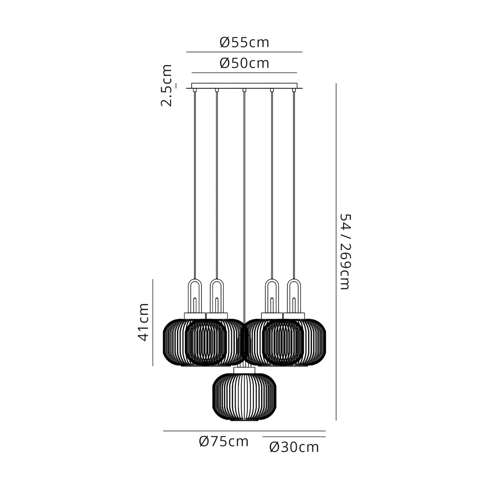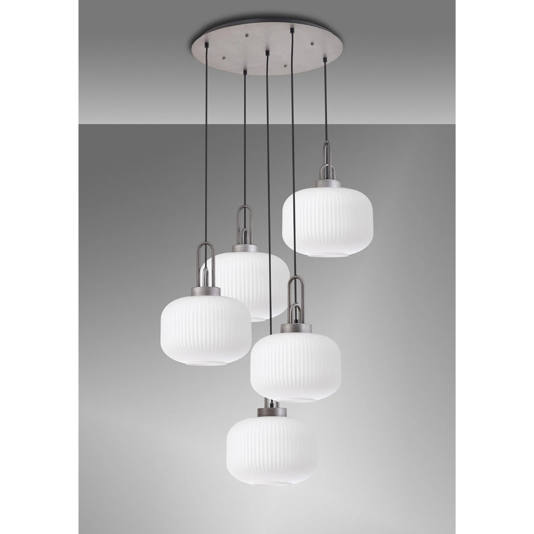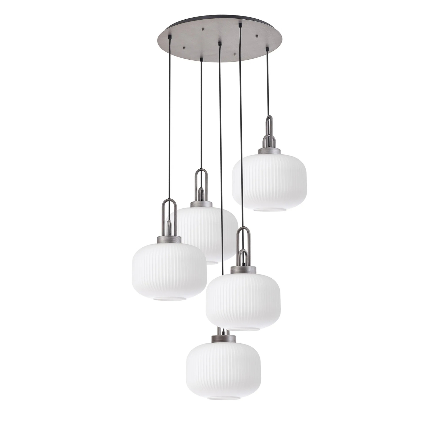 Idolite Camille 2.5m Round Pendant, 5 x E27, Pewter/Matt Black With 30cm Pumpkin Shaped Ribbed Opal Glass | IDOK2560
