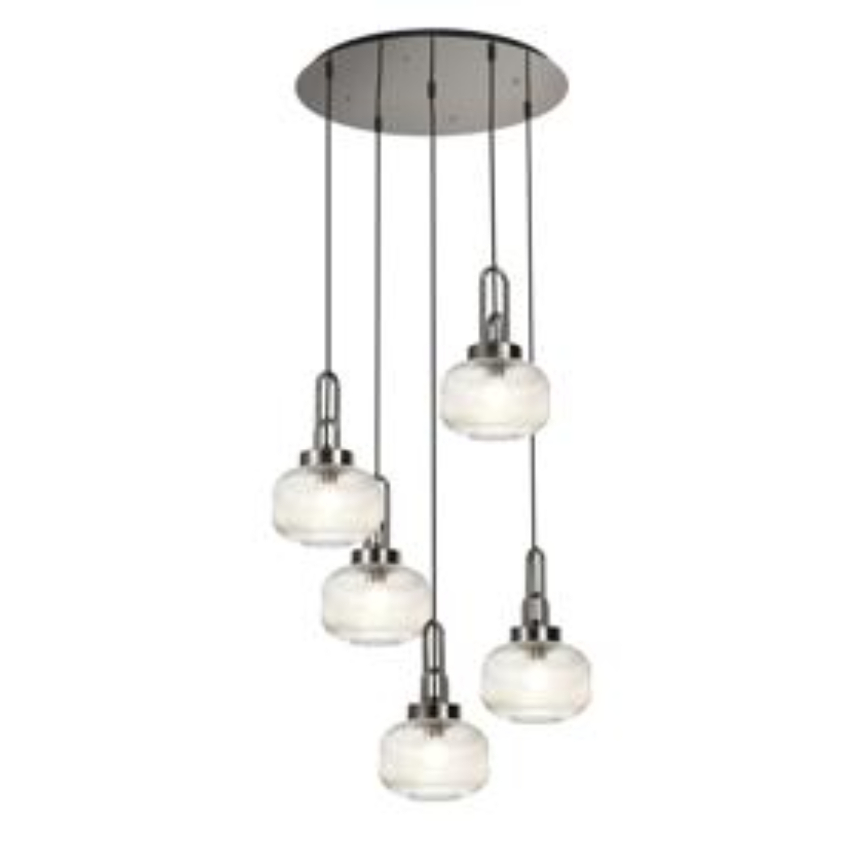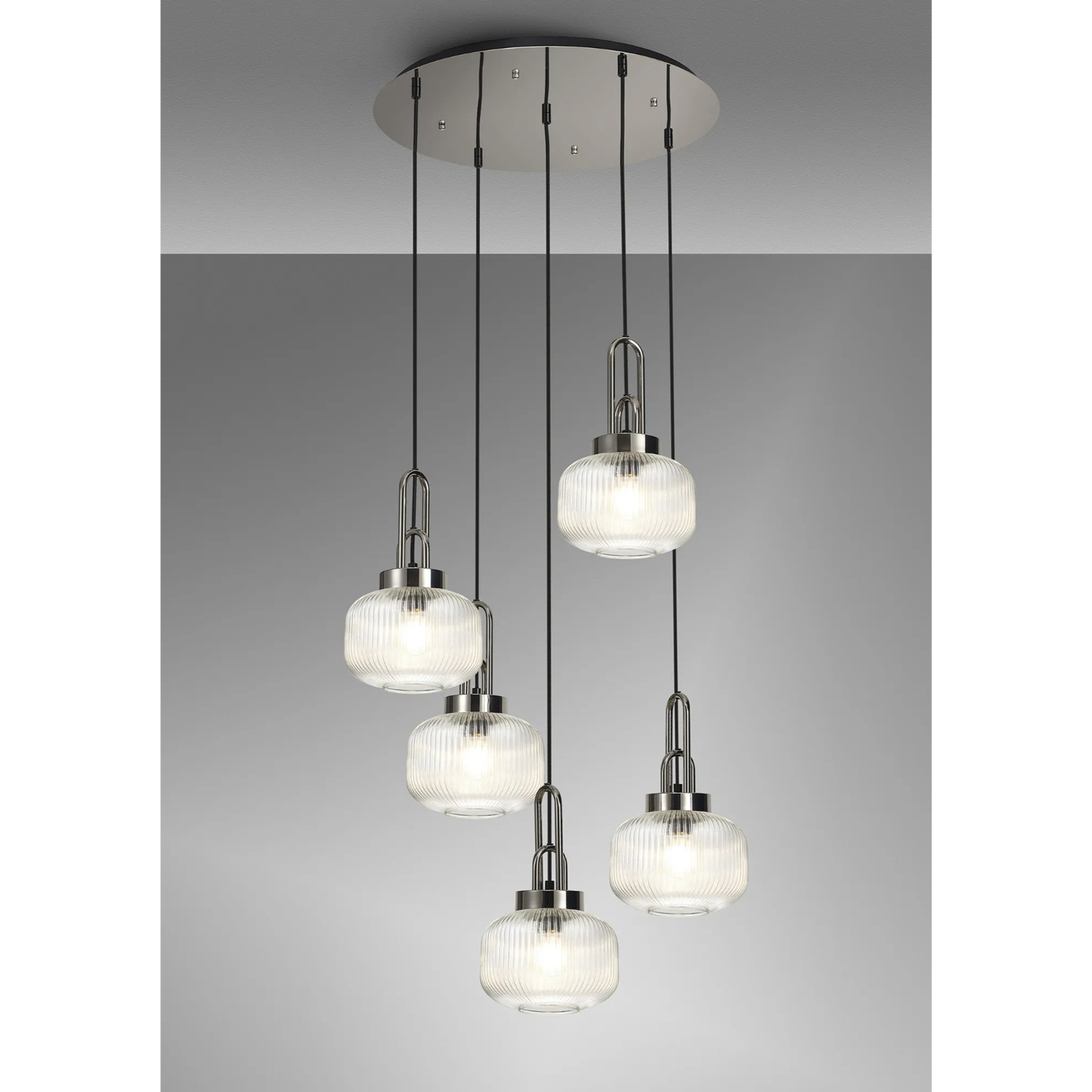 Idolite Camille 2.5m Round Pendant, 5 x E27, Polished Nickel/Matt Black With 20cm Pumpkin Shaped Ribbed Clear Glass | IDOK7741