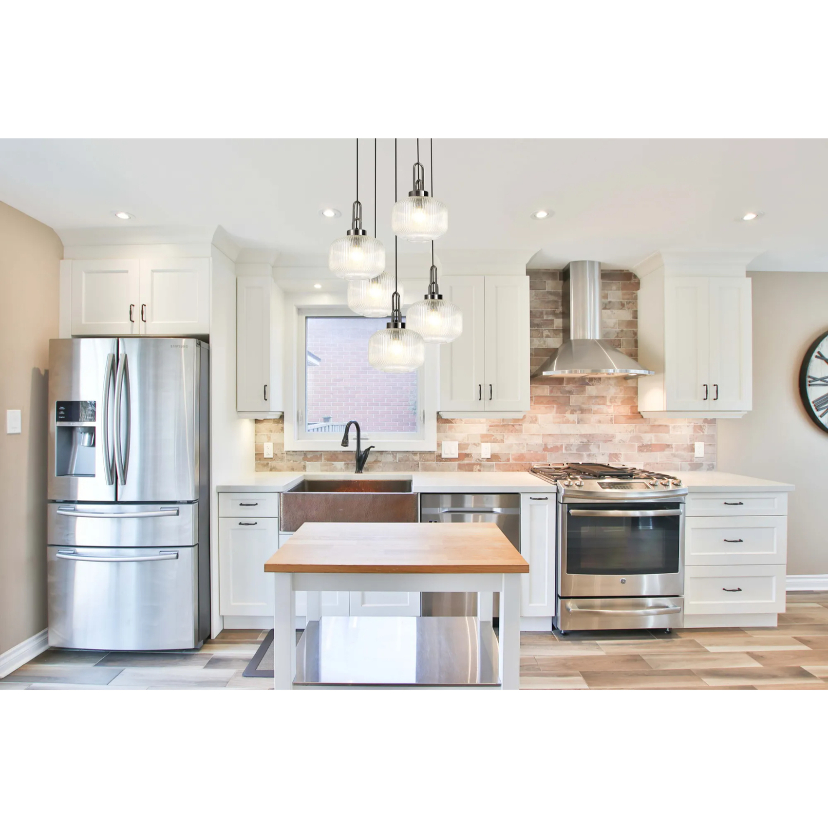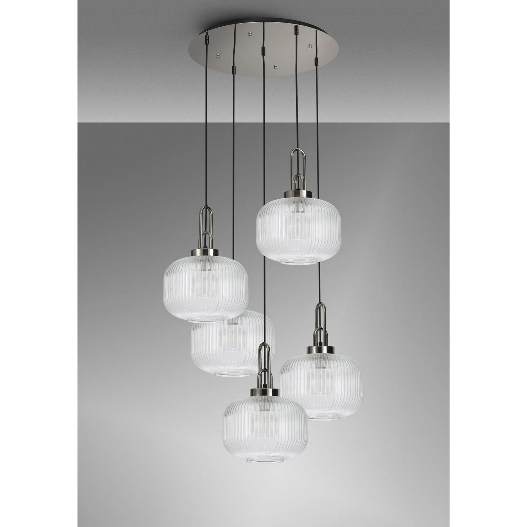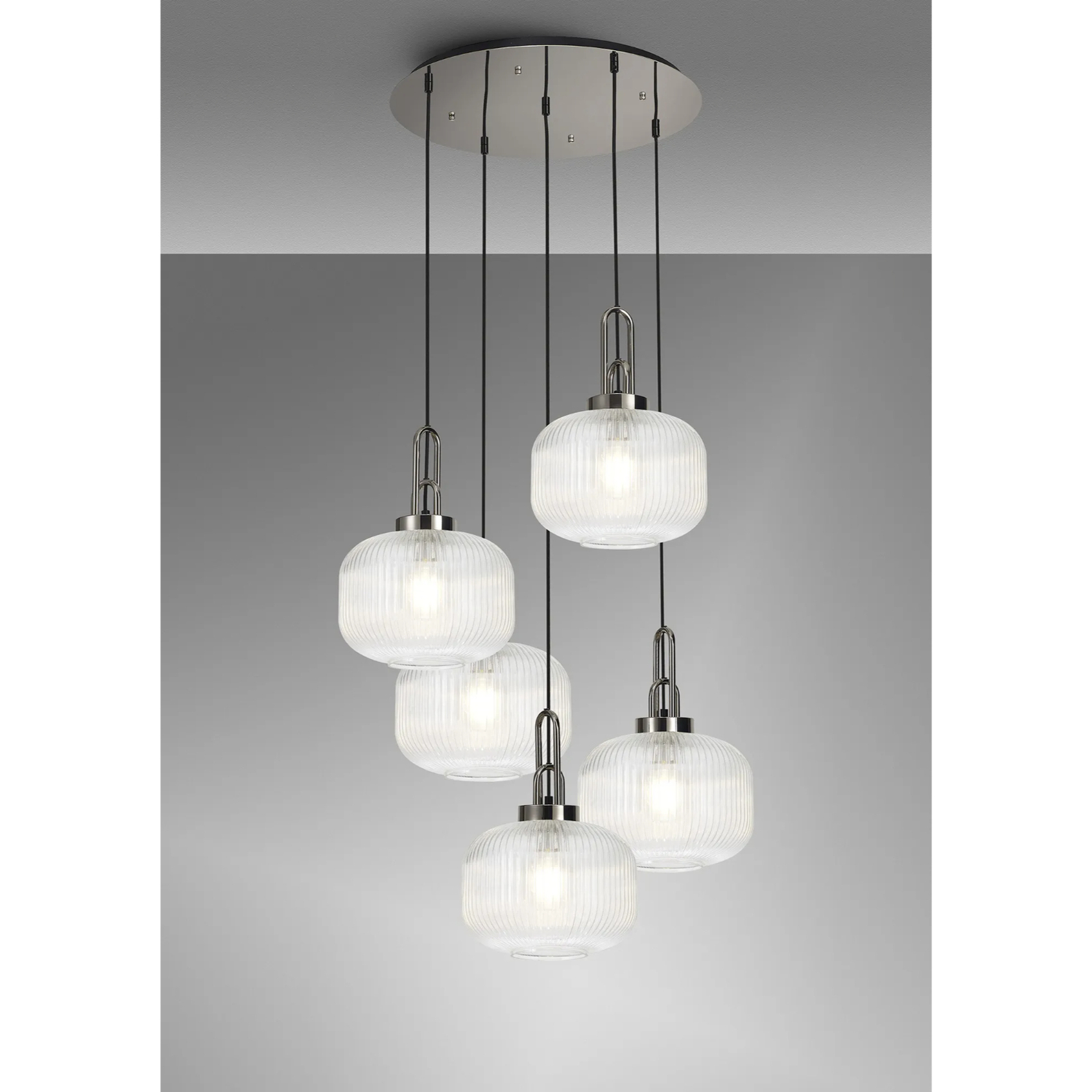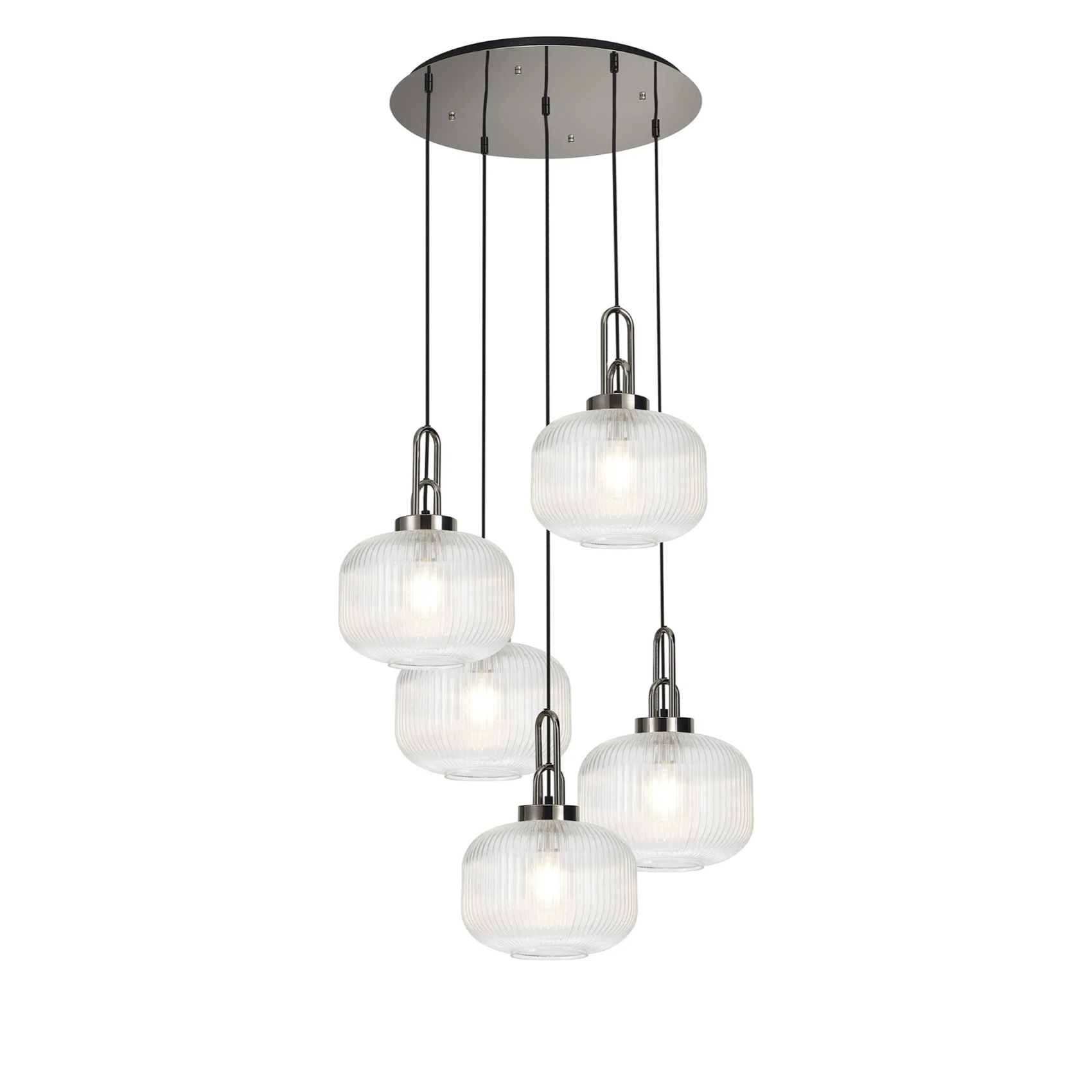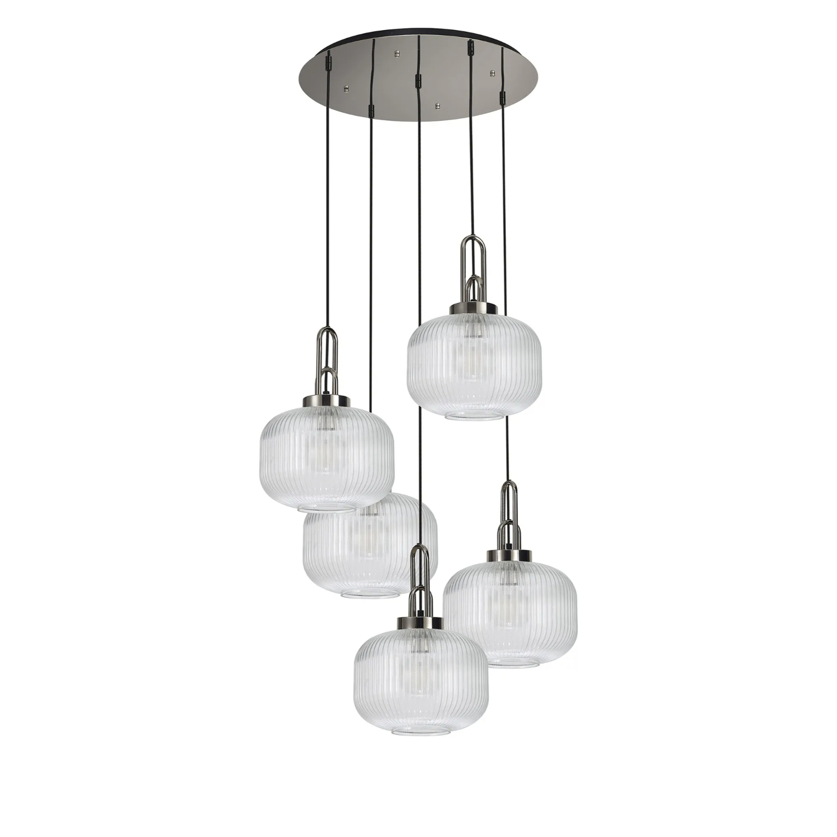 Idolite Camille 2.5m Round Pendant, 5 x E27, Polished Nickel/Matt Black With 30cm Pumpkin Shaped Ribbed Clear Glass | IDOK0960