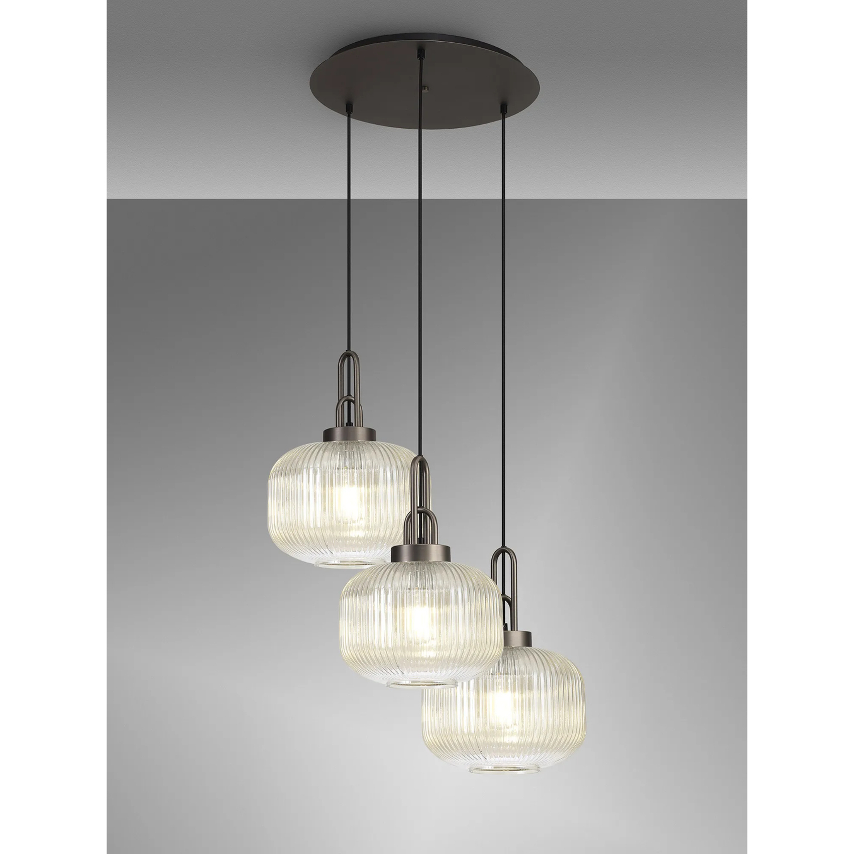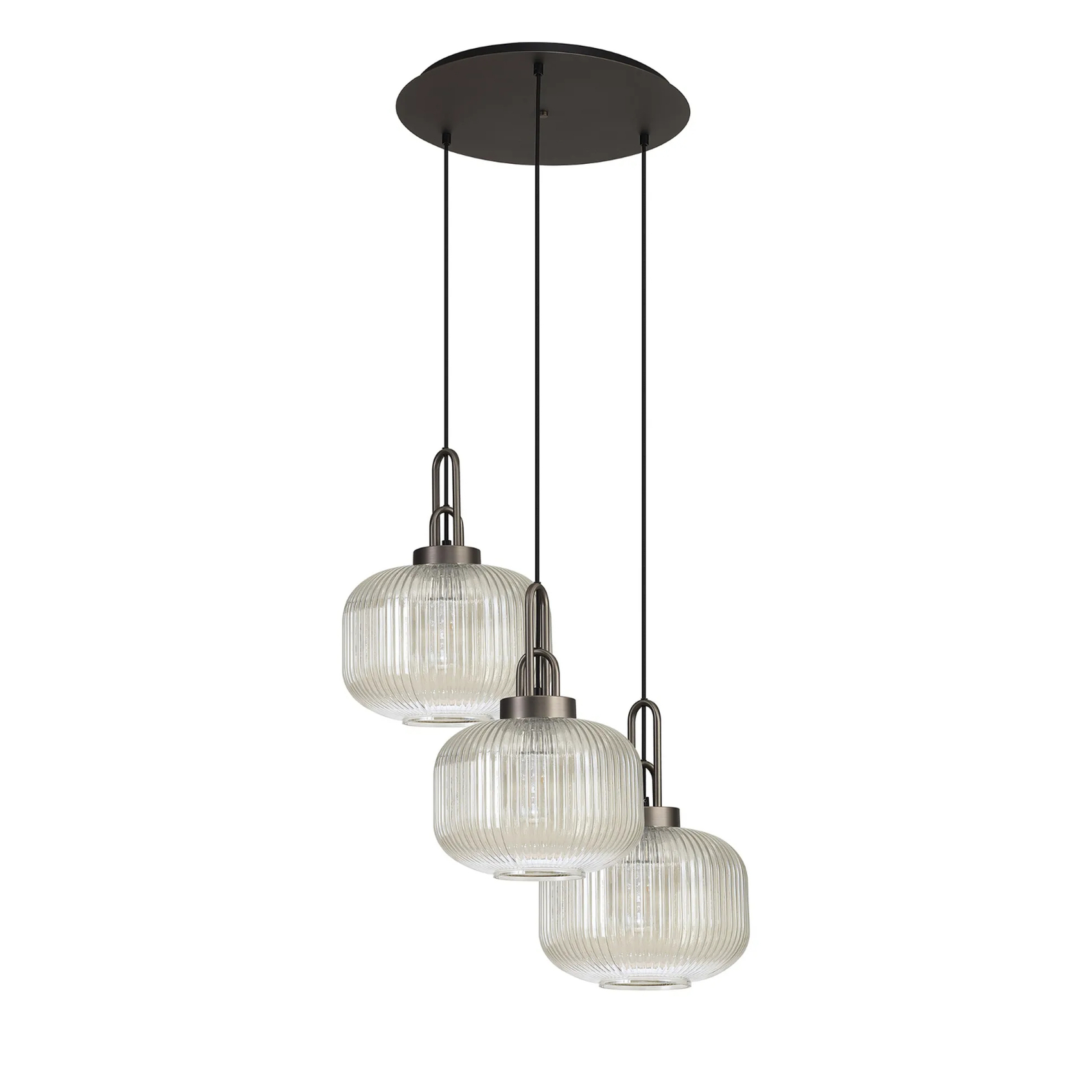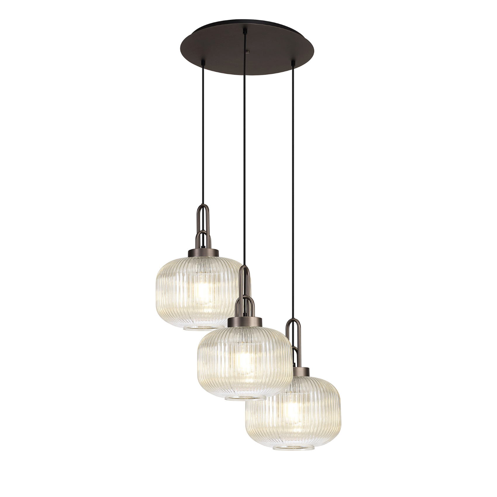 Idolite Camille 2m Round Pendant, 3 x E27, Antique Silver/Matt Black With 30cm Pumpkin Shaped Ribbed Champagne Glass | IDOK5070