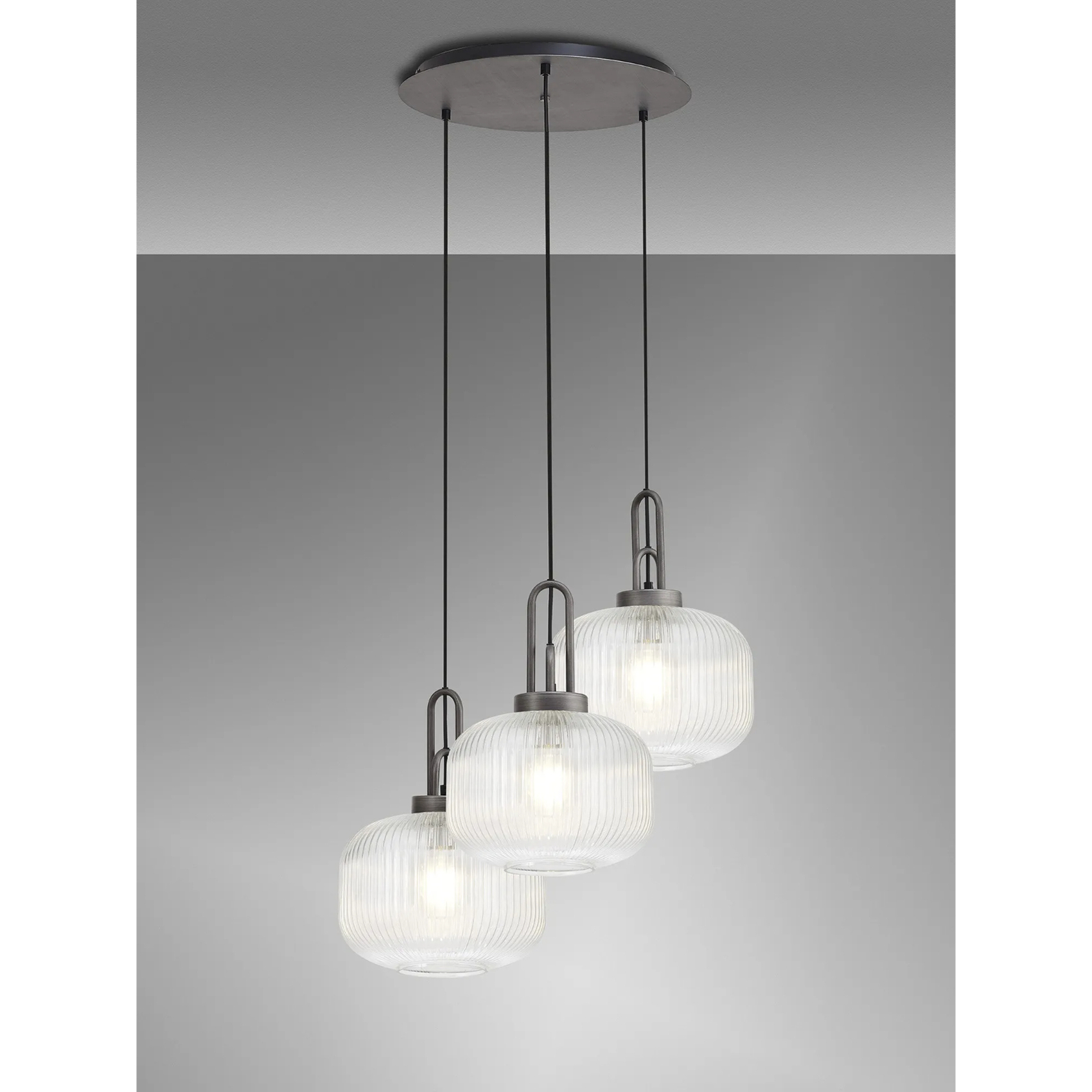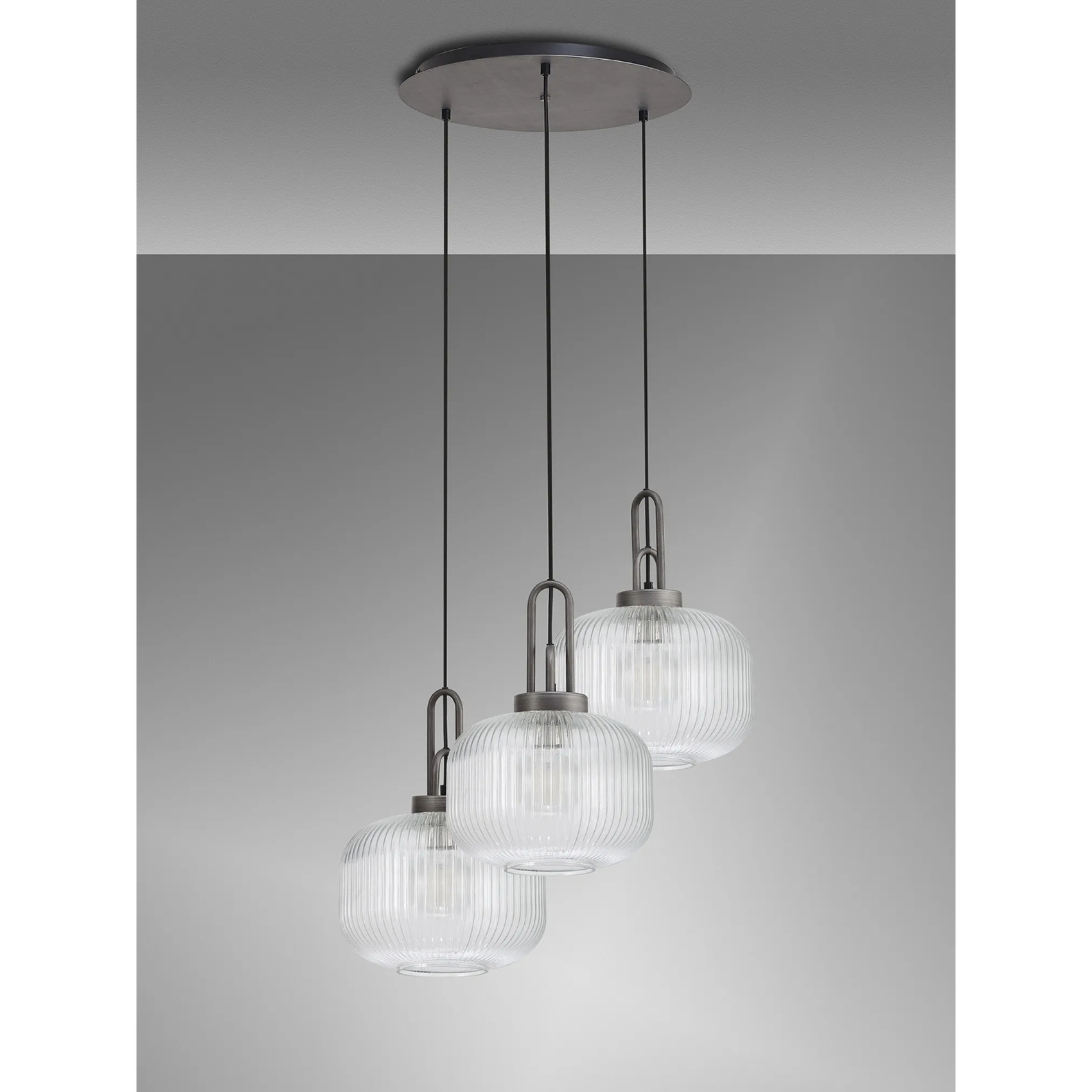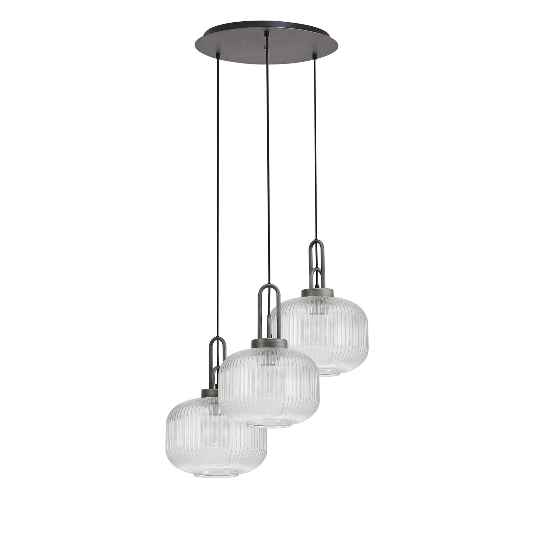 Idolite Camille 2m Round Pendant, 3 x E27, Pewter/Matt Black With 30cm Pumpkin Shaped Ribbed Clear Glass | IDOK2760