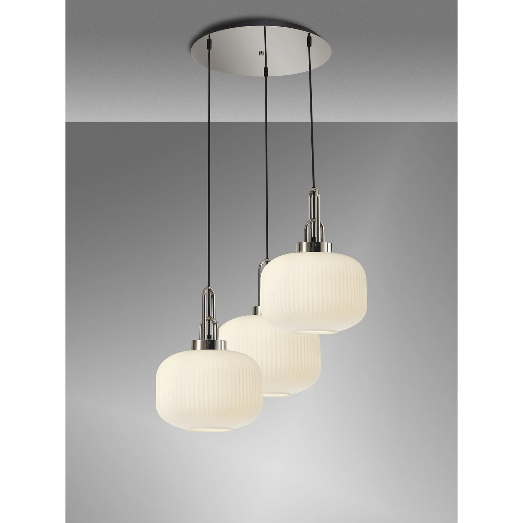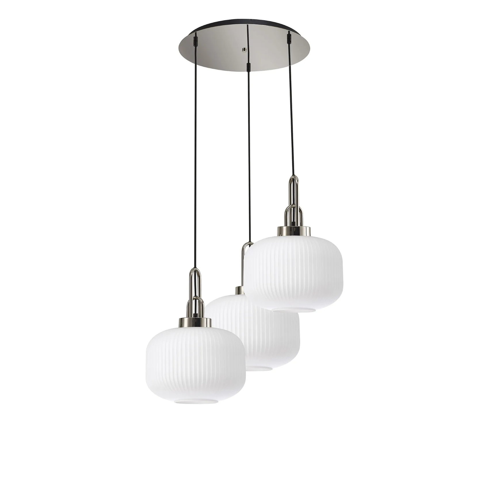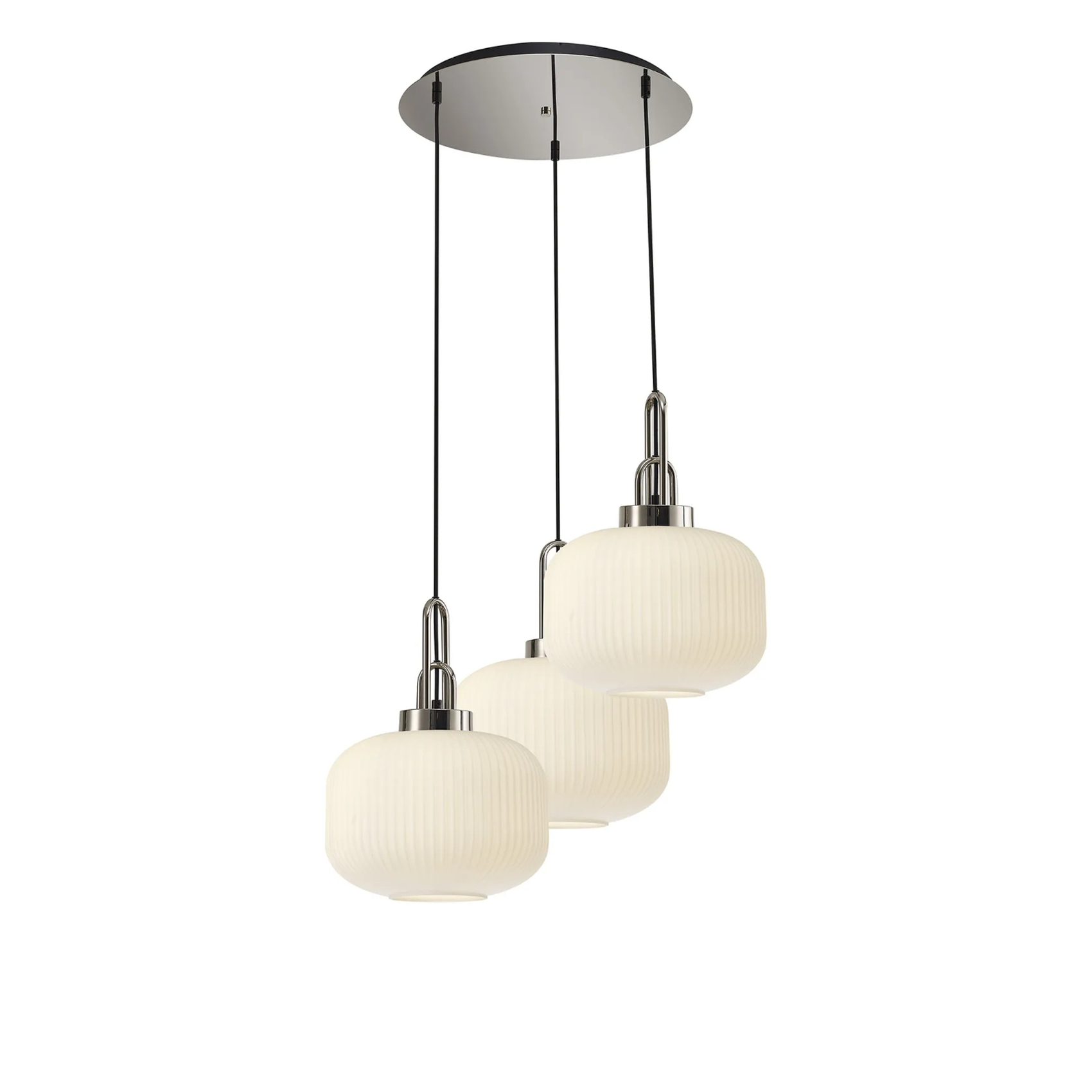 Idolite Camille 2m Round Pendant, 3 x E27, Polished Nickel/Matt Black With 30cm Pumpkin Shaped Ribbed Opal Glass | IDOK8660