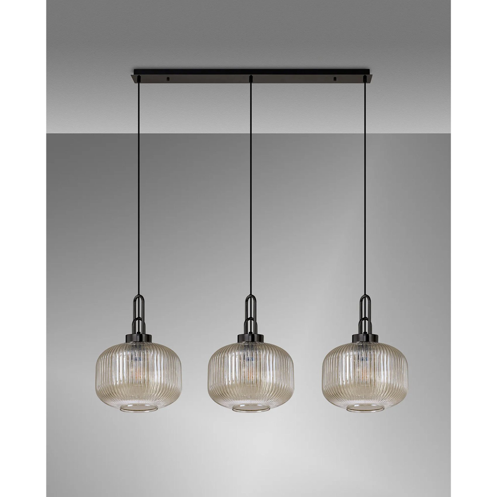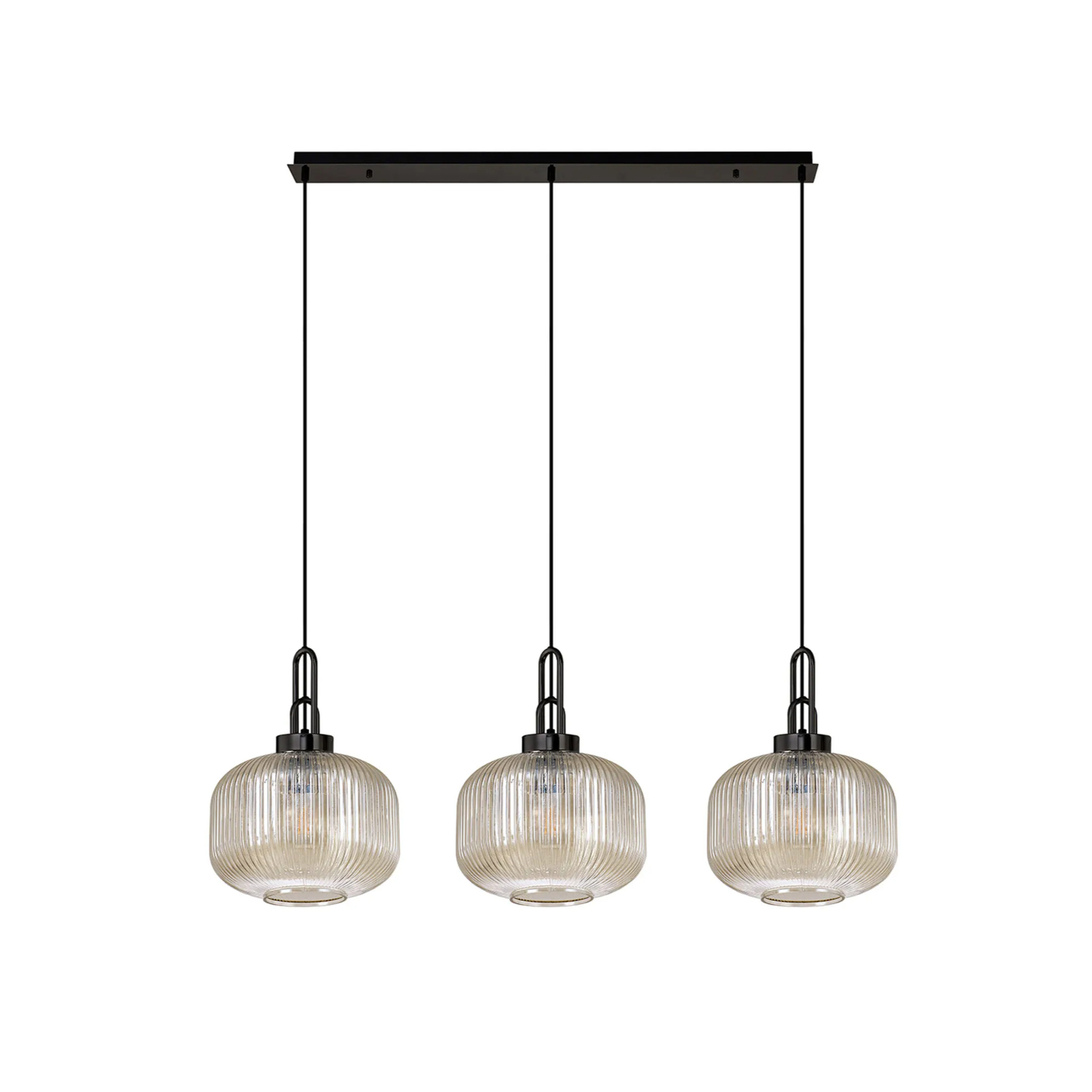 Idolite Camille Linear 3 Light Pendant E27, Black Chrome/Matt Black With 30cm Pumpkin Shaped Ribbed Champagne Glass | IDOK7070