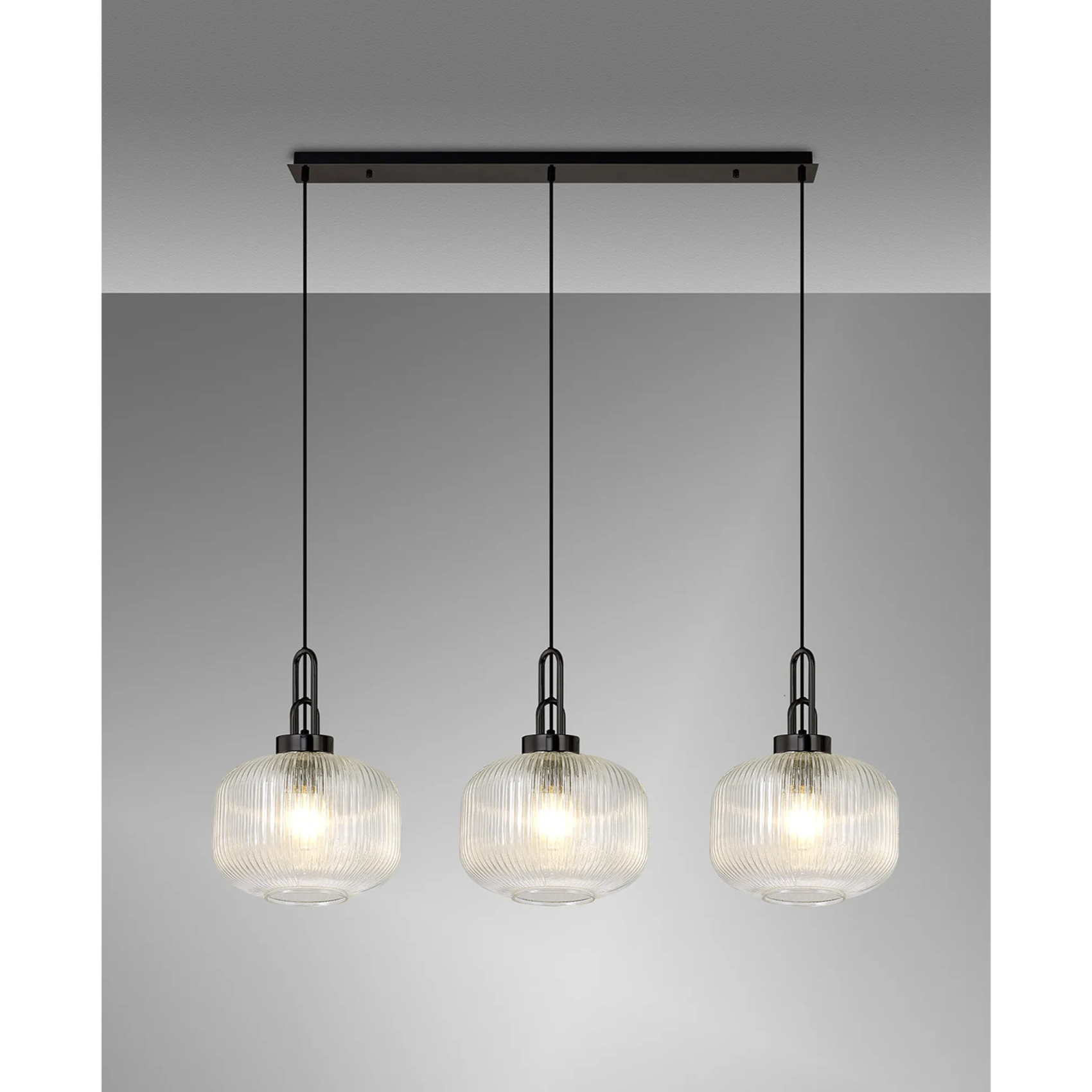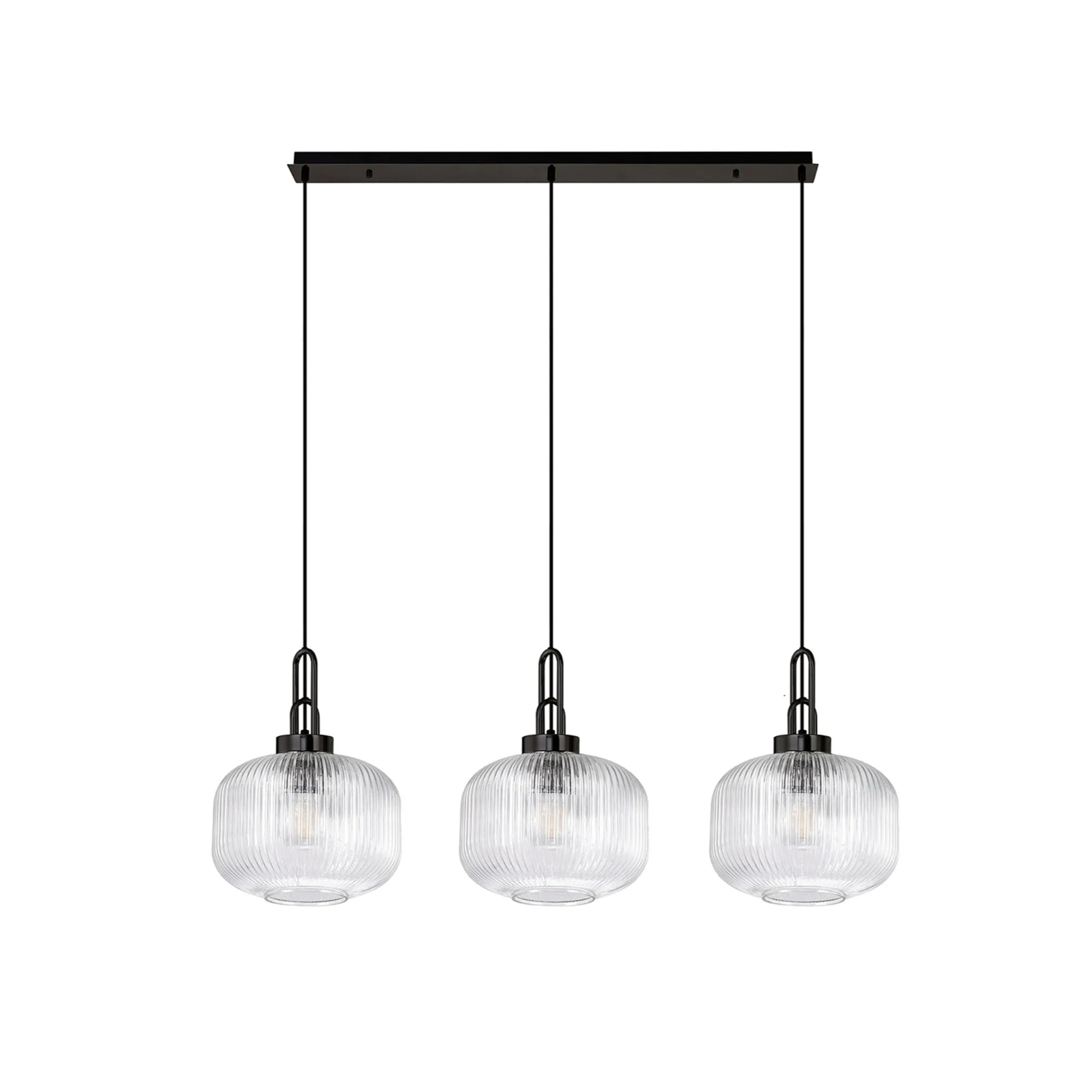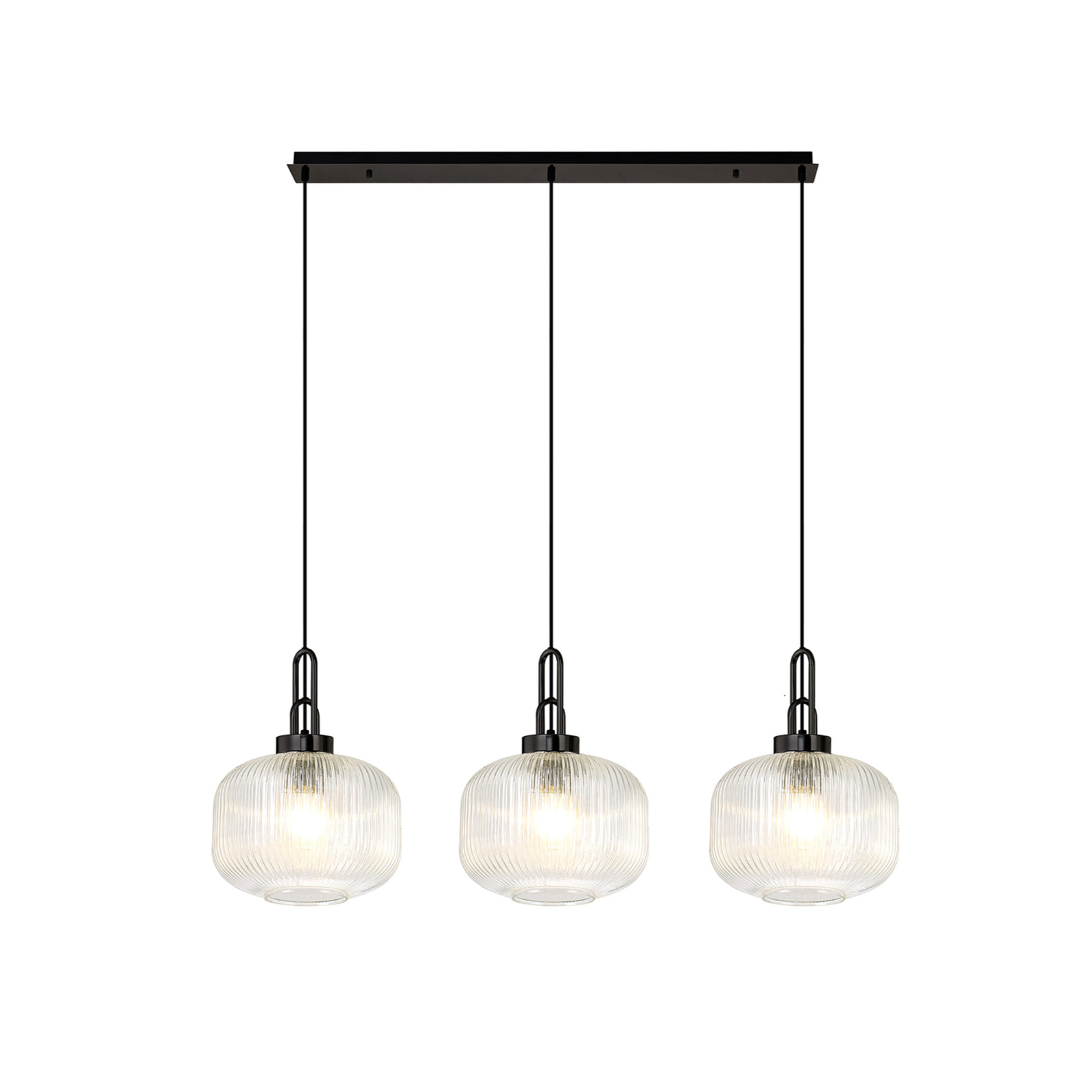 Idolite Camille Linear 3 Light Pendant E27, Black Chrome/Matt Black With 30cm Pumpkin Shaped Ribbed Clear Glass | IDOK8760