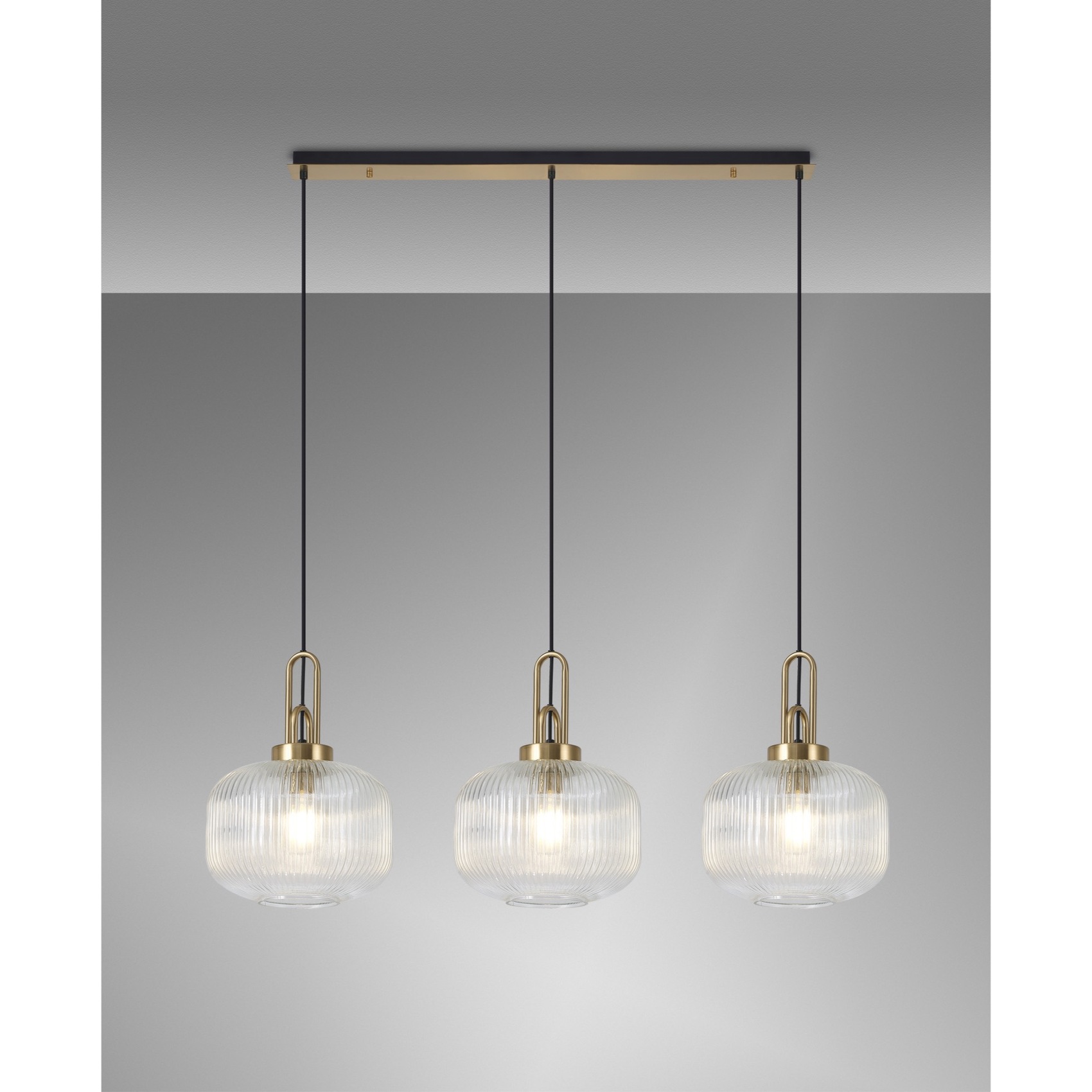 Idolite Camille Linear 3 Light Pendant E27, Brass Gold/Matt Black With 30cm Pumpkin Shaped Ribbed Clear Glass | IDOK1160