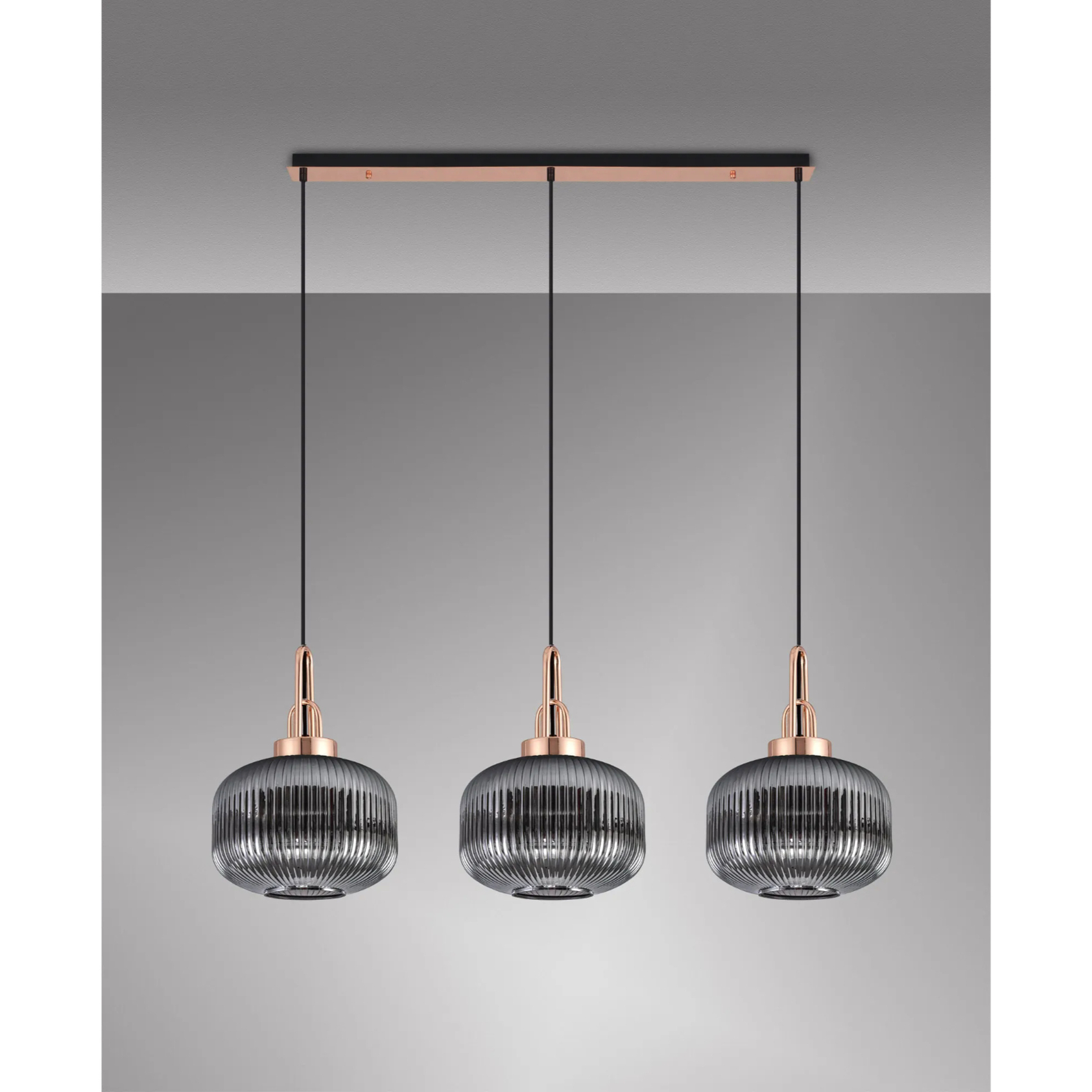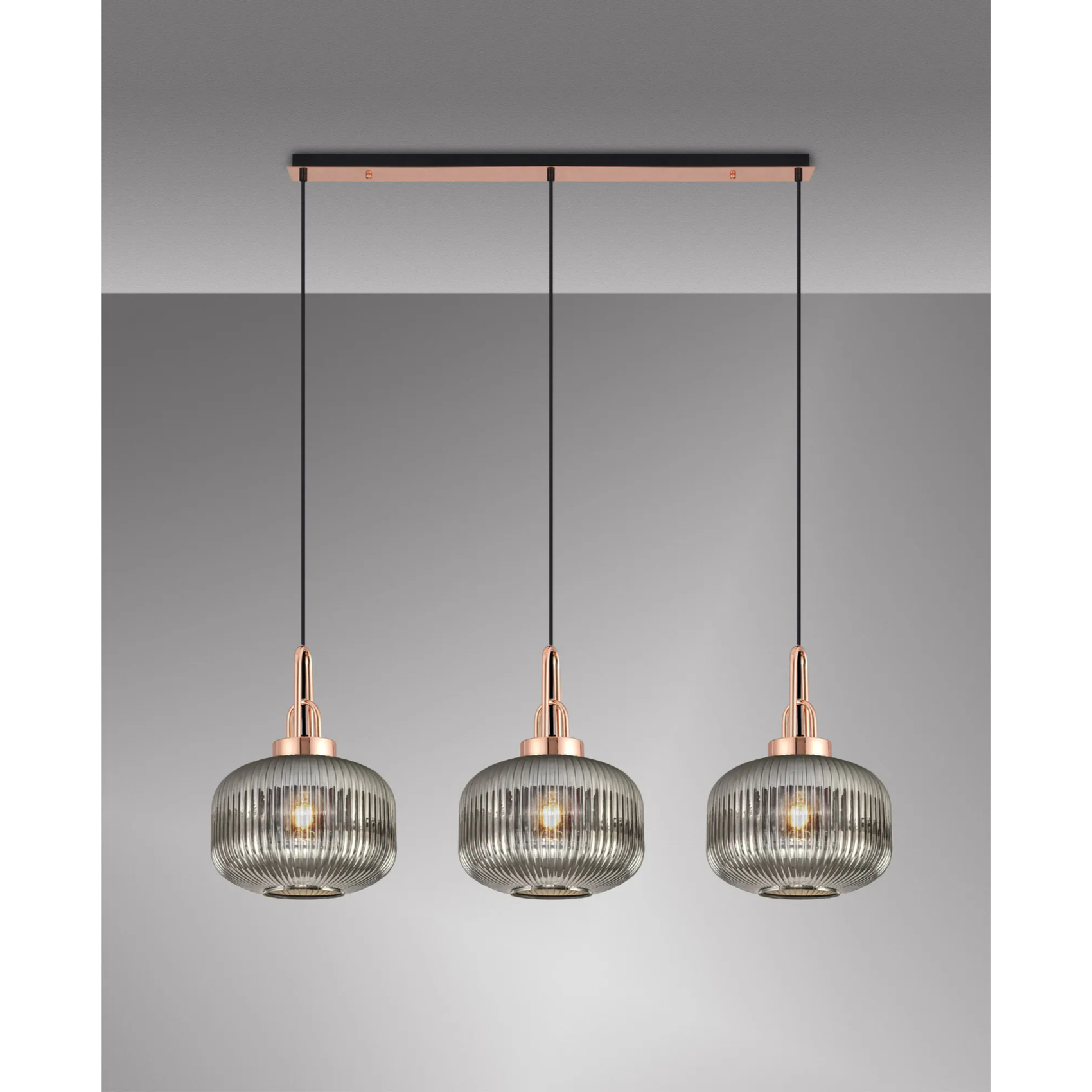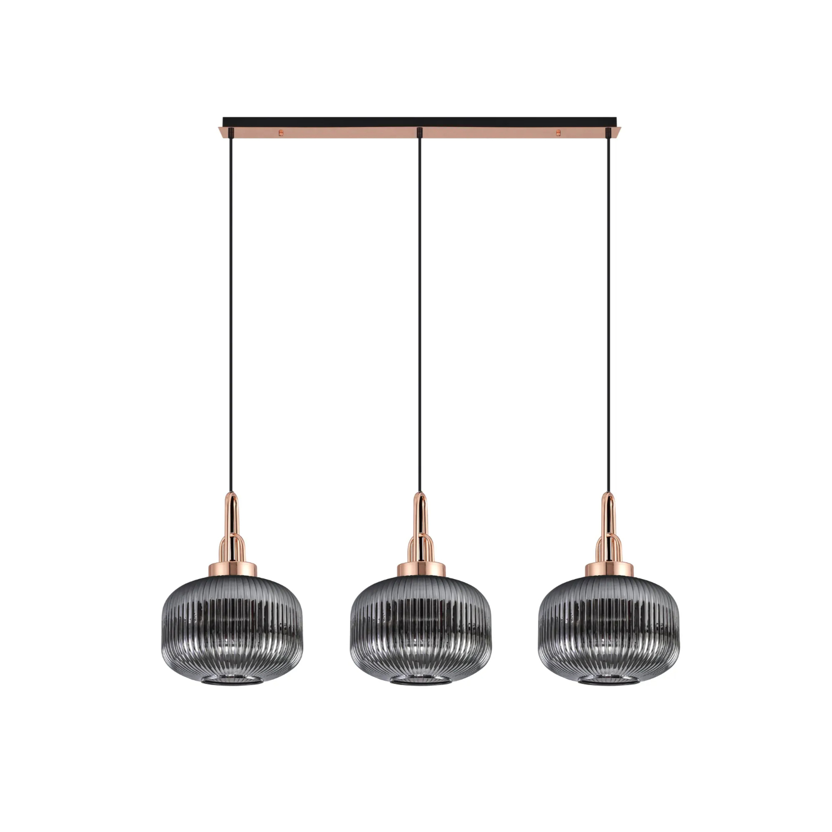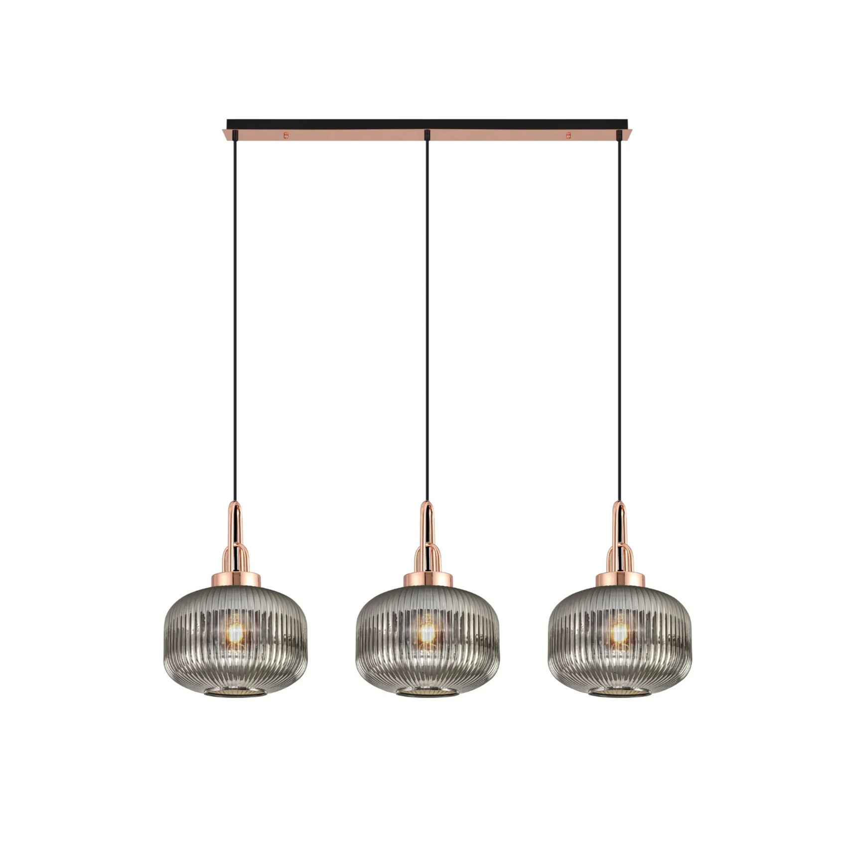 Idolite Camille Linear 3 Light Pendant E27, Copper/Matt Black With 30cm Pumpkin Shaped Ribbed Smoked Glass | IDOK5960