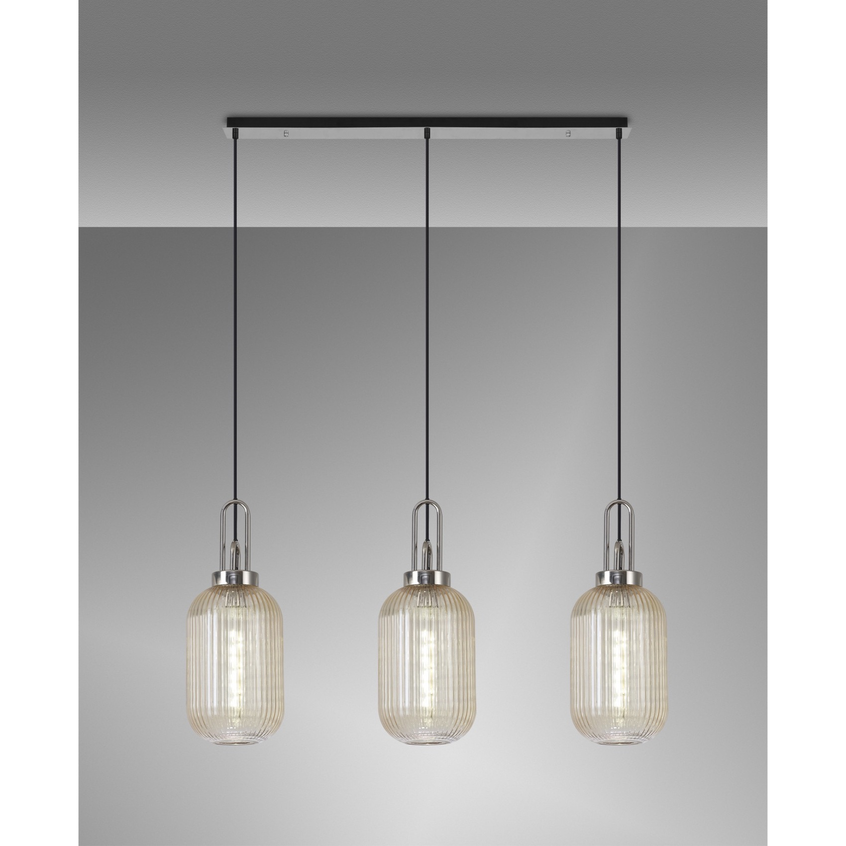 Idolite Camille Linear 3 Light Pendant E27 With 20cm Tubular Ribbed Glass, Champagne Polished Nickel/Matt Black | IDOK0950