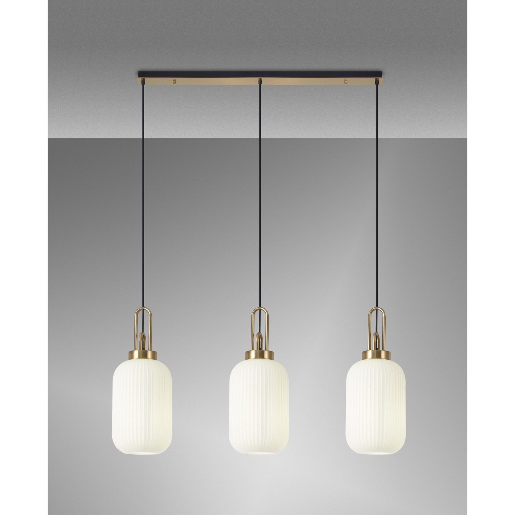 Idolite Camille Linear 3 Light Pendant E27 With 20cm Tubular Ribbed Glass, Opal Brass Gold/Matt Black | IDOK3160
