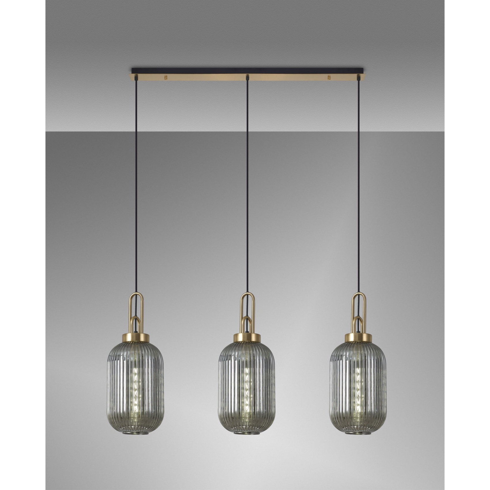 Idolite Camille Linear 3 Light Pendant E27 With 20cm Tubular Ribbed Glass, Smoked Brass Gold/Matt Black | IDOK5160