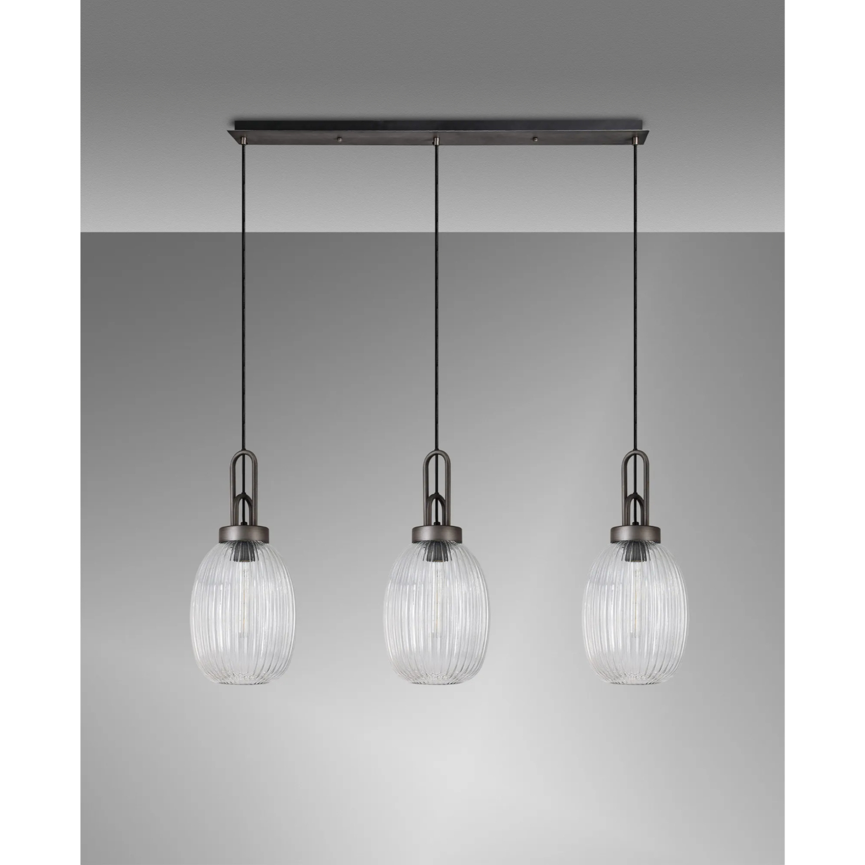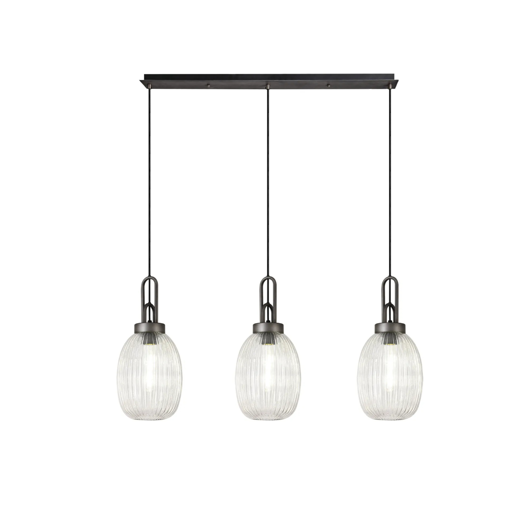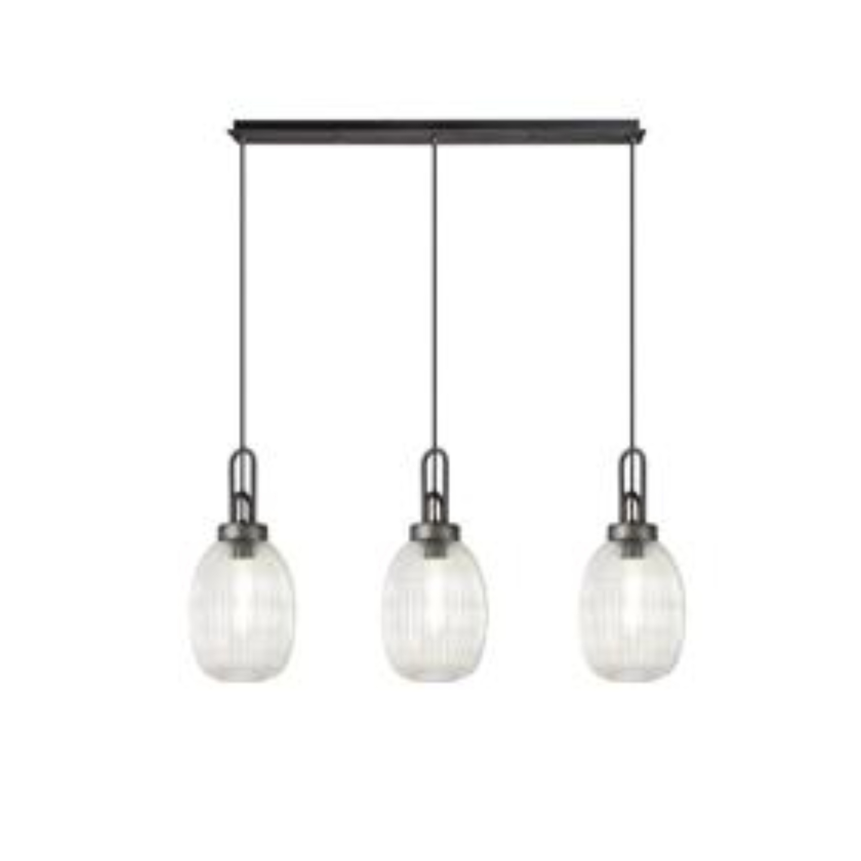 Idolite Camille Linear 3 Light Pendant With 20cm Almond Ribbed Glass, Aged Pewter/Matt Black Clear | IDOK3080