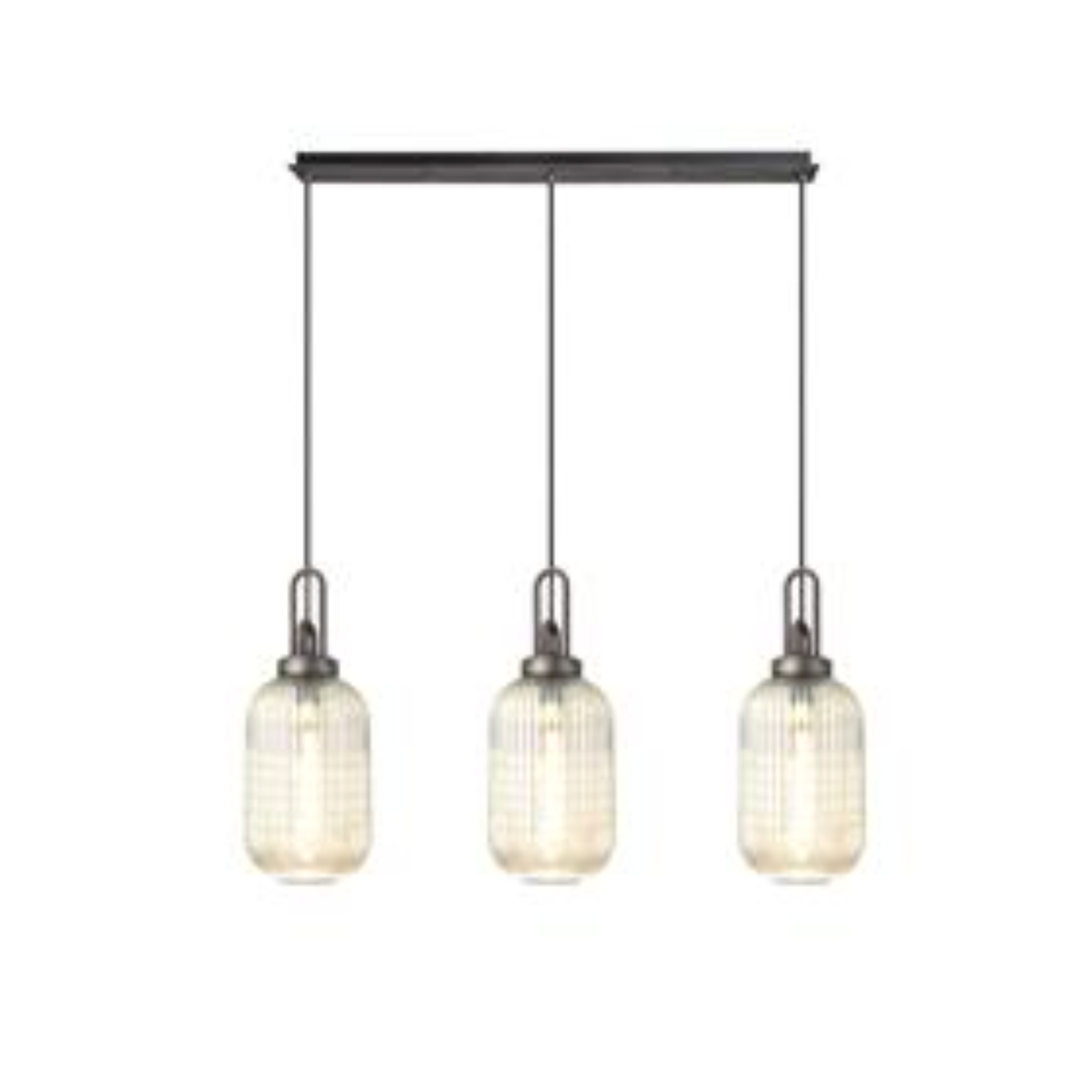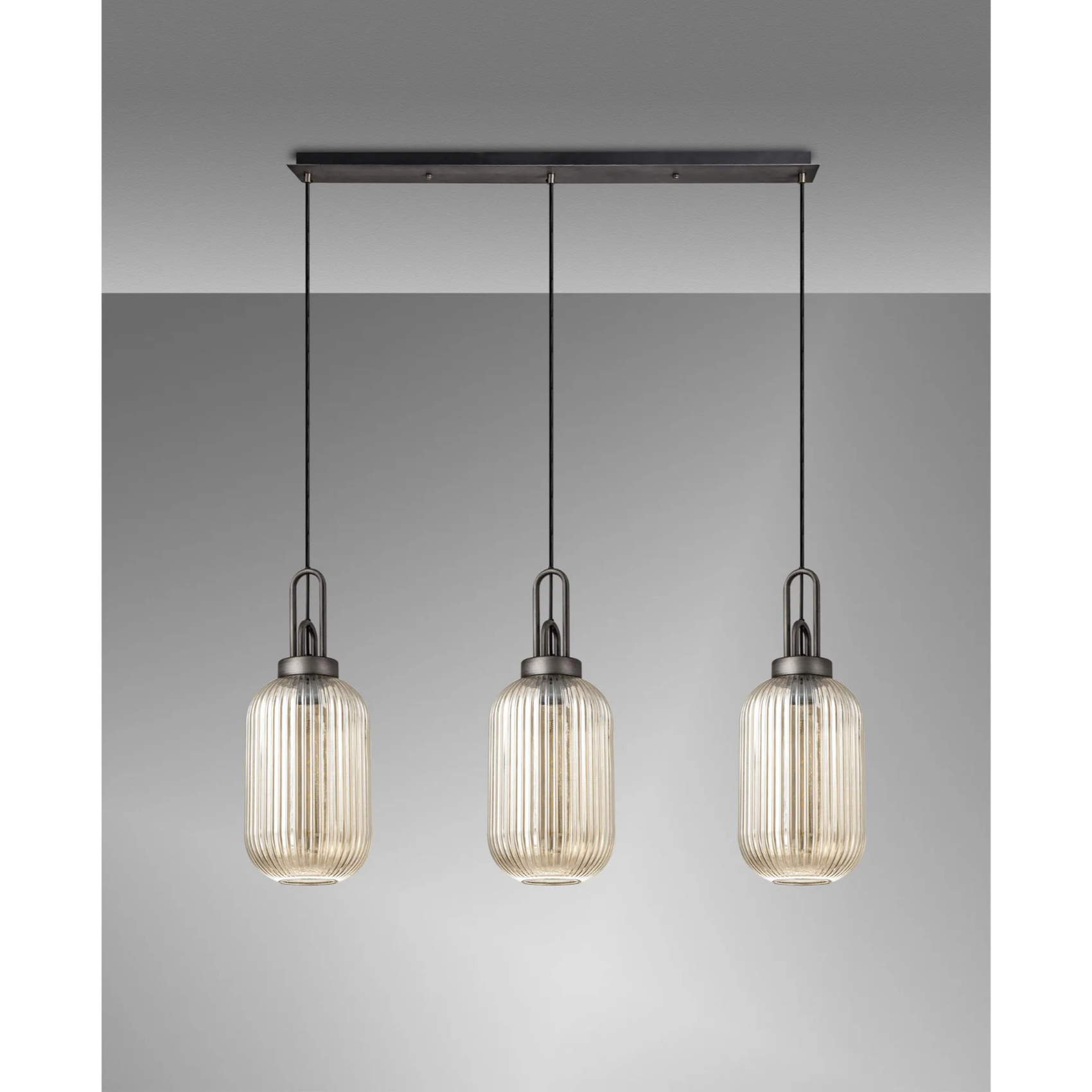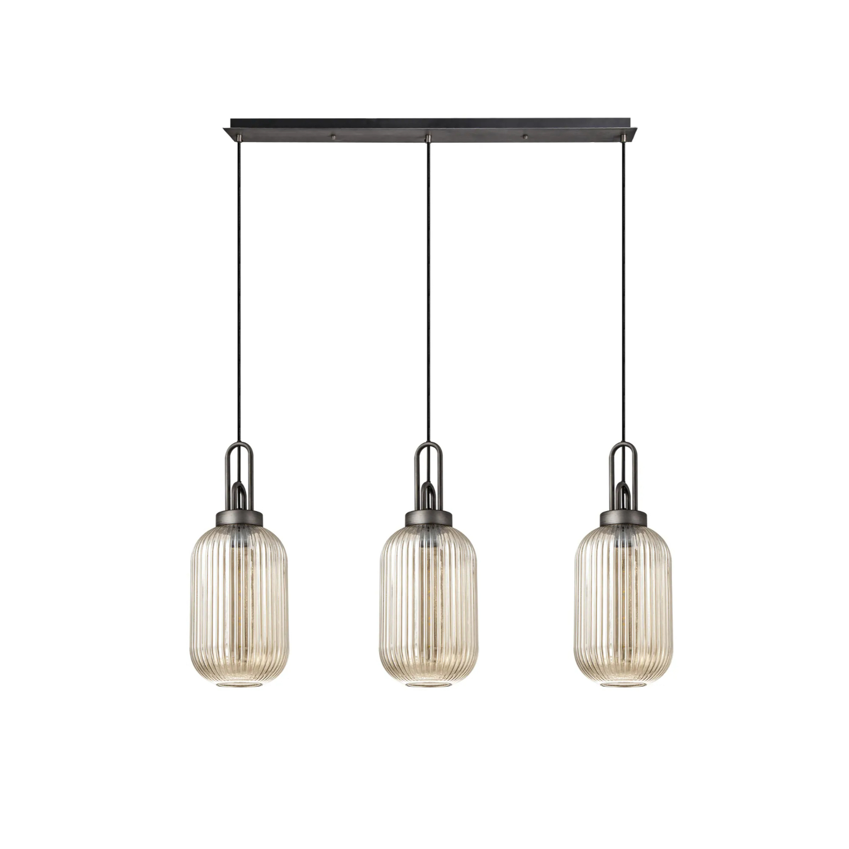 Idolite Camille Linear 3 Light Pendant With 20cm Tubular Ribbed Glass, Aged Pewter/Matt Black Champagne | IDOK2870