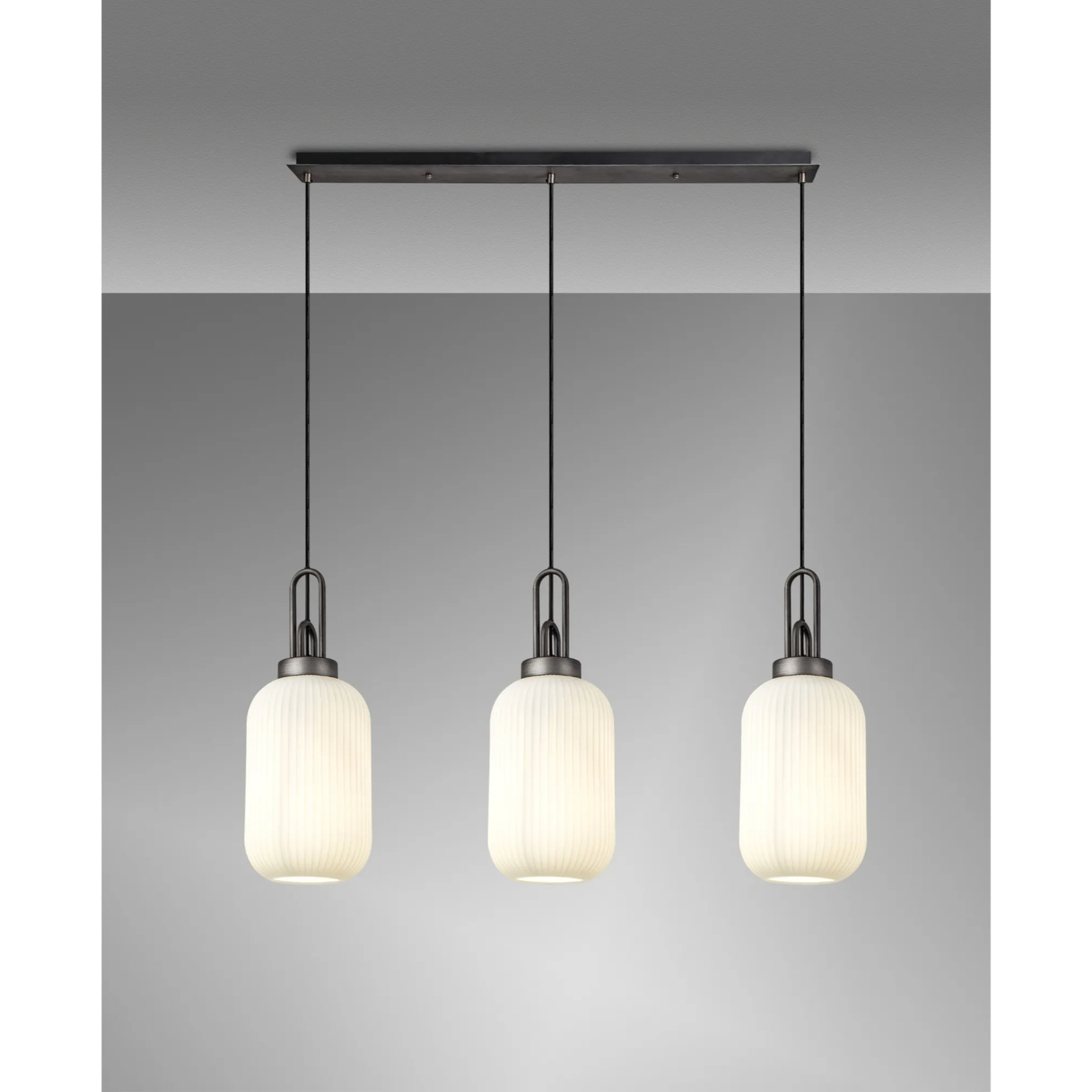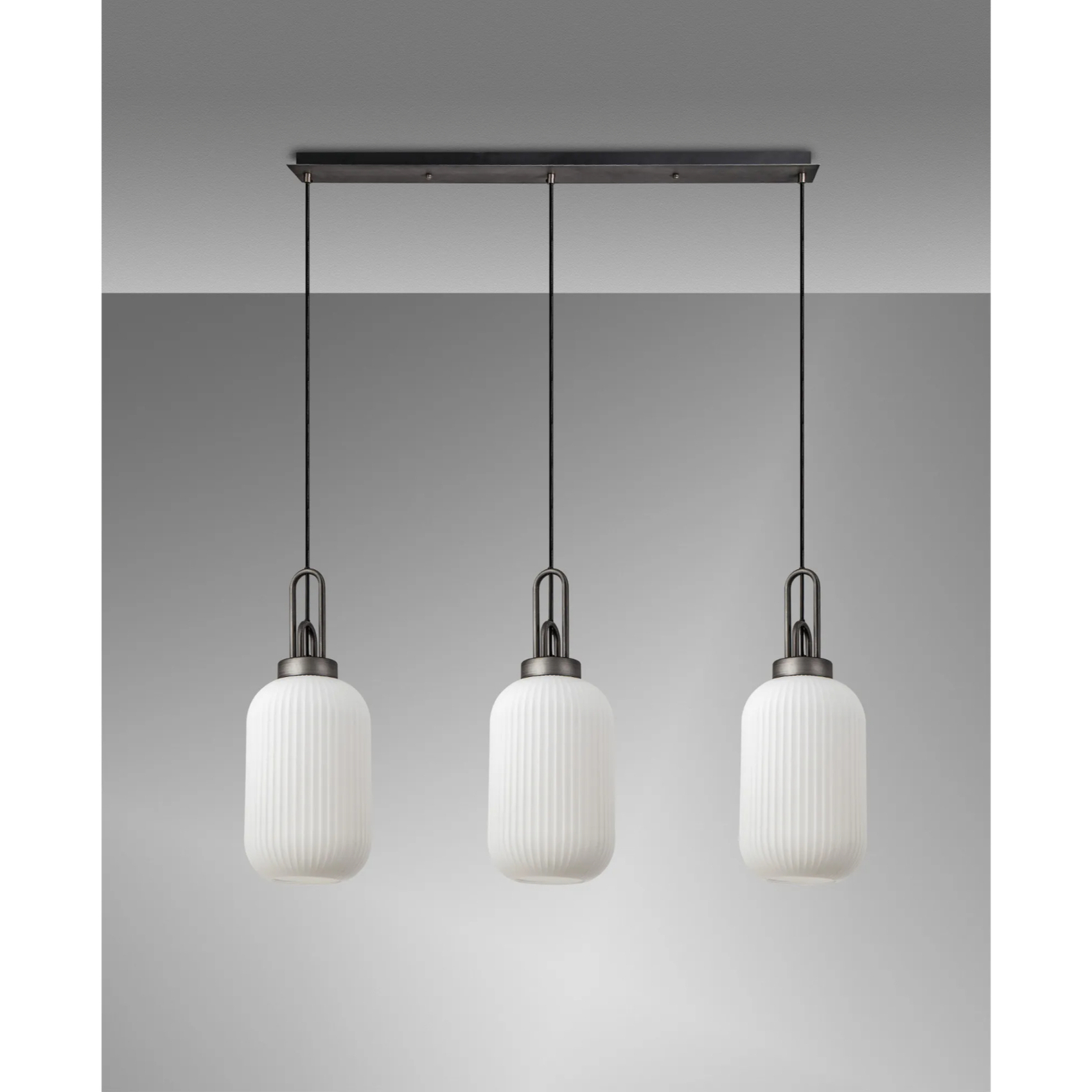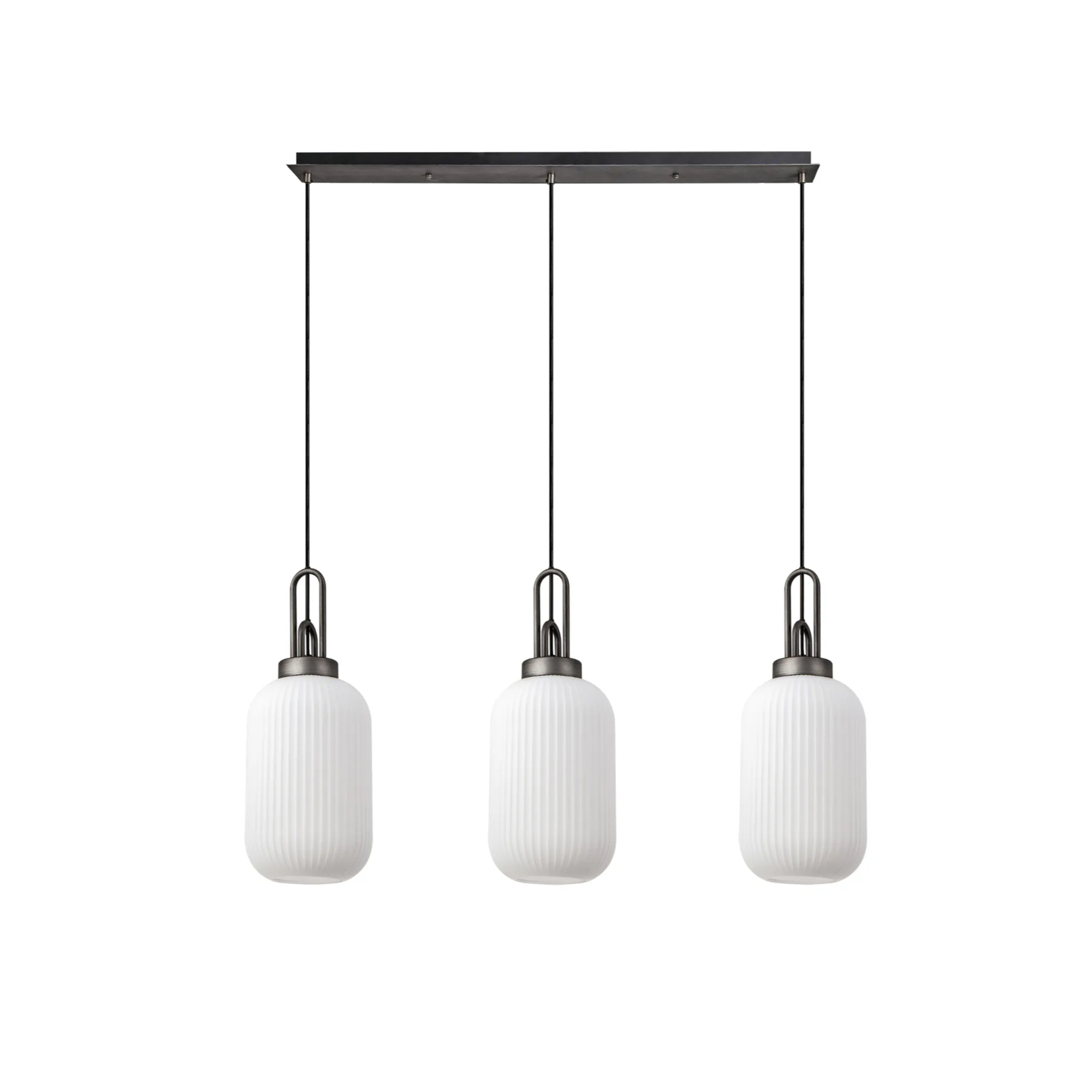 Idolite Camille Linear 3 Light Pendant With 20cm Tubular Ribbed Glass, Aged Pewter/Matt Black Opal | IDOK0270