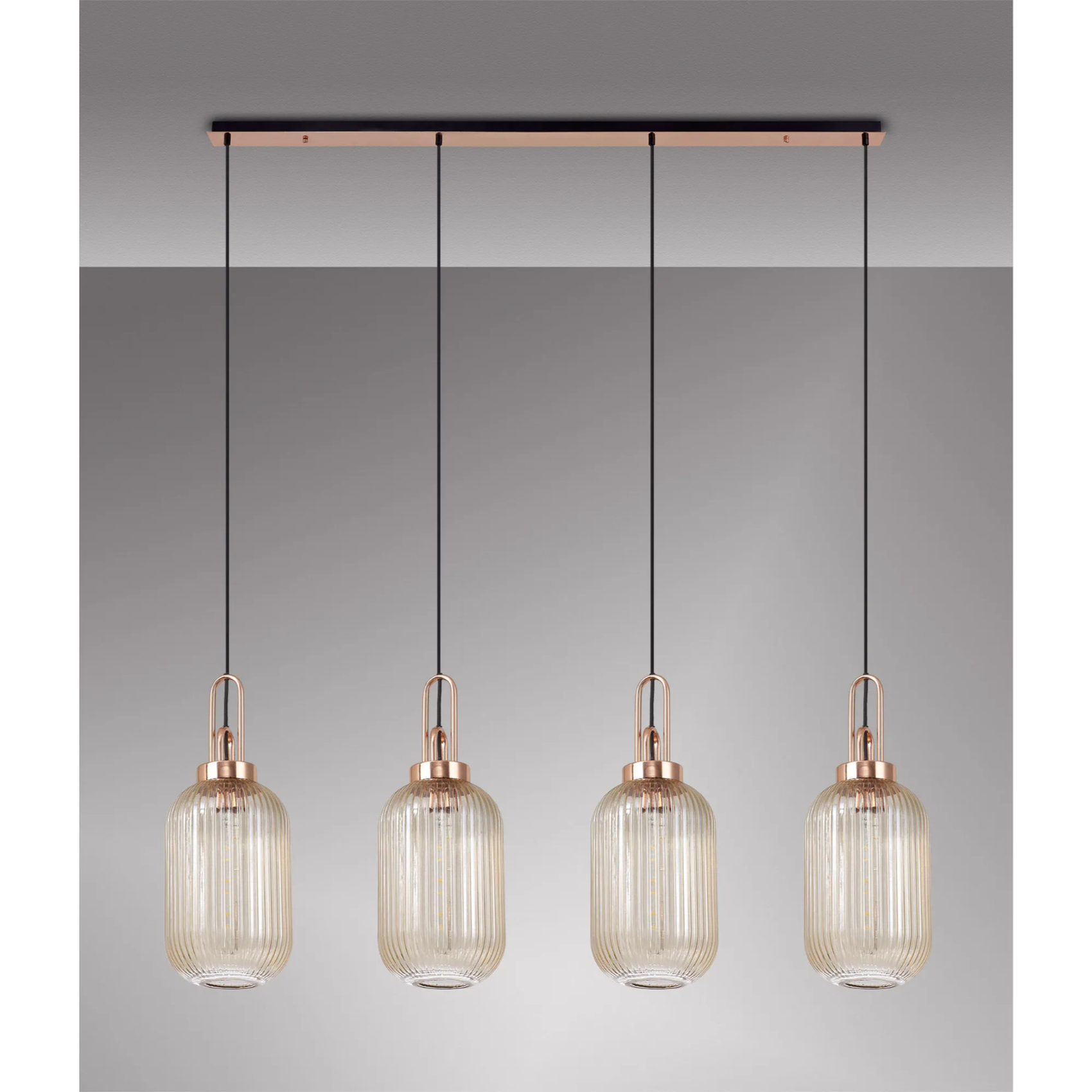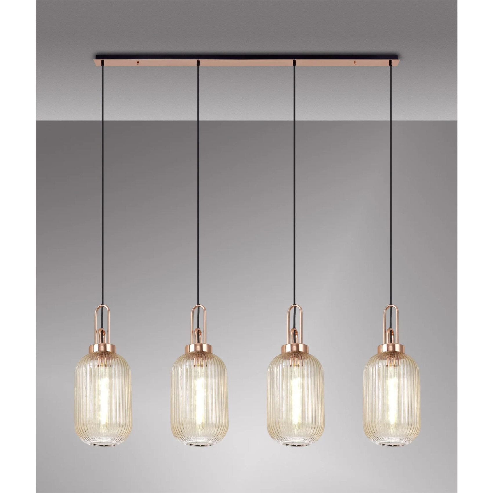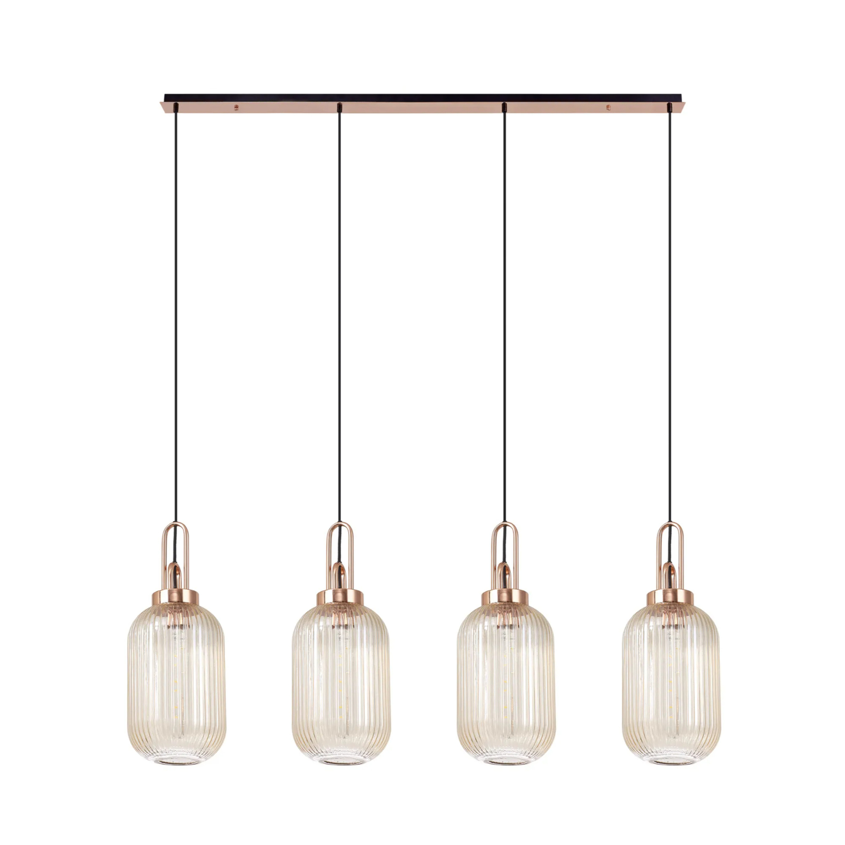 Idolite Camille Linear 4 Light Pendant With 20cm Tubular Ribbed Glass, Copper/Matt Black Champagne | IDOK7970