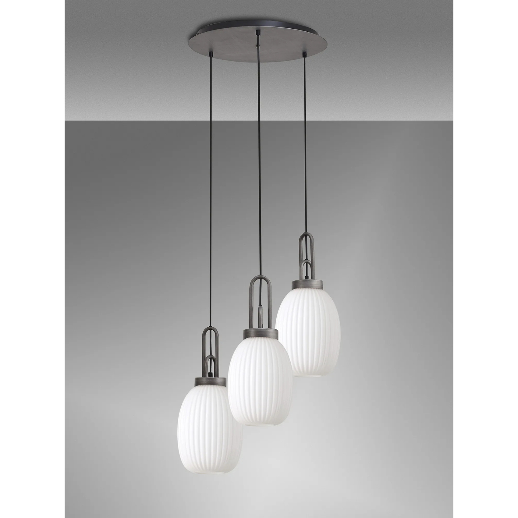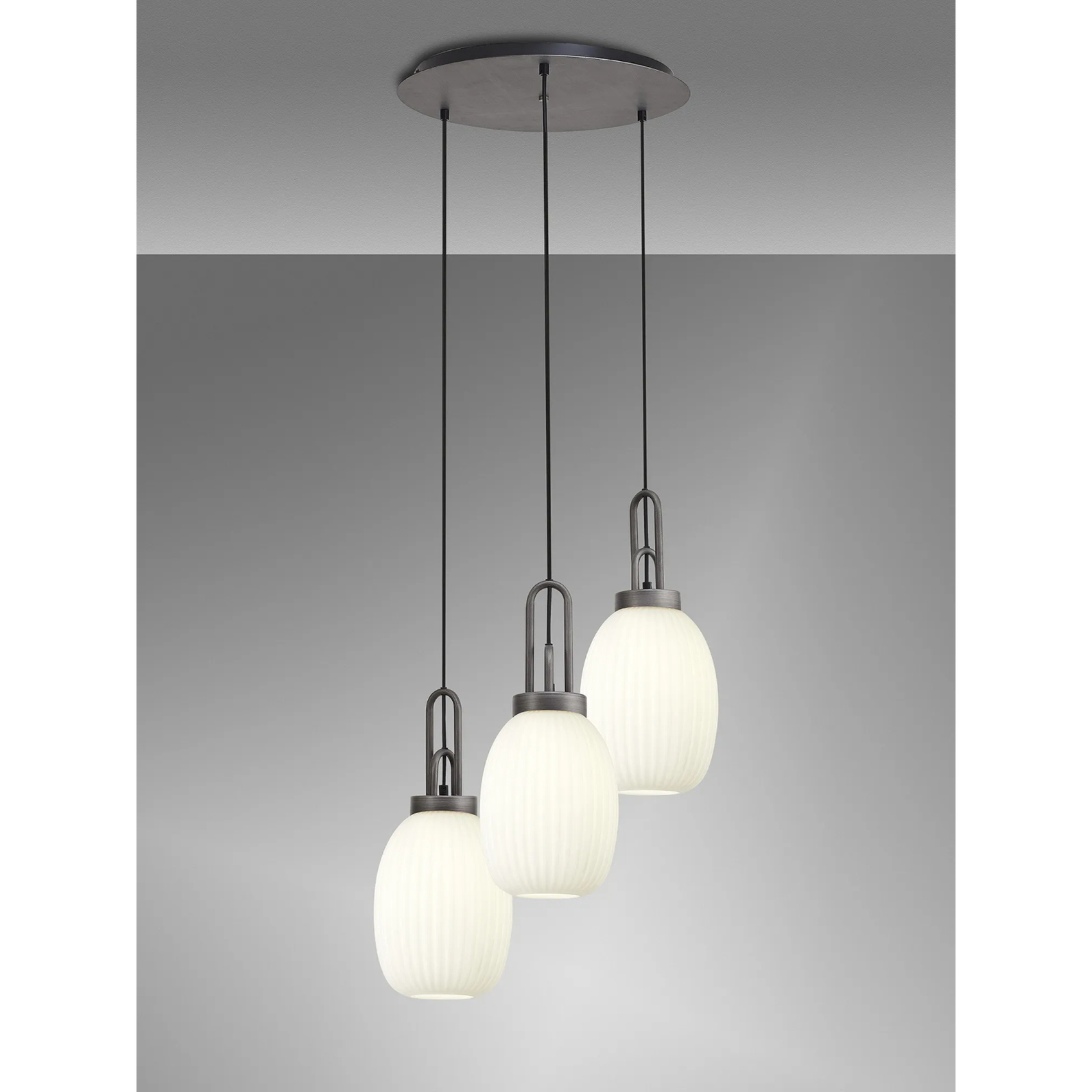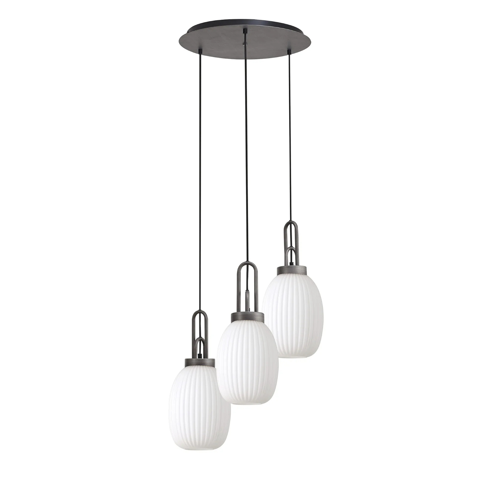 Idolite Camille Round 3 Light Pendant With 20cm Almond Ribbed Glass, Aged Pewter/Matt Black Opal | IDOK8680