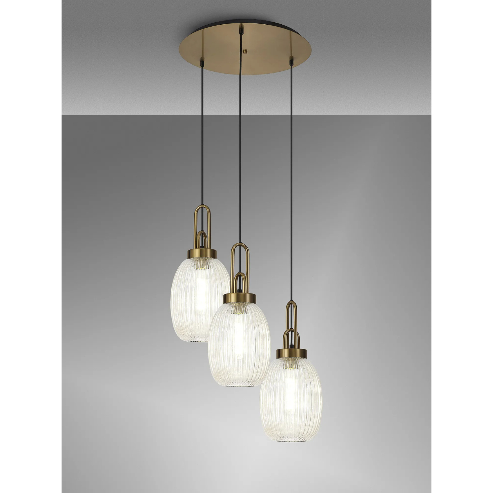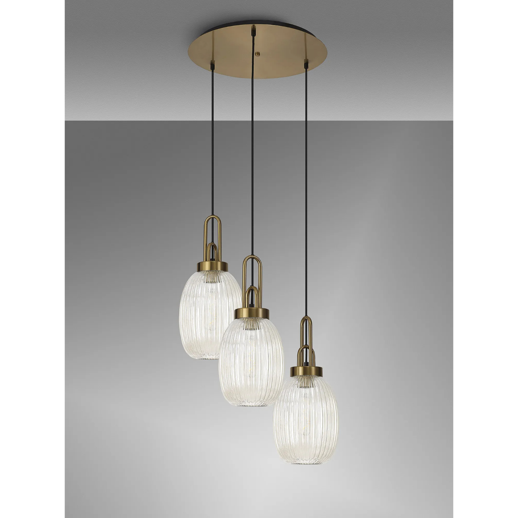 Idolite Camille Round 3 Light Pendant With 20cm Almond Ribbed Glass, Brass Gold/Matt Black Champagne | IDOK8580
