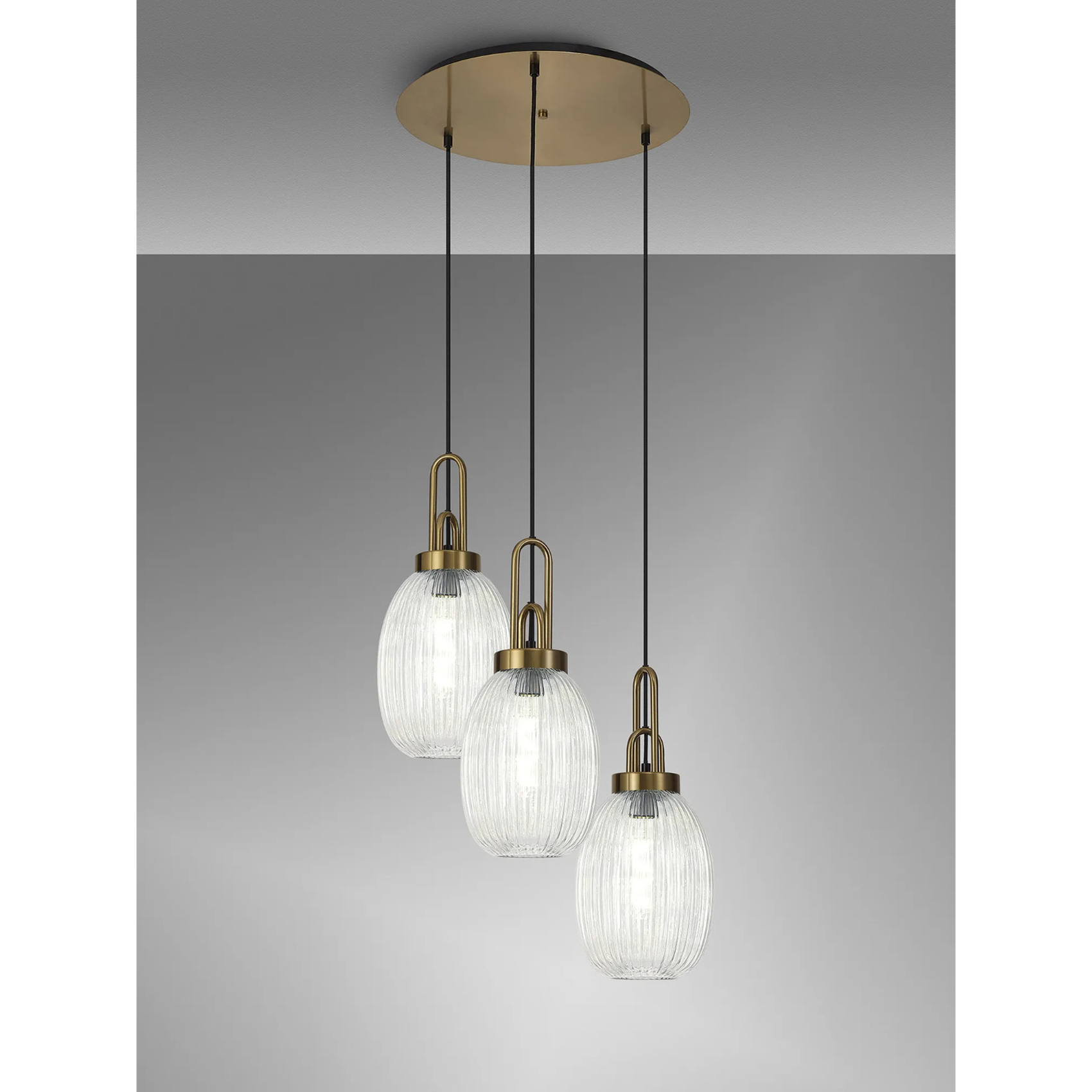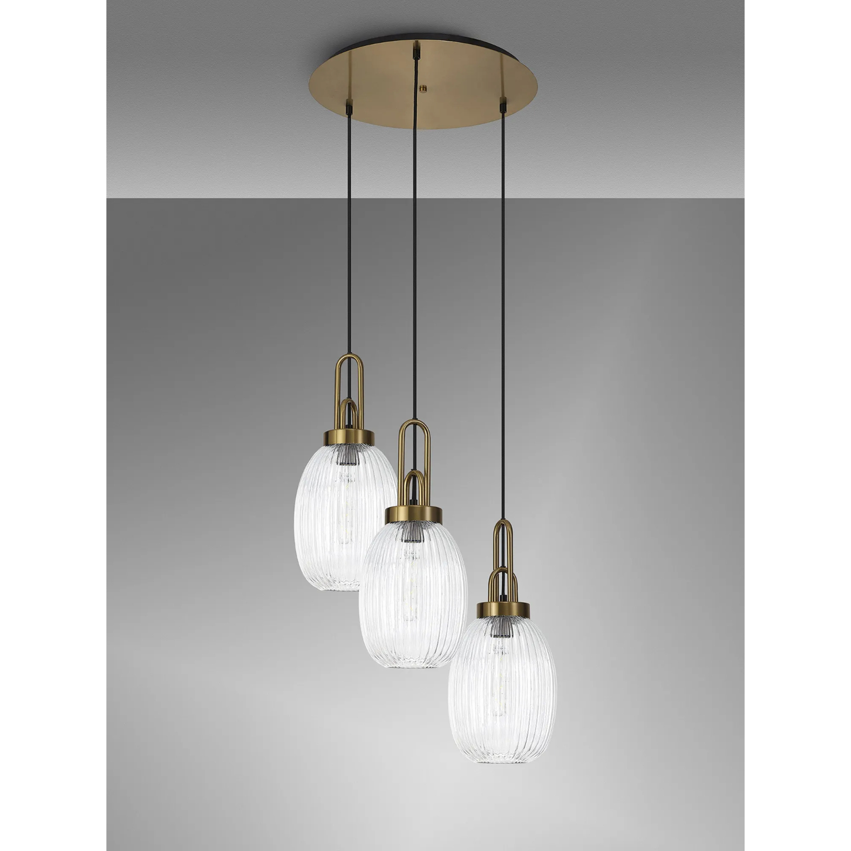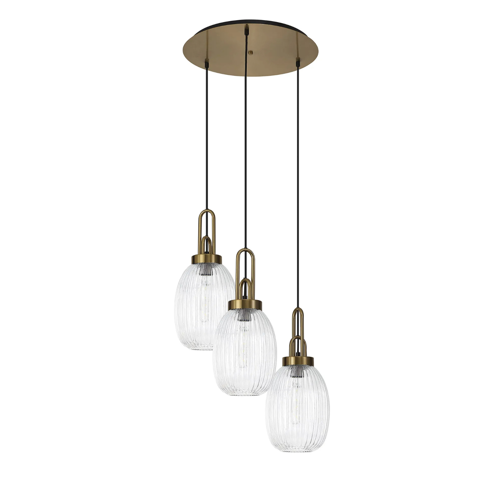 Idolite Camille Round 3 Light Pendant With 20cm Almond Ribbed Glass, Brass Gold/Matt Black Clear | IDOK6180