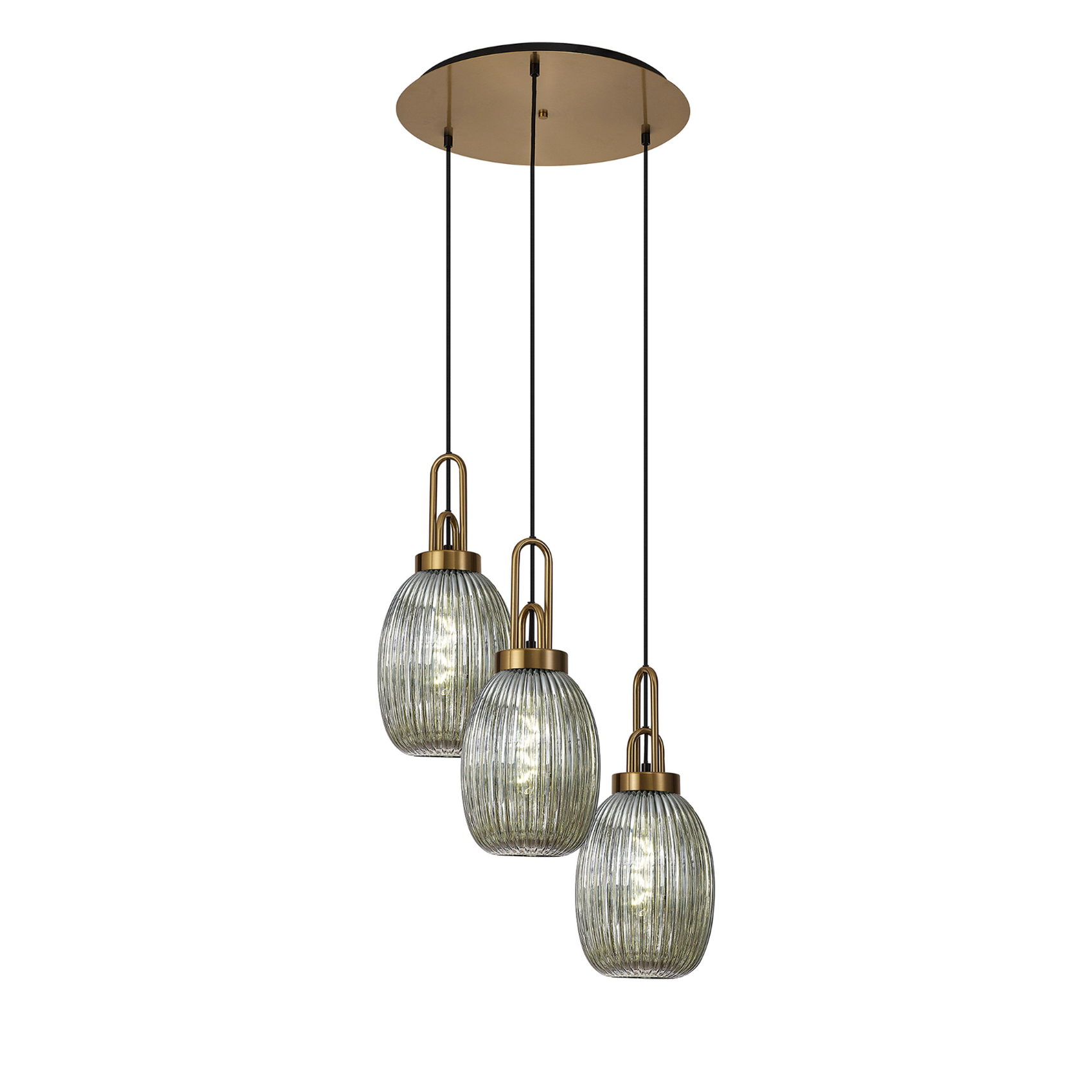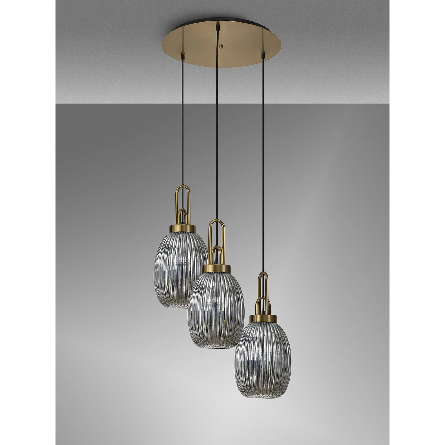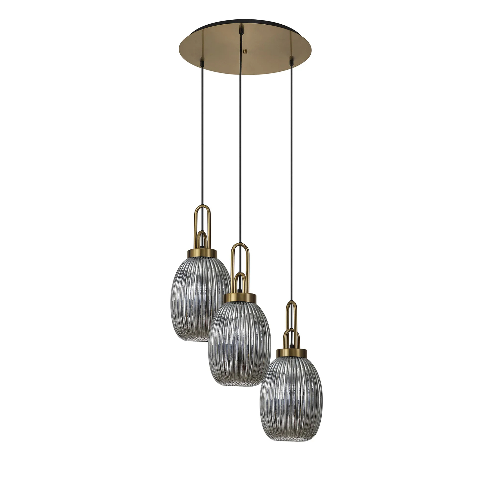 Idolite Camille Round 3 Light Pendant With 20cm Almond Ribbed Glass, Brass Gold/Matt Black Smoked | IDOK7380