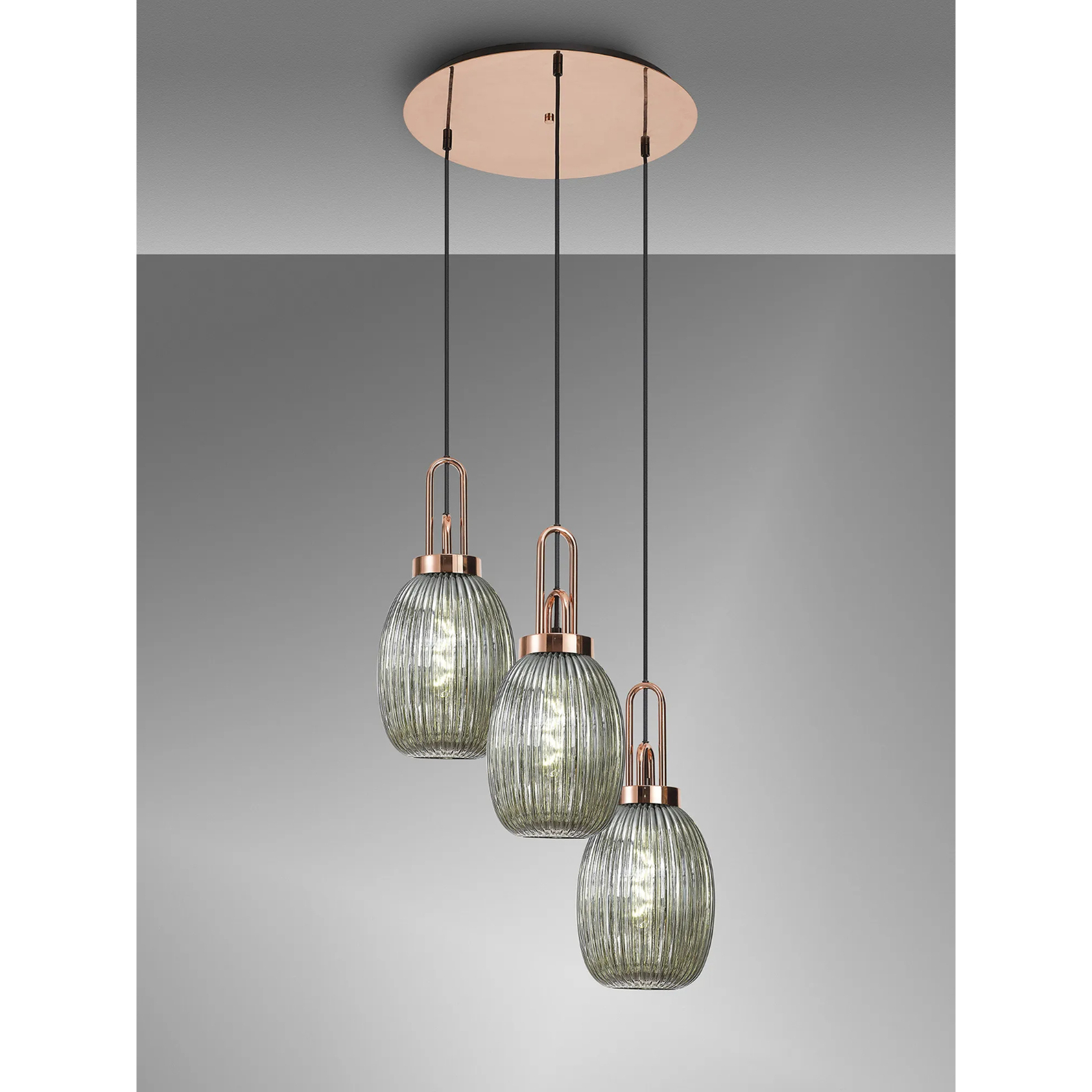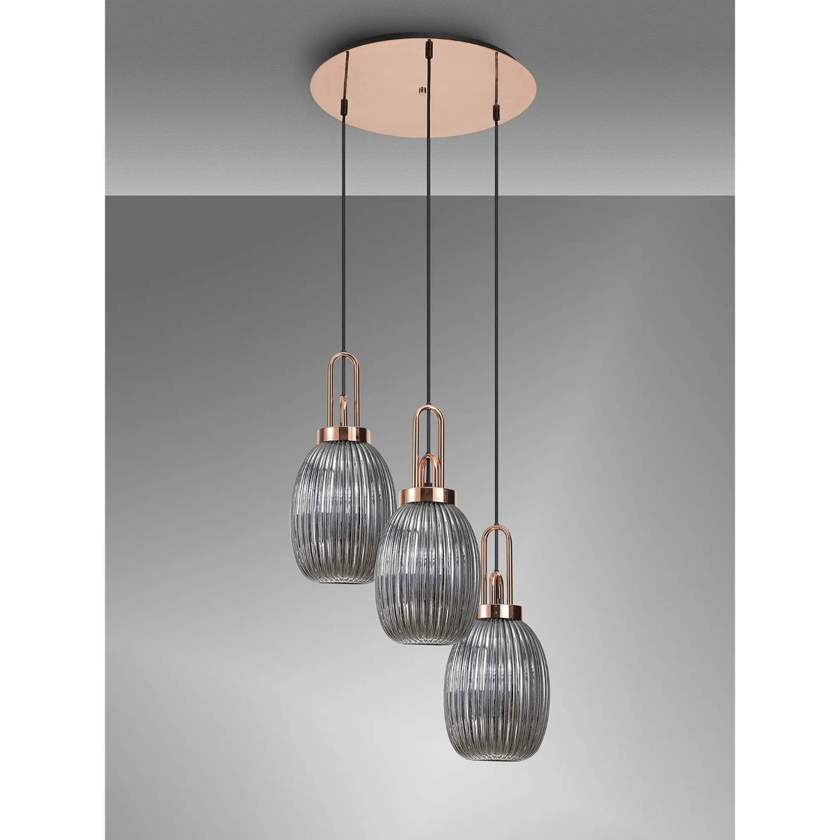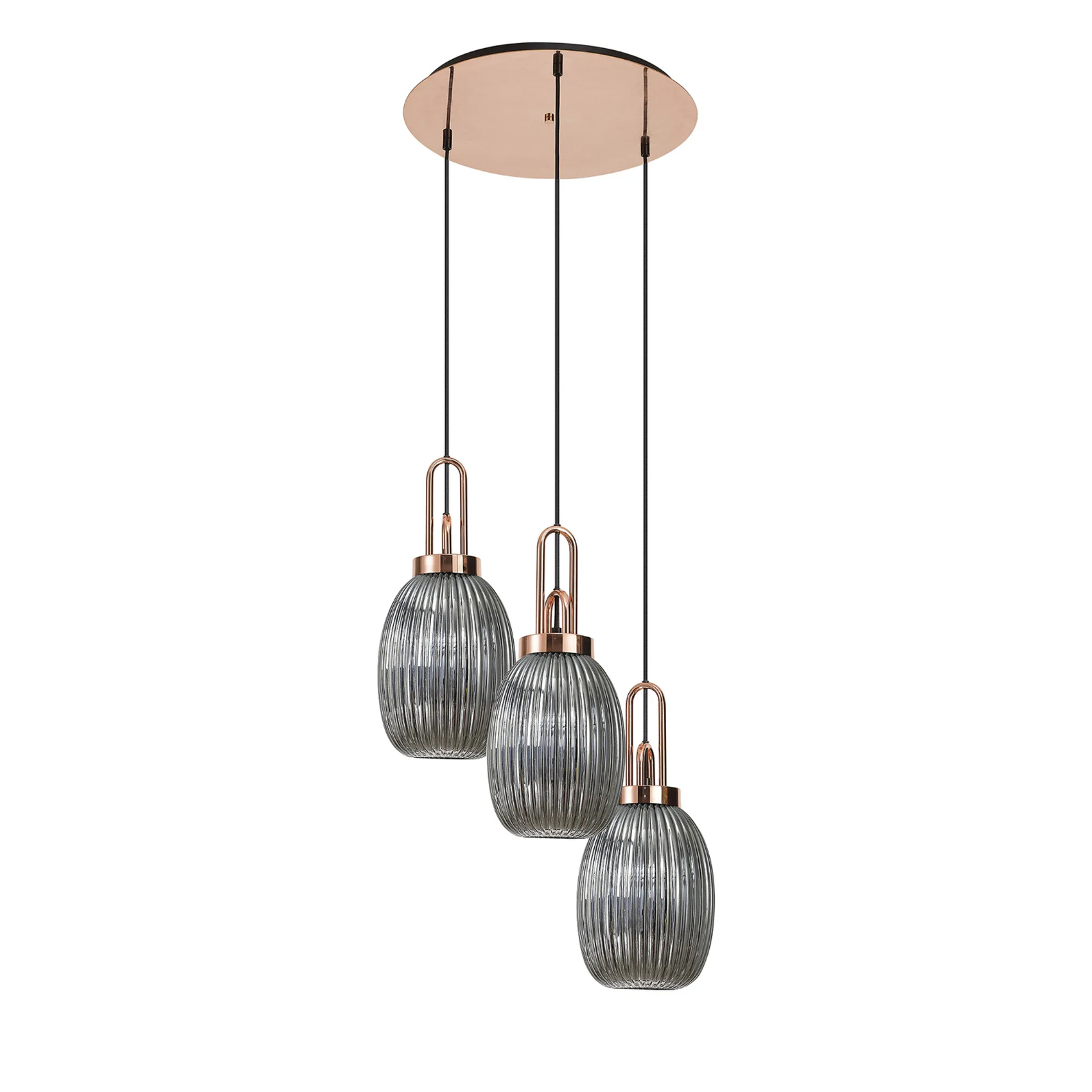 Idolite Camille Round 3 Light Pendant With 20cm Almond Ribbed Glass, Copper/Matt Black Smoked | IDOK0480
