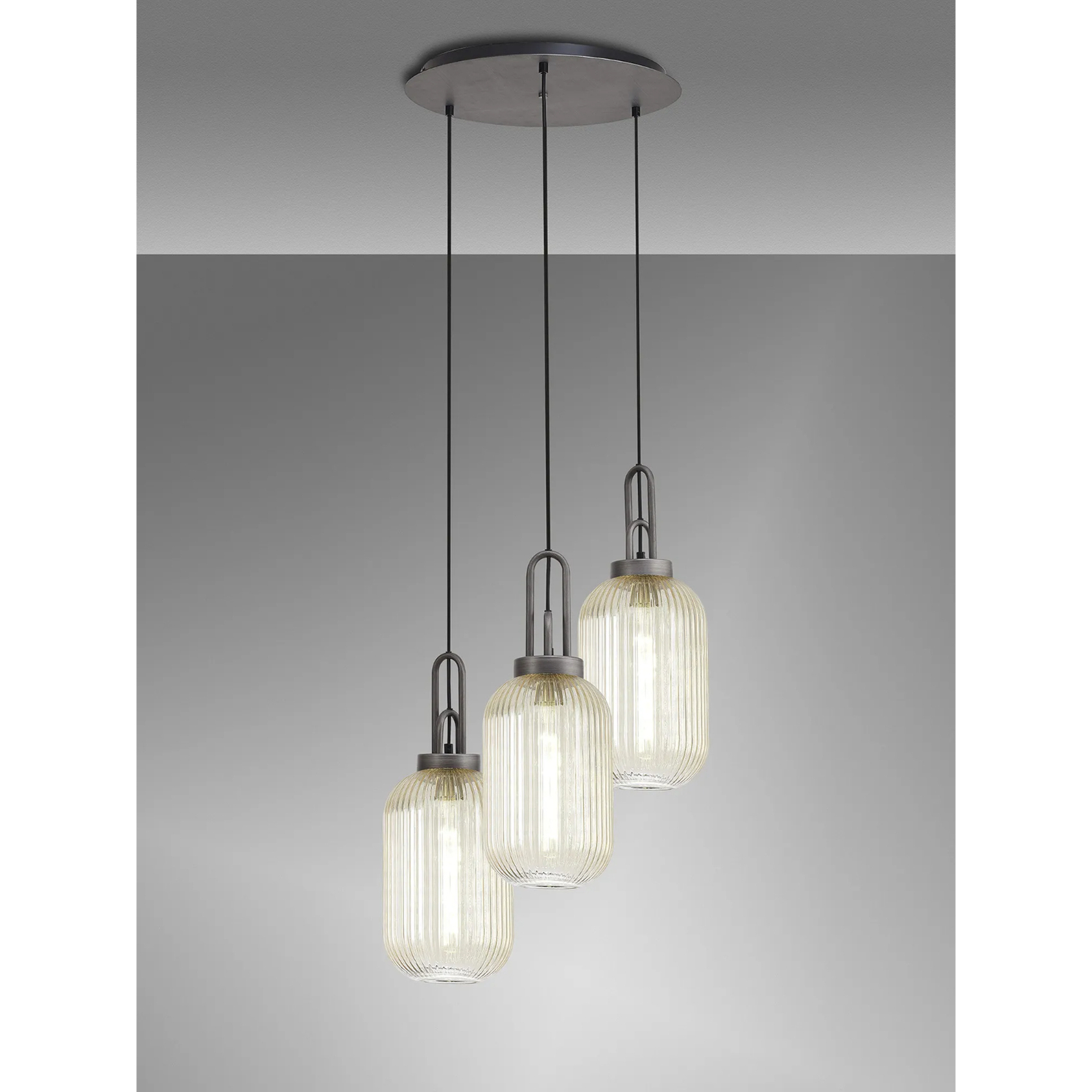 Idolite Camille Round 3 Light Pendant With 20cm Tubular Ribbed Glass, Aged Pewter/Matt Black Champagne | IDOK4870