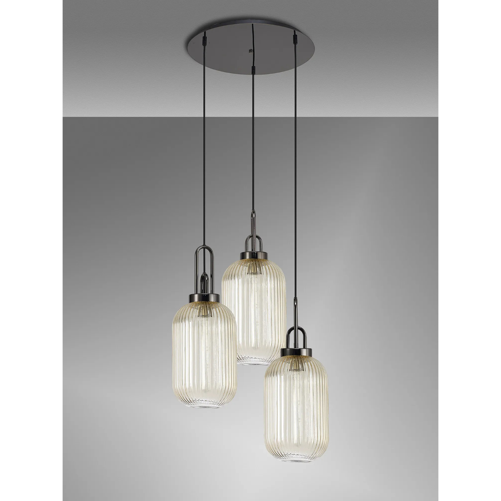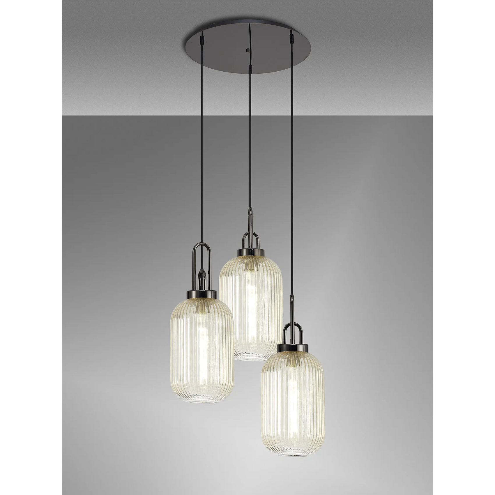 Idolite Camille Round 3 Light Pendant With 20cm Tubular Ribbed Glass, Black Chrome/Matt Black Champagne | IDOK2970