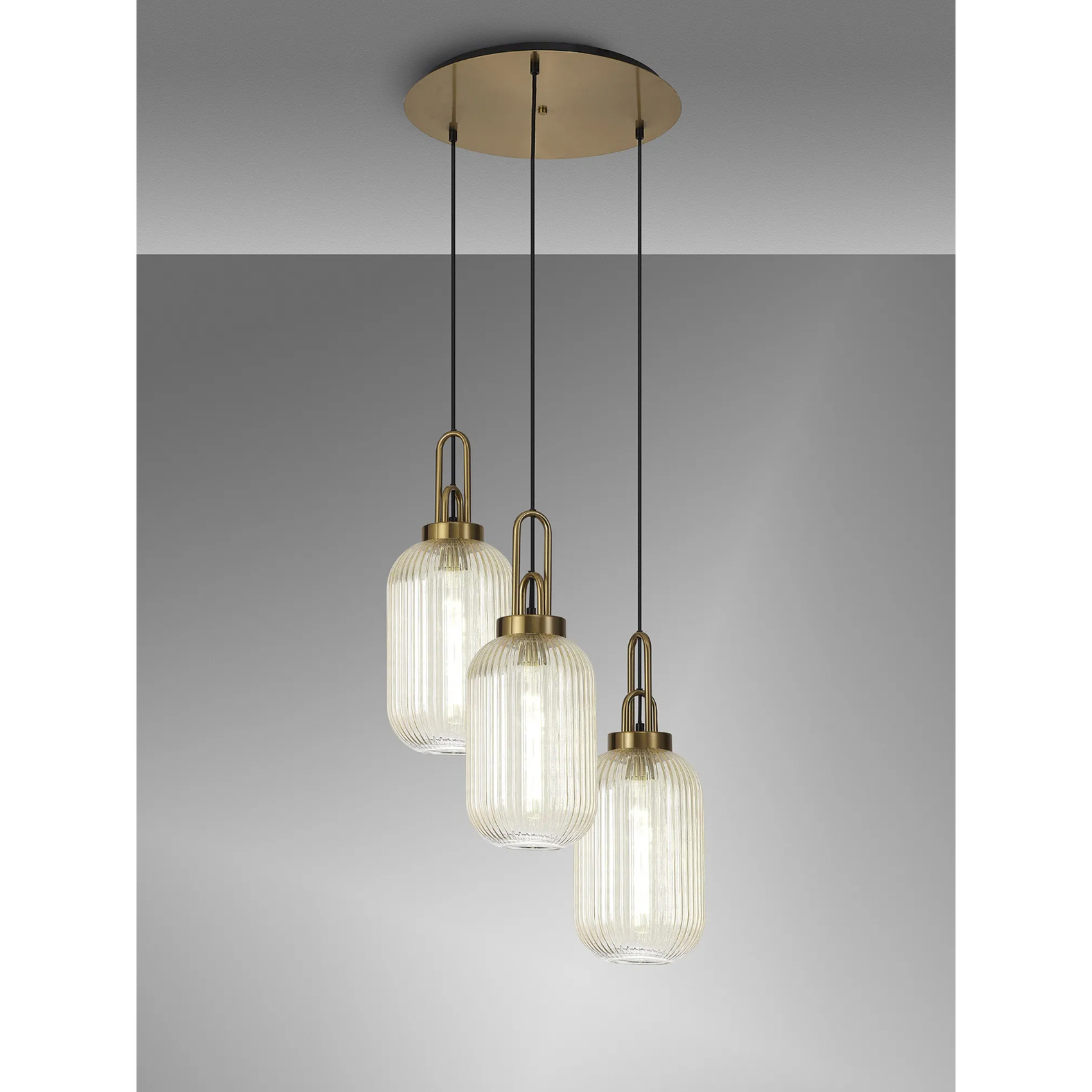Idolite Camille Round 3 Light Pendant With 20cm Tubular Ribbed Glass, Brass Gold/Matt Black Champagne | IDOK5970