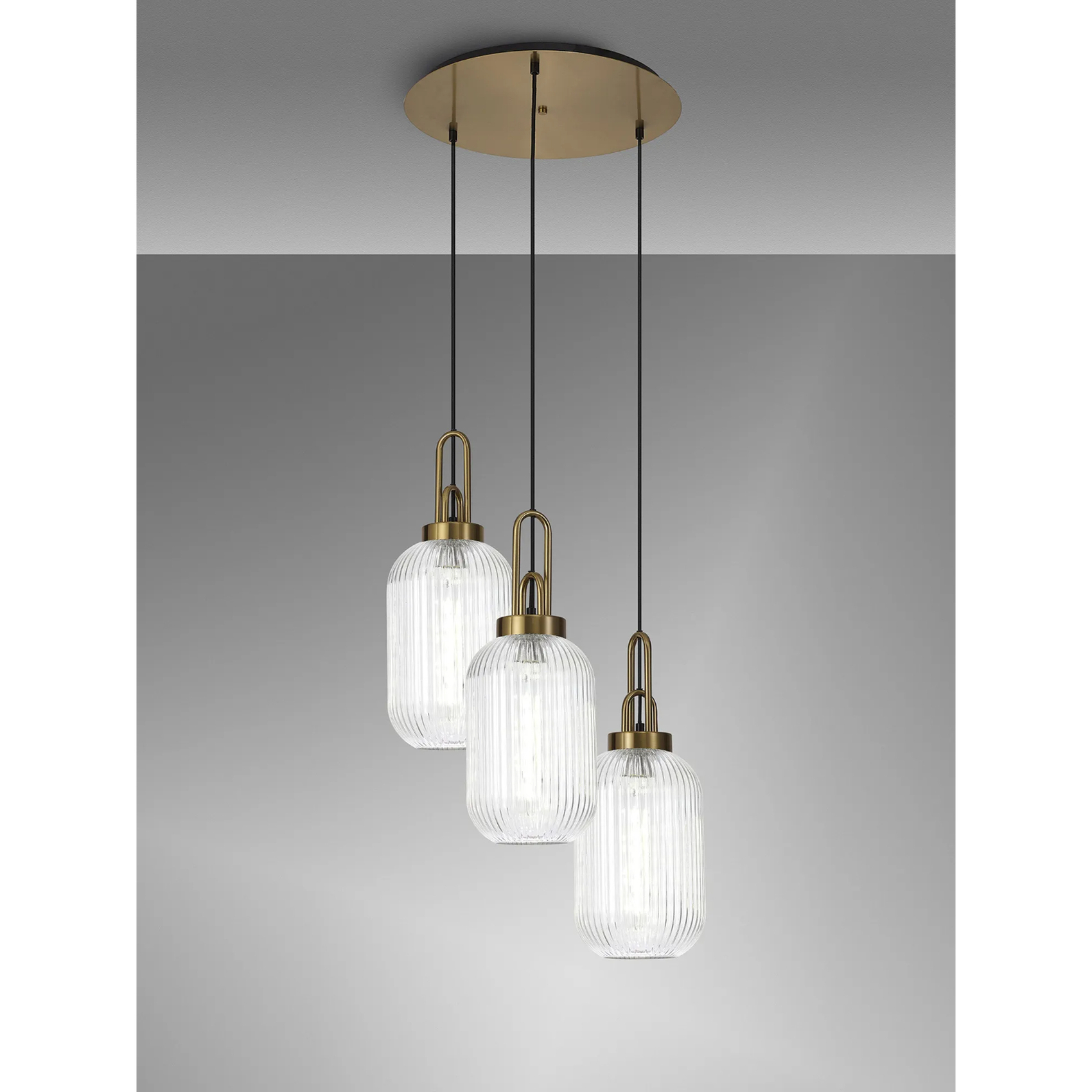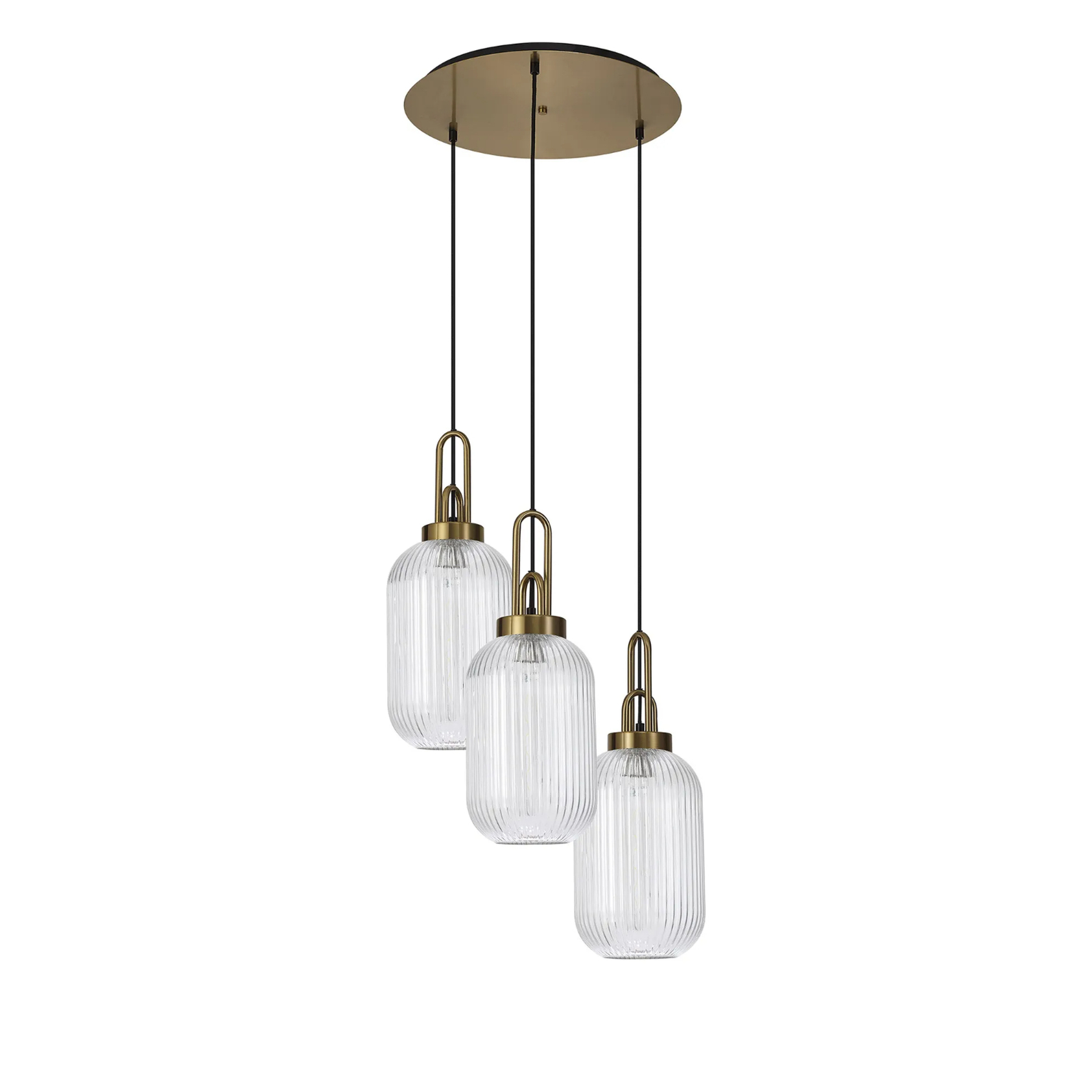 Idolite Camille Round 3 Light Pendant With 20cm Tubular Ribbed Glass, Brass Gold/Matt Black Clear | IDOK4570
