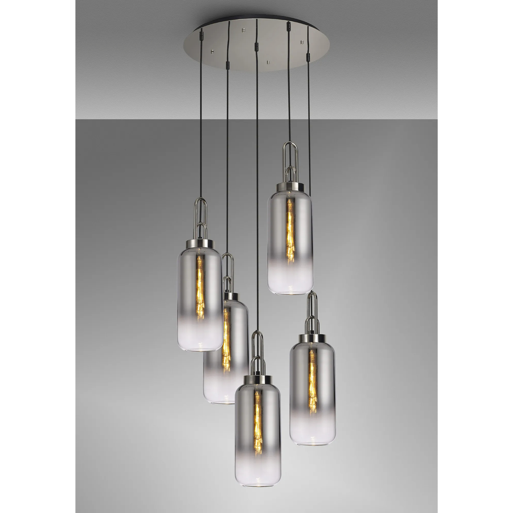 Idolite Camille Round 5 Light Pendant With 16cm Cylinder Glass, Polished Nickel/Matt Black Smoked/Clear | IDOK6460