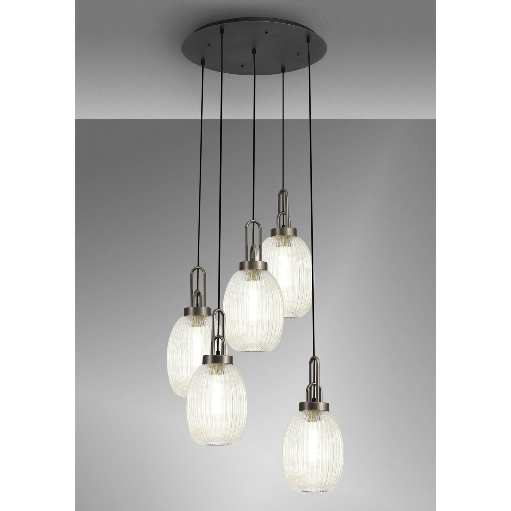 Idolite Camille Round 5 Light Pendant With 20cm Almond Ribbed Glass, Antique Silver/Matt Black Champagne | IDOK2580