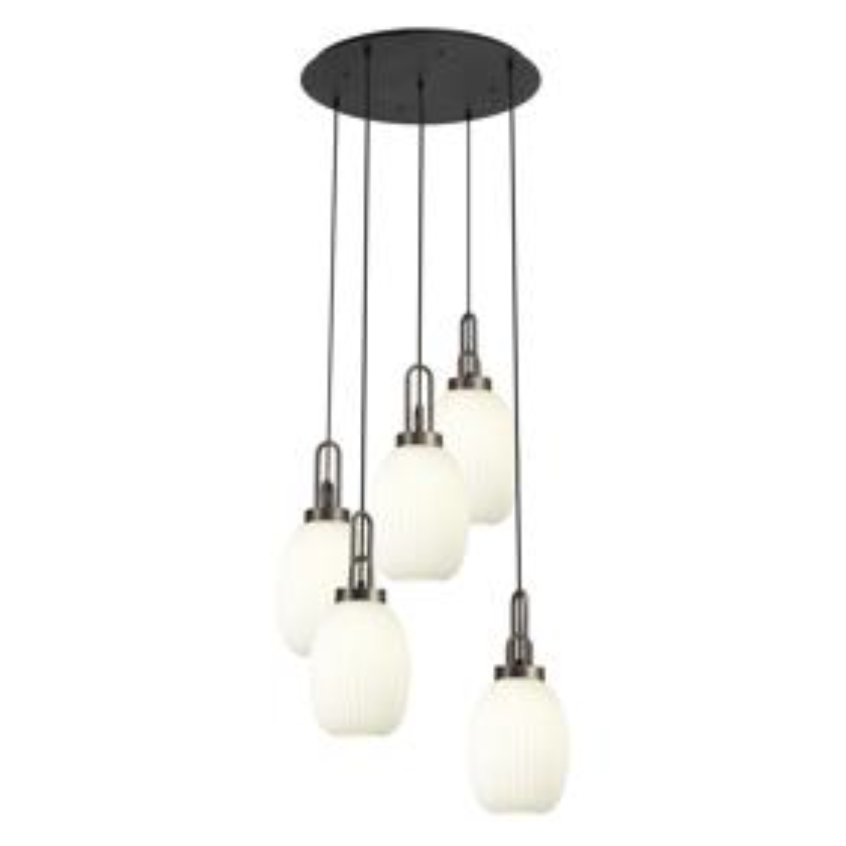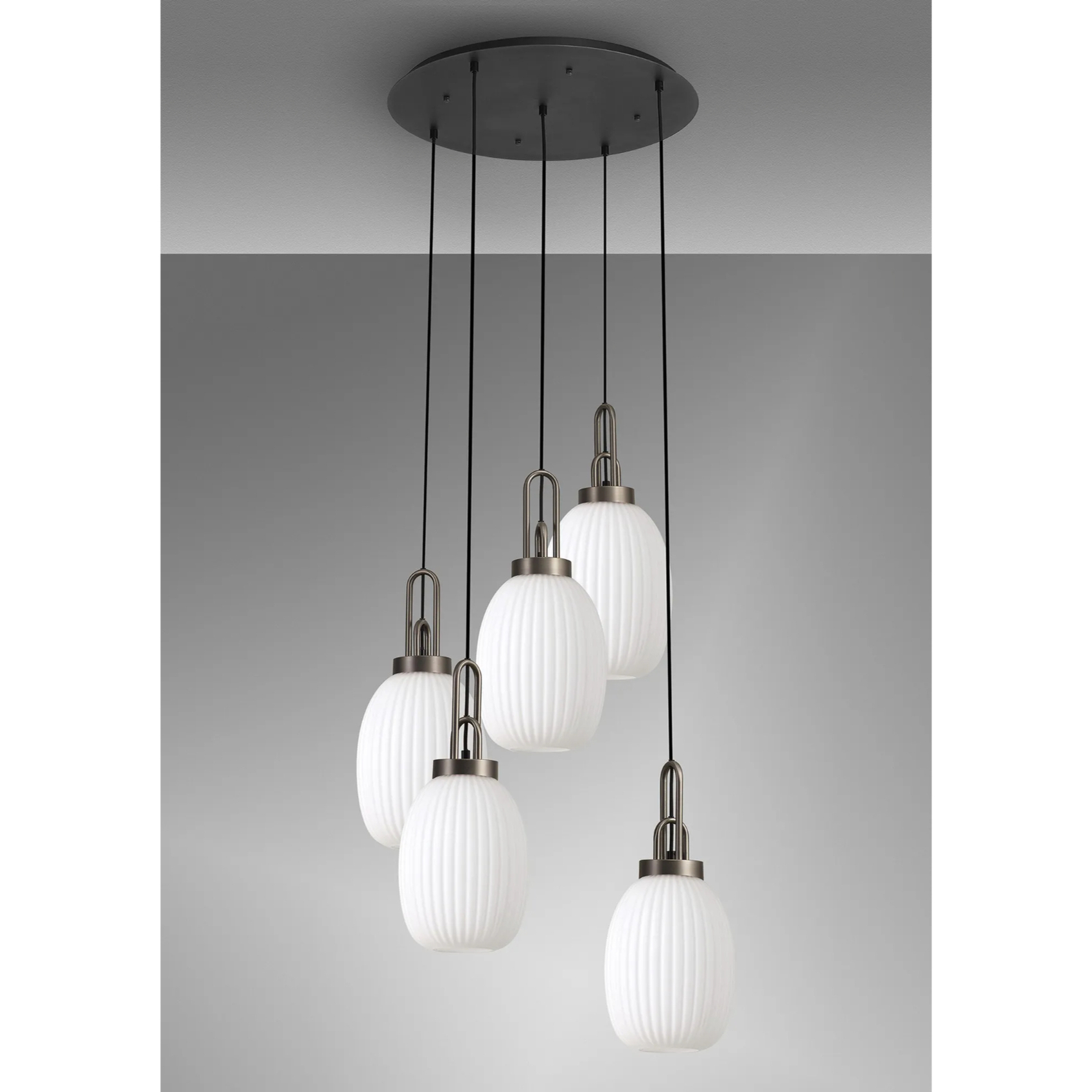 Idolite Camille Round 5 Light Pendant With 20cm Almond Ribbed Glass, Antique Silver/Matt Black Opal | IDOK3780