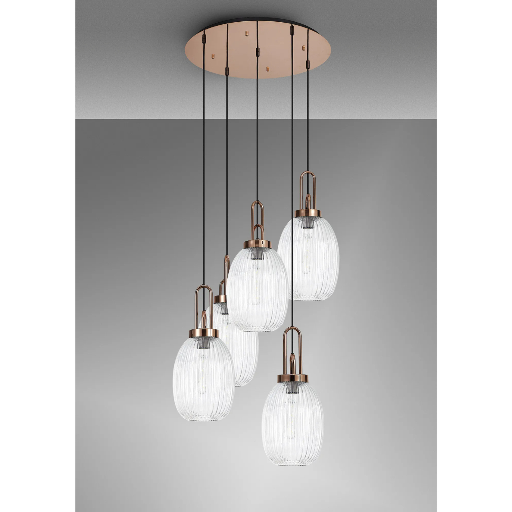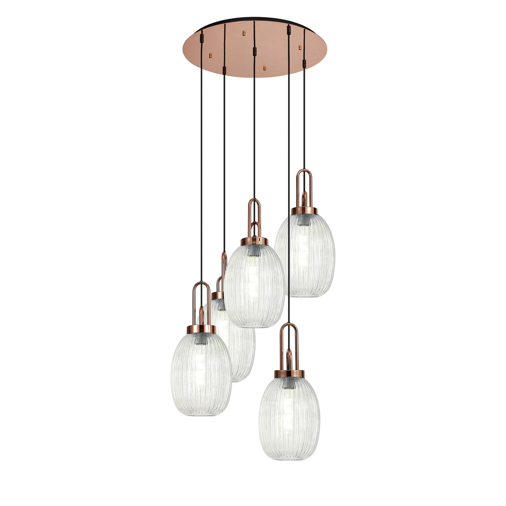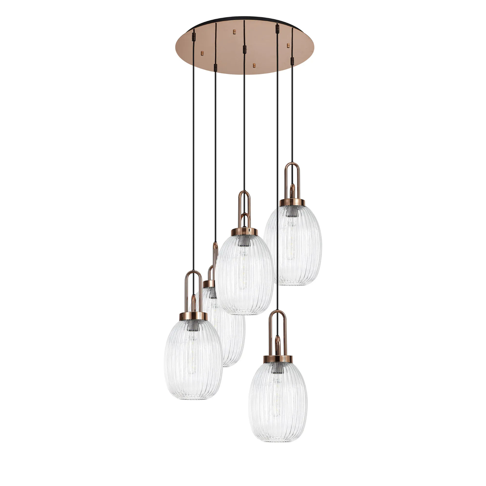 Idolite Camille Round 5 Light Pendant With 20cm Almond Ribbed Glass, Copper/Matt Black Clear | IDOK0280