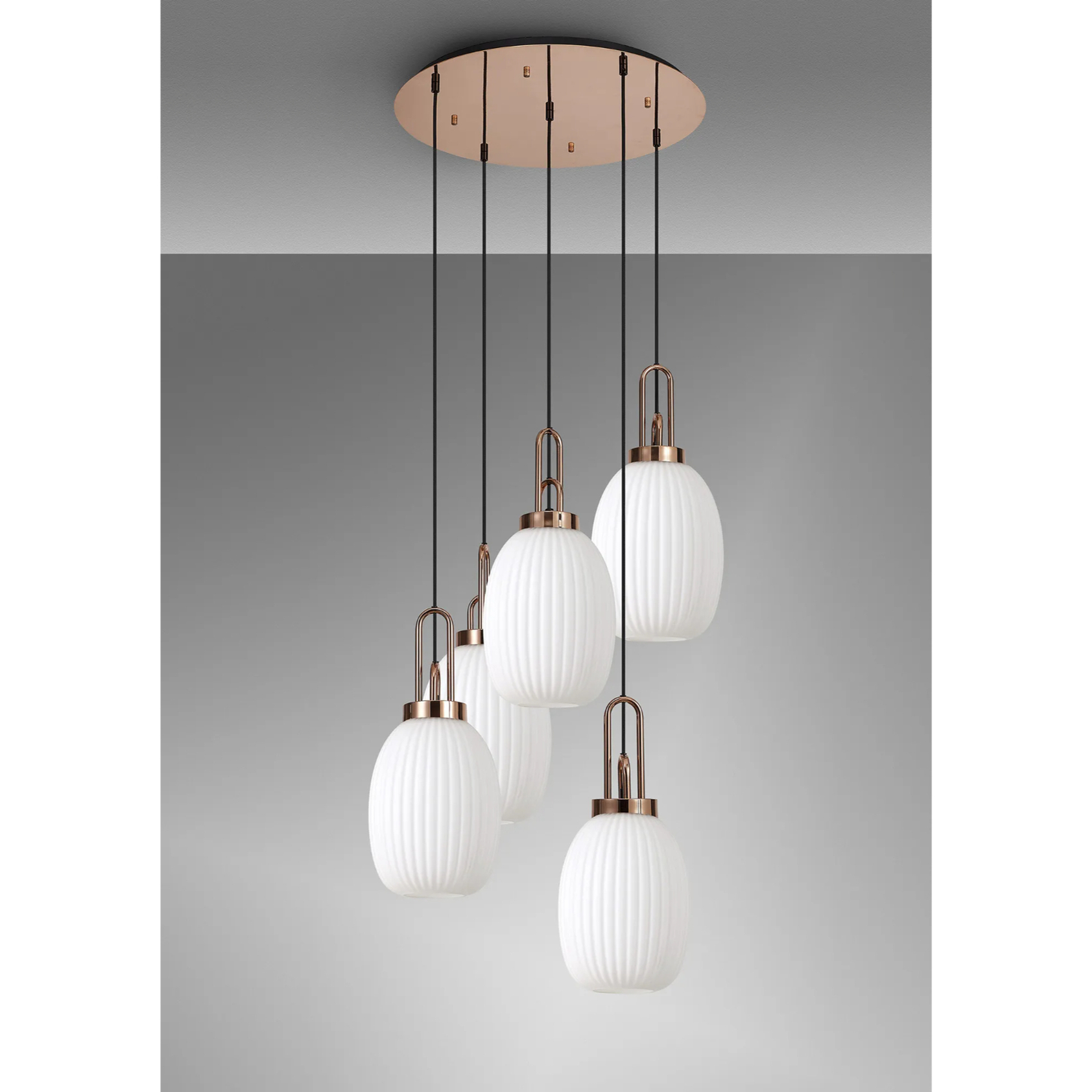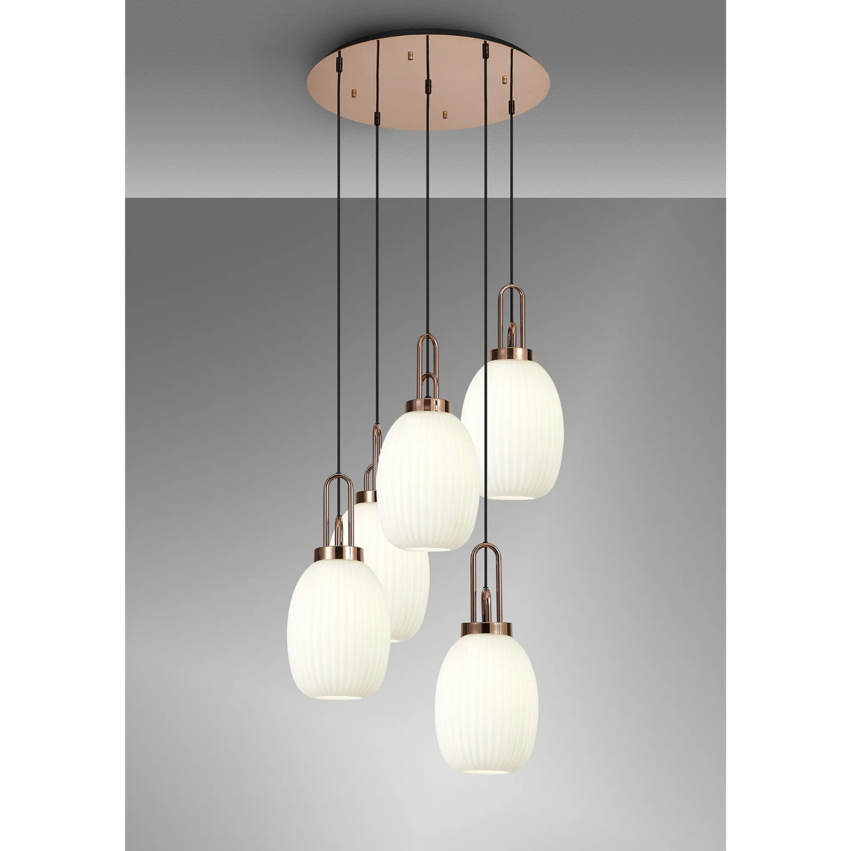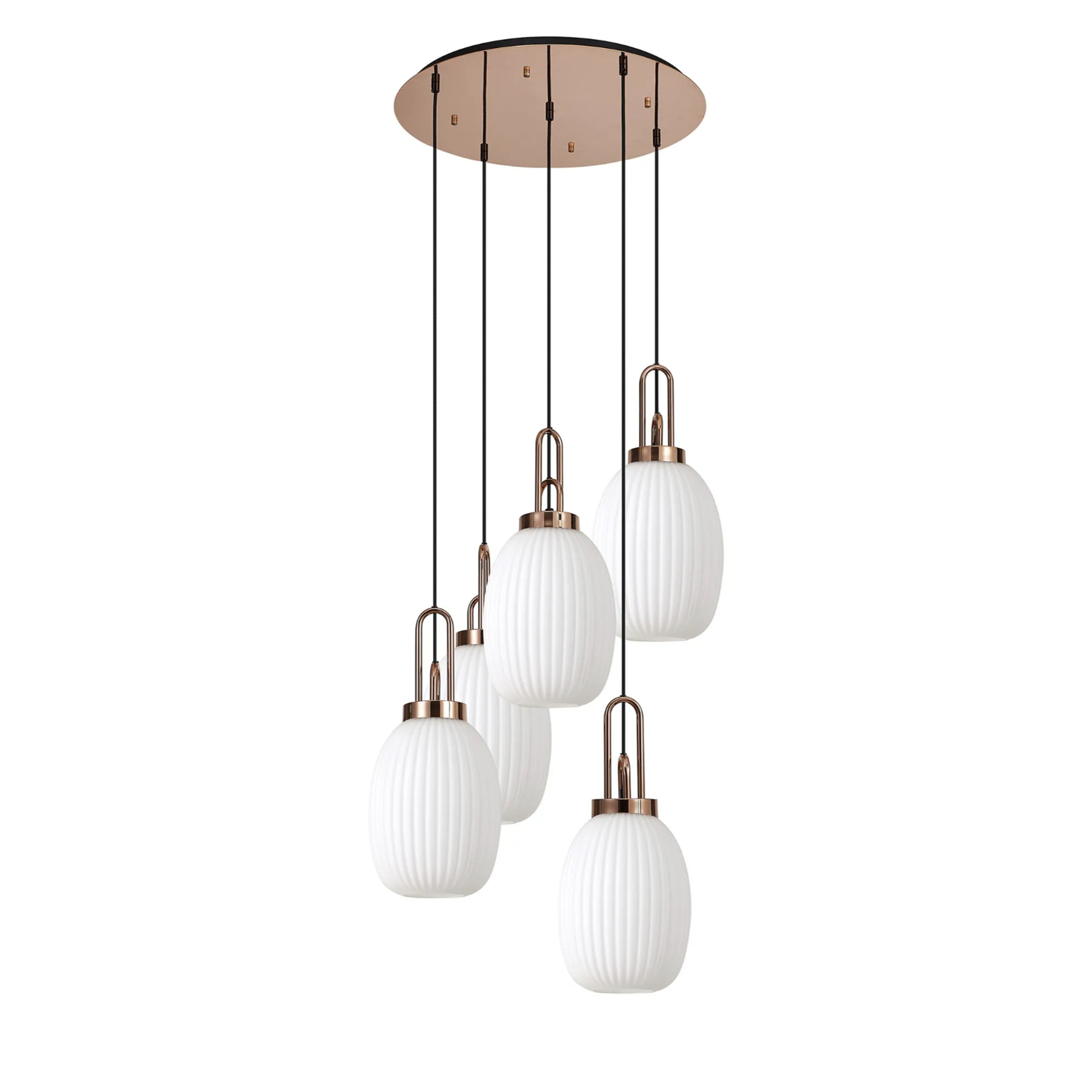 Idolite Camille Round 5 Light Pendant With 20cm Almond Ribbed Glass, Copper/Matt Black Opal | IDOK3880