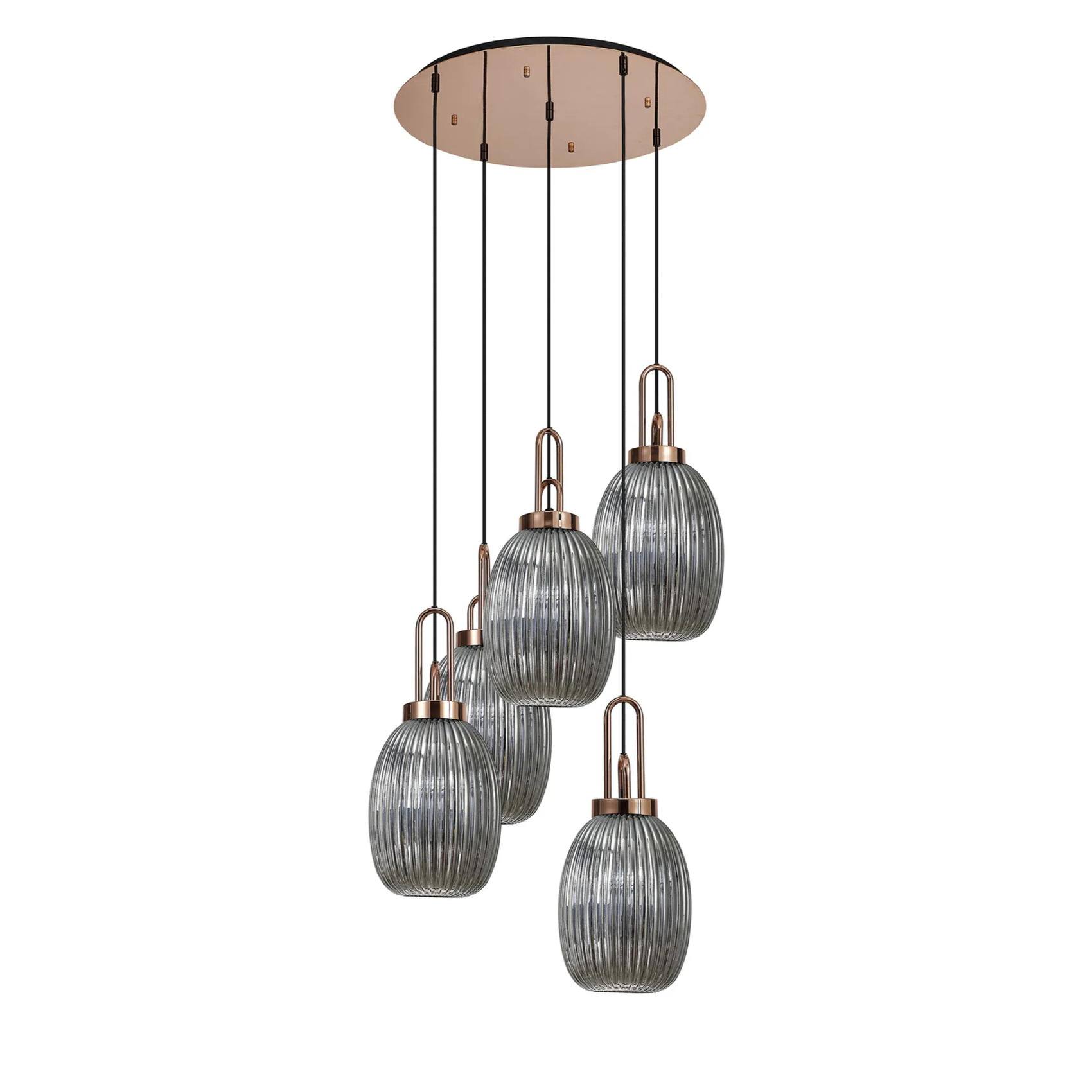 Idolite Camille Round 5 Light Pendant With 20cm Almond Ribbed Glass, Copper/Matt Black Smoked | IDOK1480