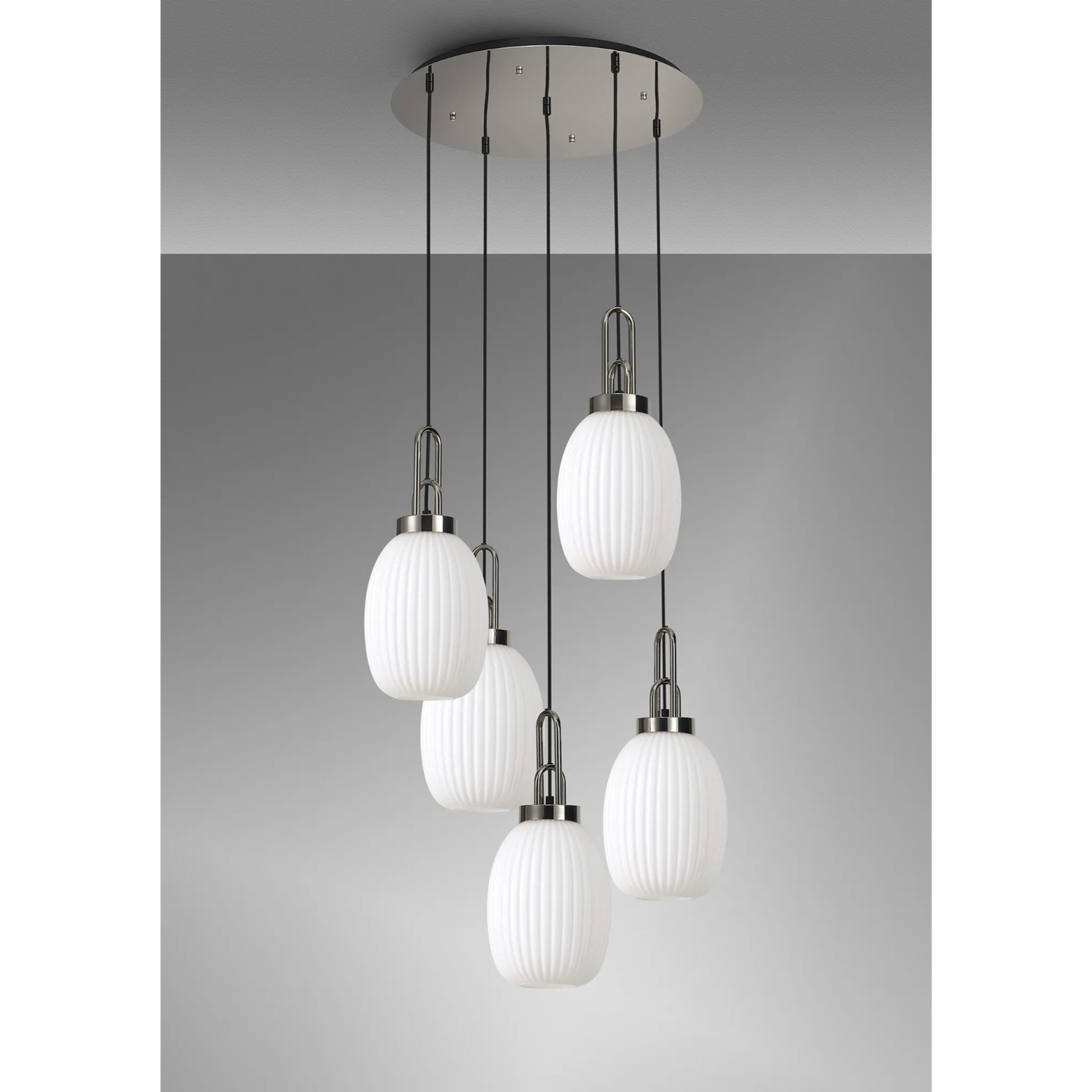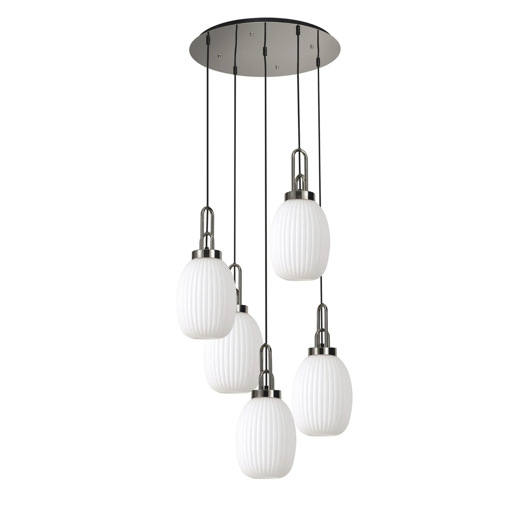 Idolite Camille Round 5 Light Pendant With 20cm Almond Ribbed Glass, Polished Nickel/Matt Black Opal | IDOK6880