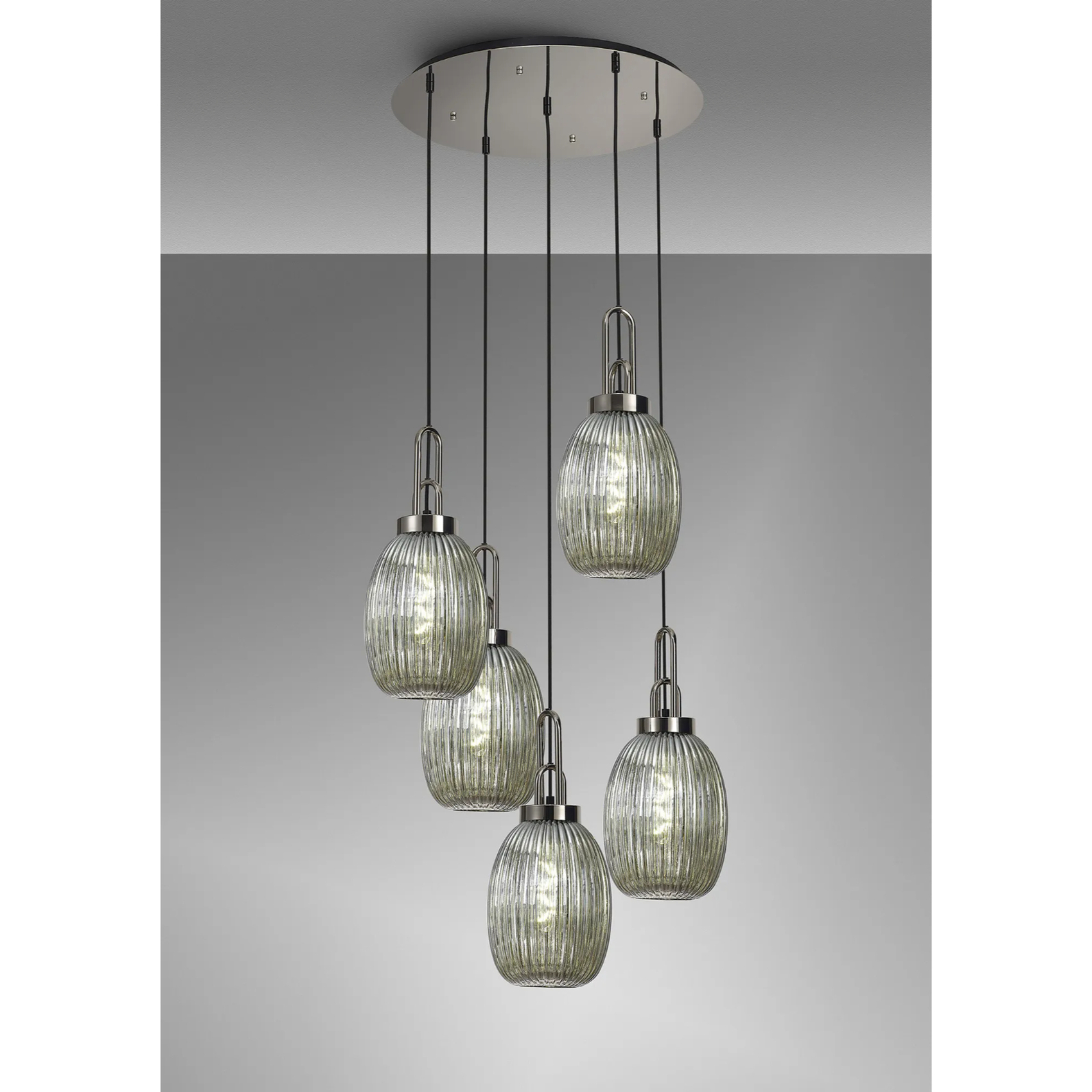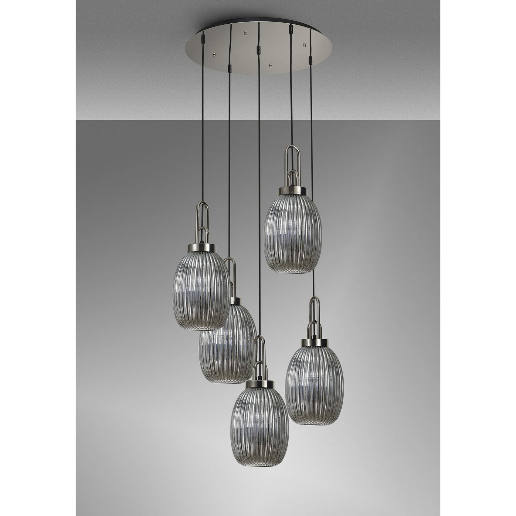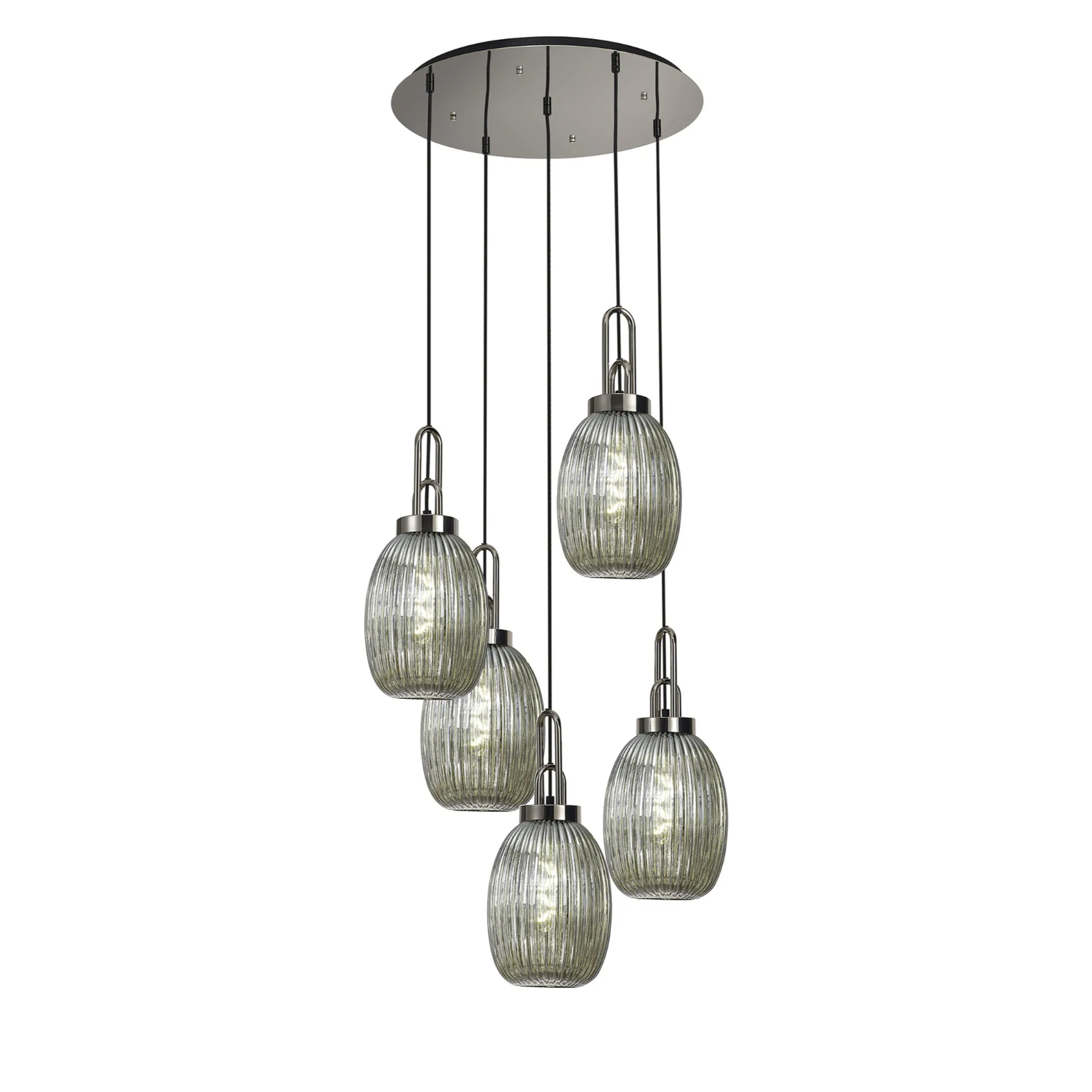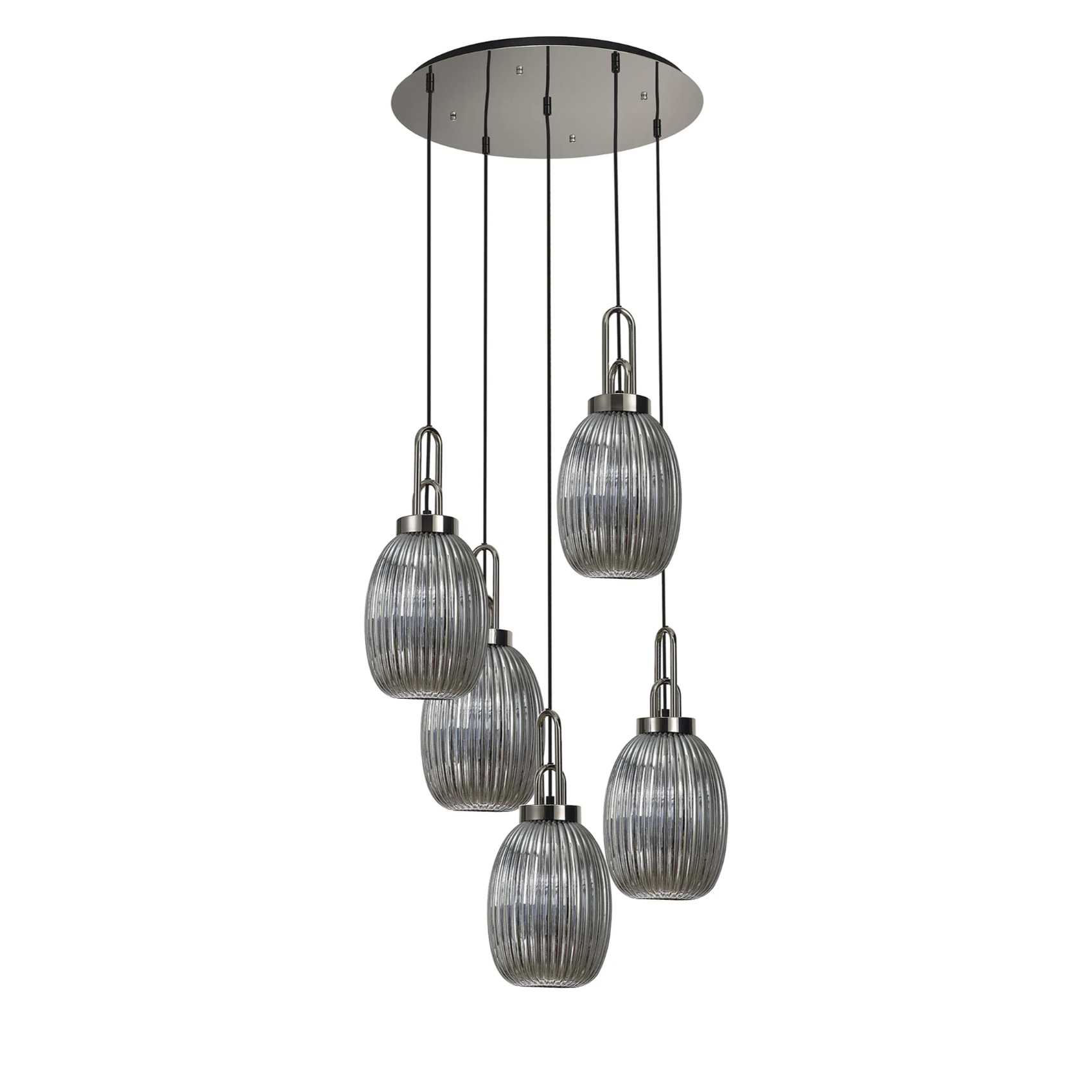 Idolite Camille Round 5 Light Pendant With 20cm Almond Ribbed Glass, Polished Nickel/Matt Black Smoked | IDOK4480