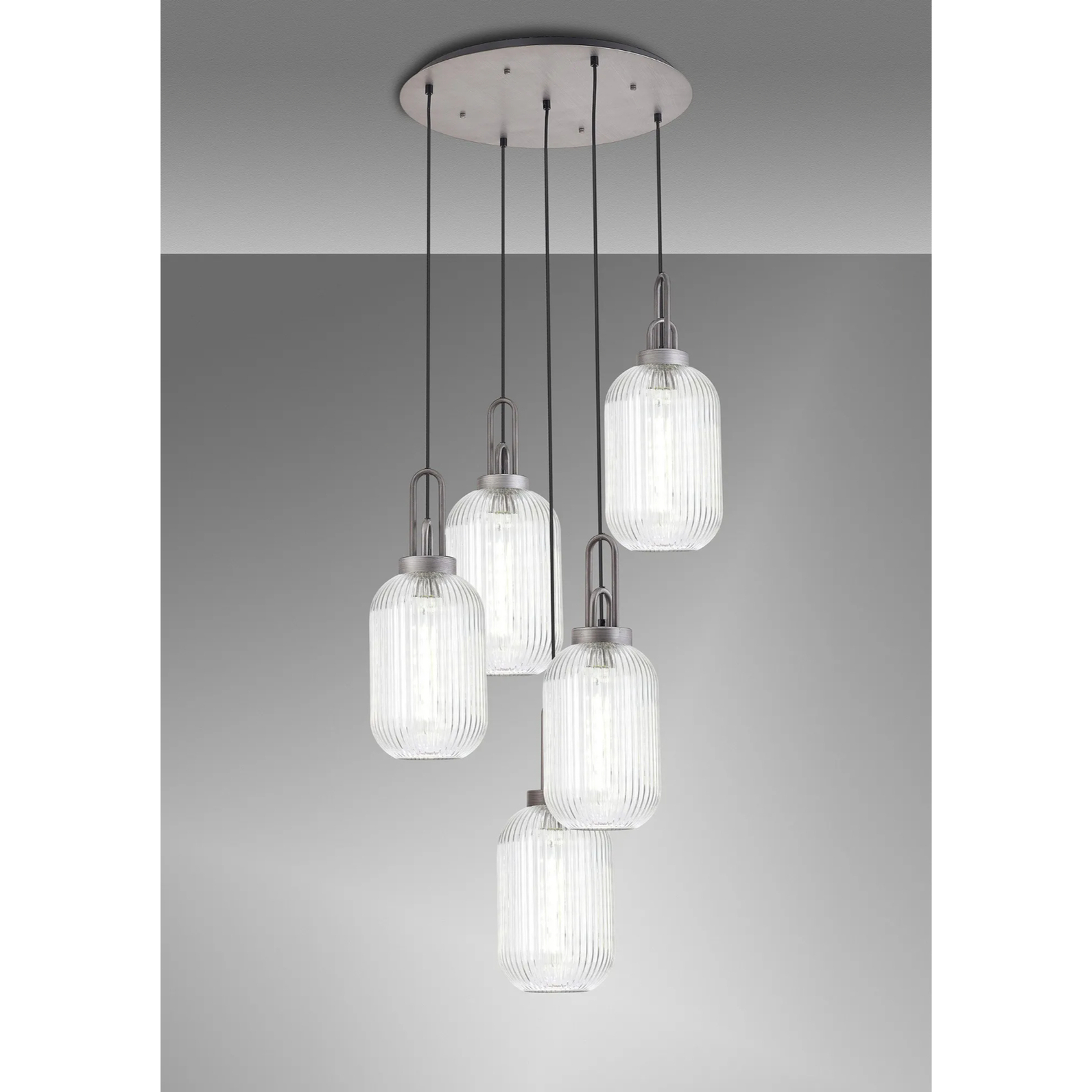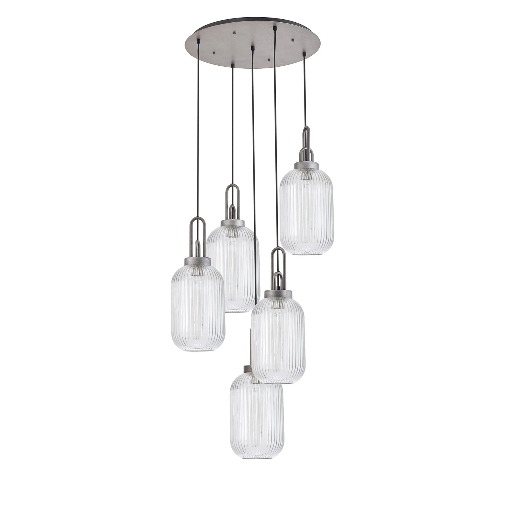 Idolite Camille Round 5 Light Pendant With 20cm Tubular Ribbed Glass, Aged Pewter/Matt Black Clear | IDOK4470