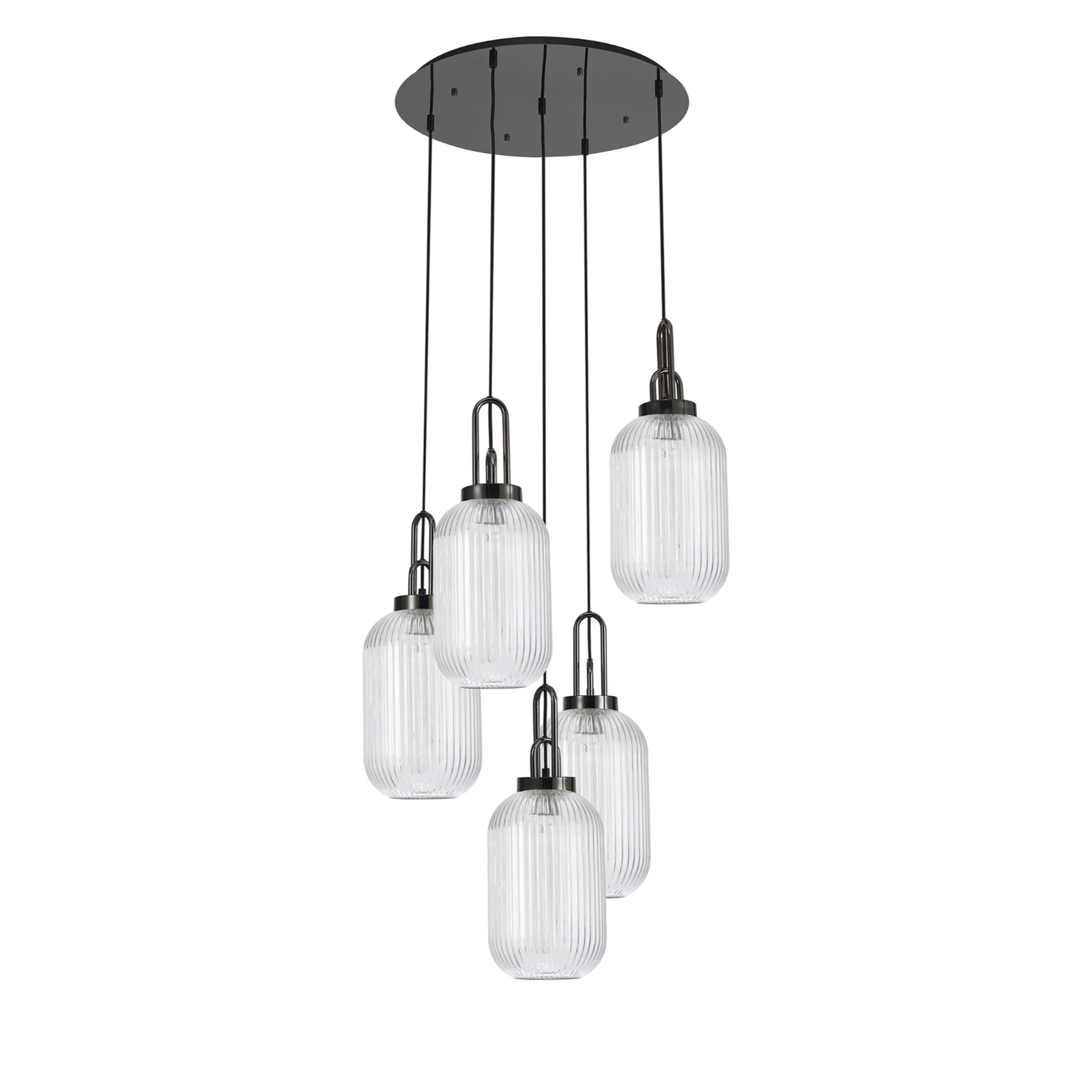 Idolite Camille Round 5 Light Pendant With 20cm Tubular Ribbed Glass, Black Chrome/Matt Black Clear | IDOK2570