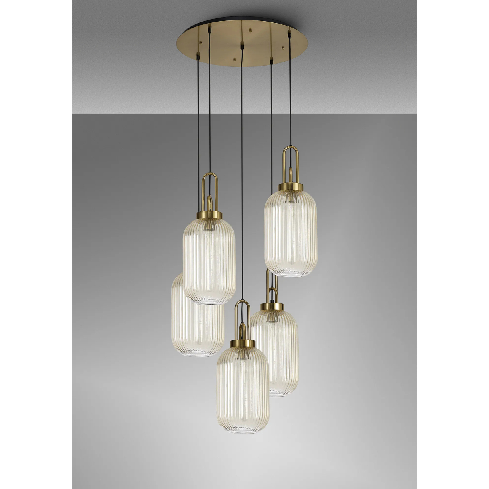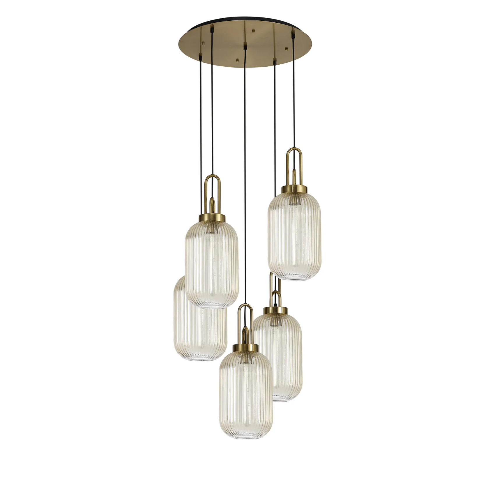 Idolite Camille Round 5 Light Pendant With 20cm Tubular Ribbed Glass, Brass Gold/Matt Black Champagne | IDOK6970